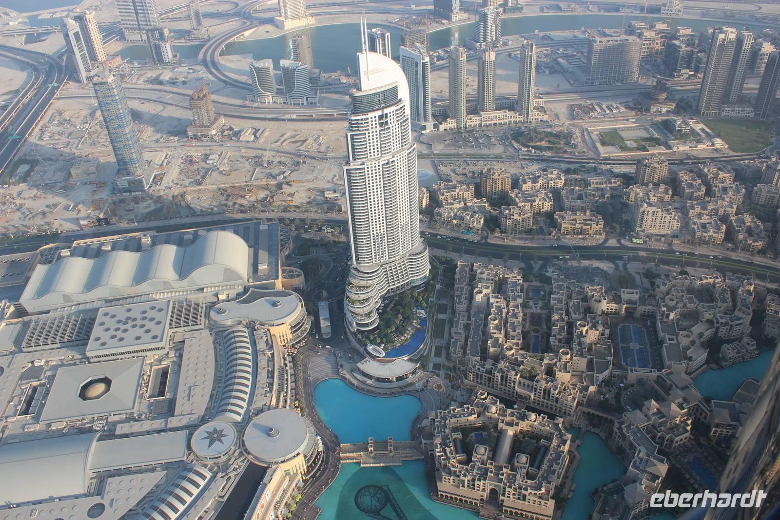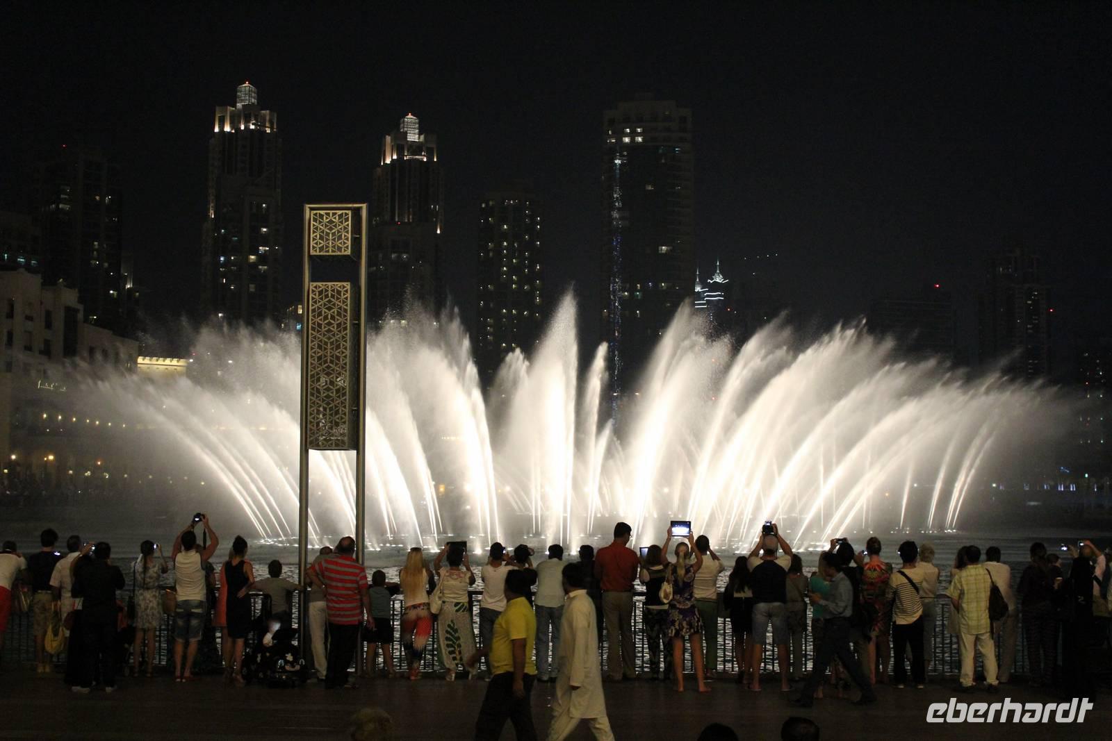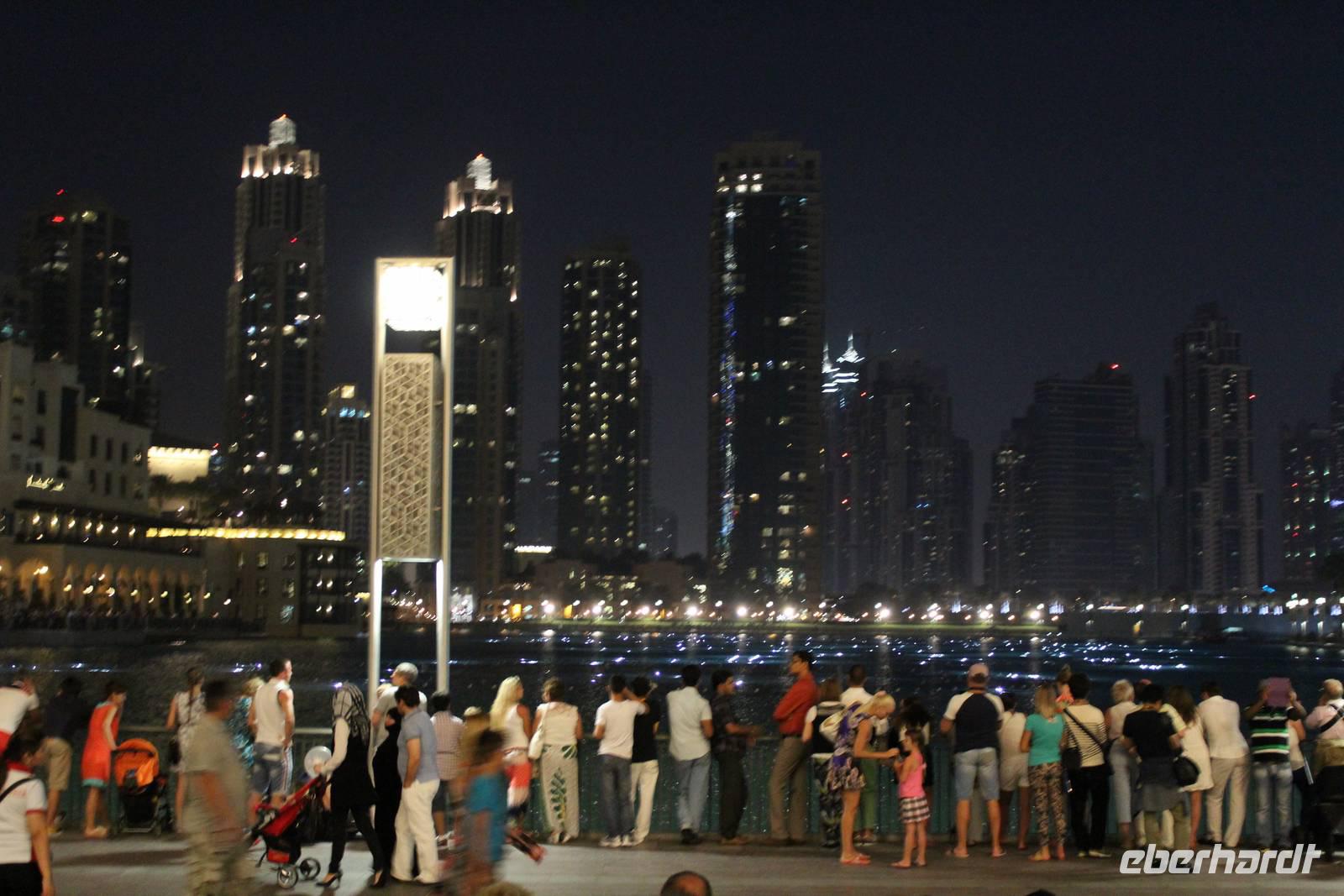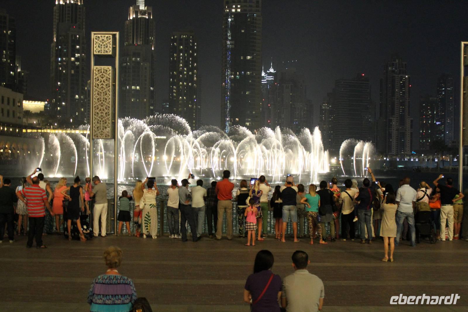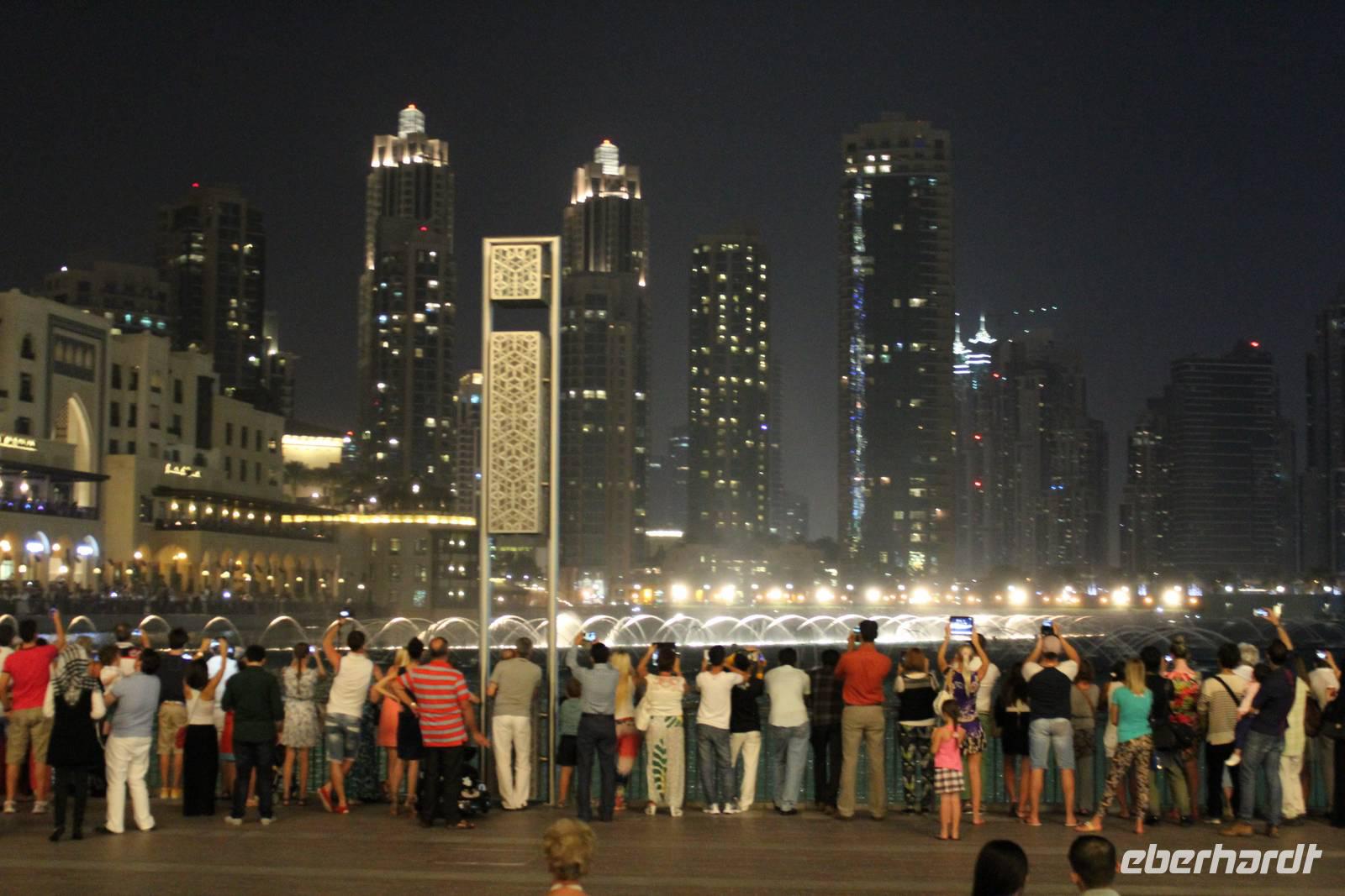 Vom Dubai Marina ging es zur größten Mall der Welt. Über 1200 Geschäfte, eine Eishalle, zwei große Aquarien, und vieles mehr konnte man hier sehen und bestaunen. Nach einem längeren Rundgang durch das Aquarium, durch den Zoo und überhaupt durch die Mall, war es dann auch soweit. Wir stellten uns für die Aussichtplattform auf dem größten Hochhaus der Erde an. Mit 10m die Sekunde fuhren wir die Etagen hinauf auf die 124te Etage. Leider war die Sicht nicht die allerbeste, dennoch hatten wir einen weiten Blick über Dubai. Um 18 Uhr waren wir dann alle draußen vor dem Burj Khalifa und bestaunten die Wasserspiele, das erste lief 18 Uhr, das andere 18:30 Uhr und beide gingen mind. 3 min. Danach fuhren wir von der Dubai Mall zu den Twin Towers wo wir unser Abendmahl auf der Terrasse genossen, mit einem wunderschönen Blick auf den Creek.