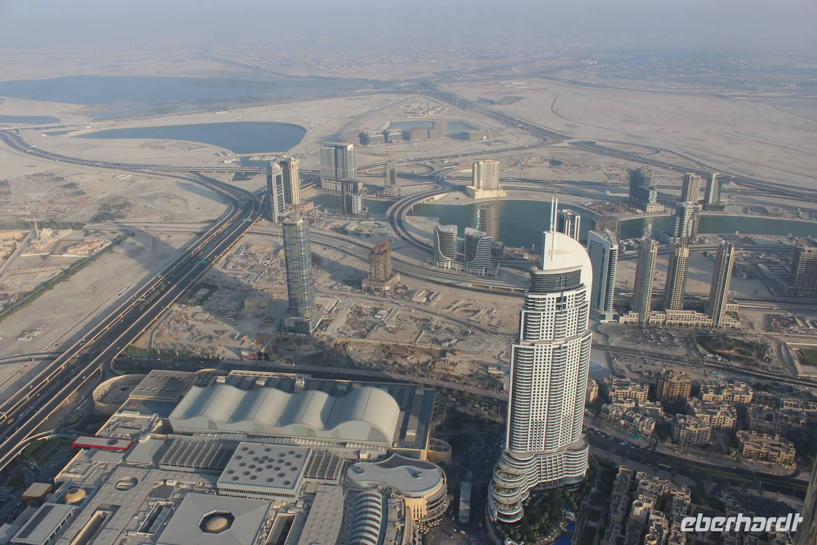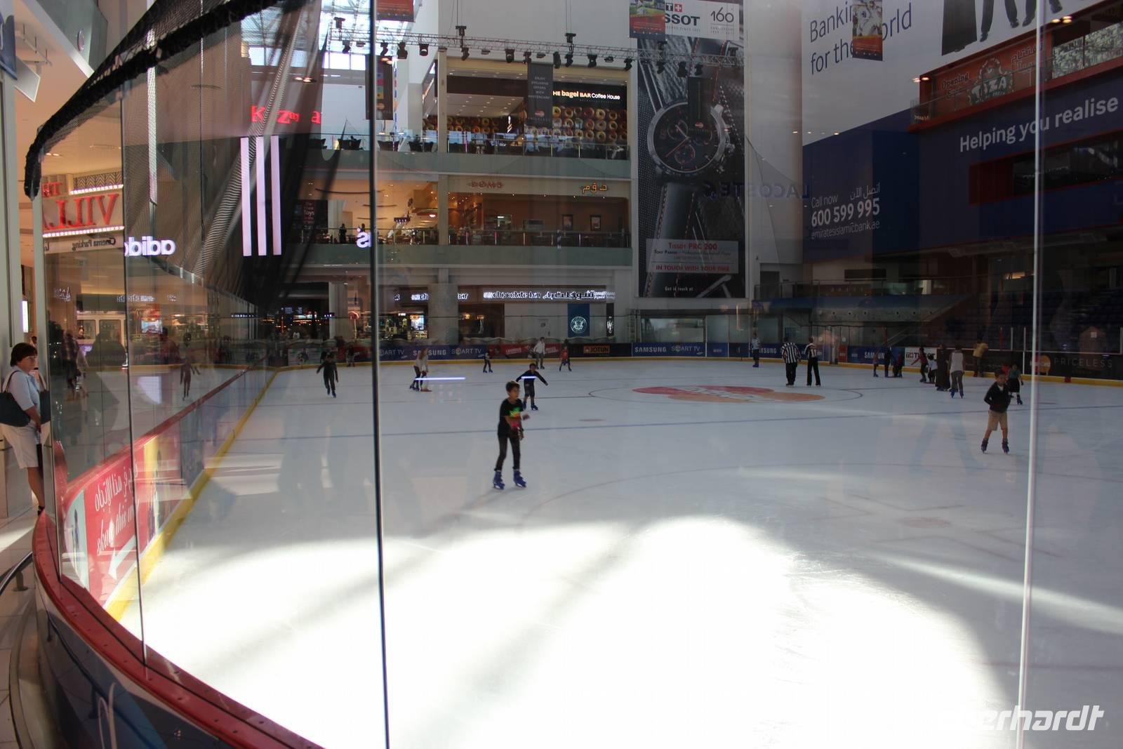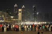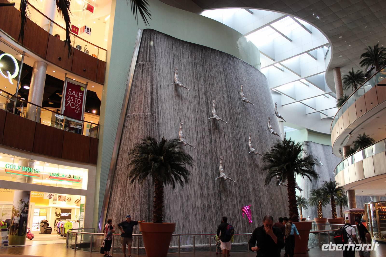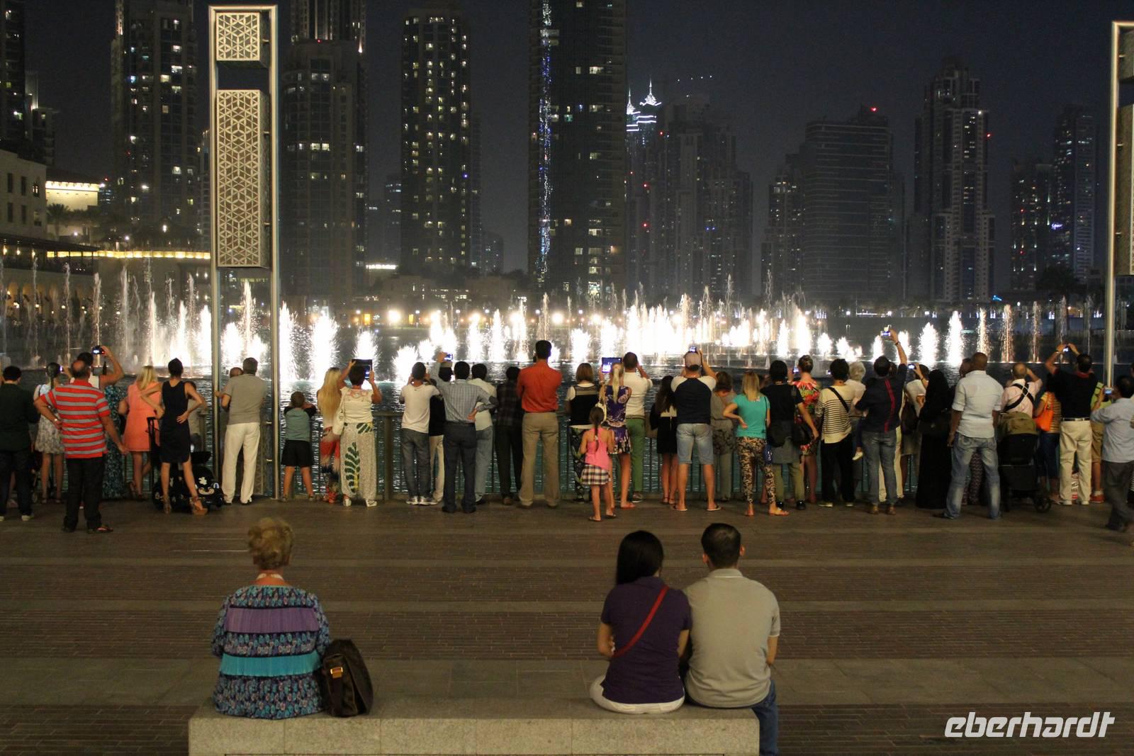 Vom Dubai Marina ging es zur größten Mall der Welt. Über 1200 Geschäfte, eine Eishalle, zwei große Aquarien, und vieles mehr konnte man hier sehen und bestaunen. Nach einem längeren Rundgang durch das Aquarium, durch den Zoo und überhaupt durch die Mall, war es dann auch soweit. Wir stellten uns für die Aussichtplattform auf dem größten Hochhaus der Erde an. Mit 10m die Sekunde fuhren wir die Etagen hinauf auf die 124te Etage. Leider war die Sicht nicht die allerbeste, dennoch hatten wir einen weiten Blick über Dubai. Um 18 Uhr waren wir dann alle draußen vor dem Burj Khalifa und bestaunten die Wasserspiele, das erste lief 18 Uhr, das andere 18:30 Uhr und beide gingen mind. 3 min. Danach fuhren wir von der Dubai Mall zu den Twin Towers wo wir unser Abendmahl auf der Terrasse genossen, mit einem wunderschönen Blick auf den Creek.