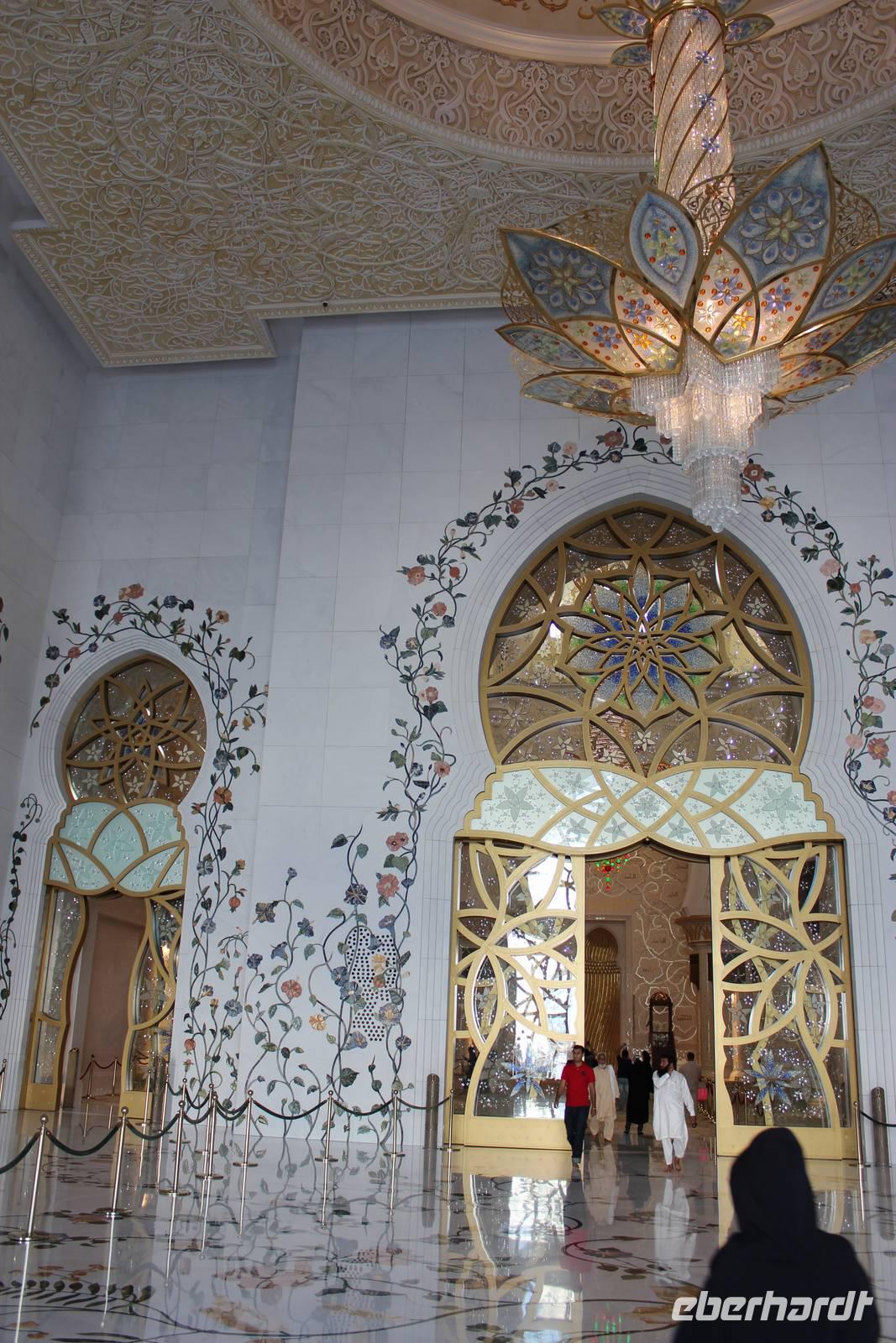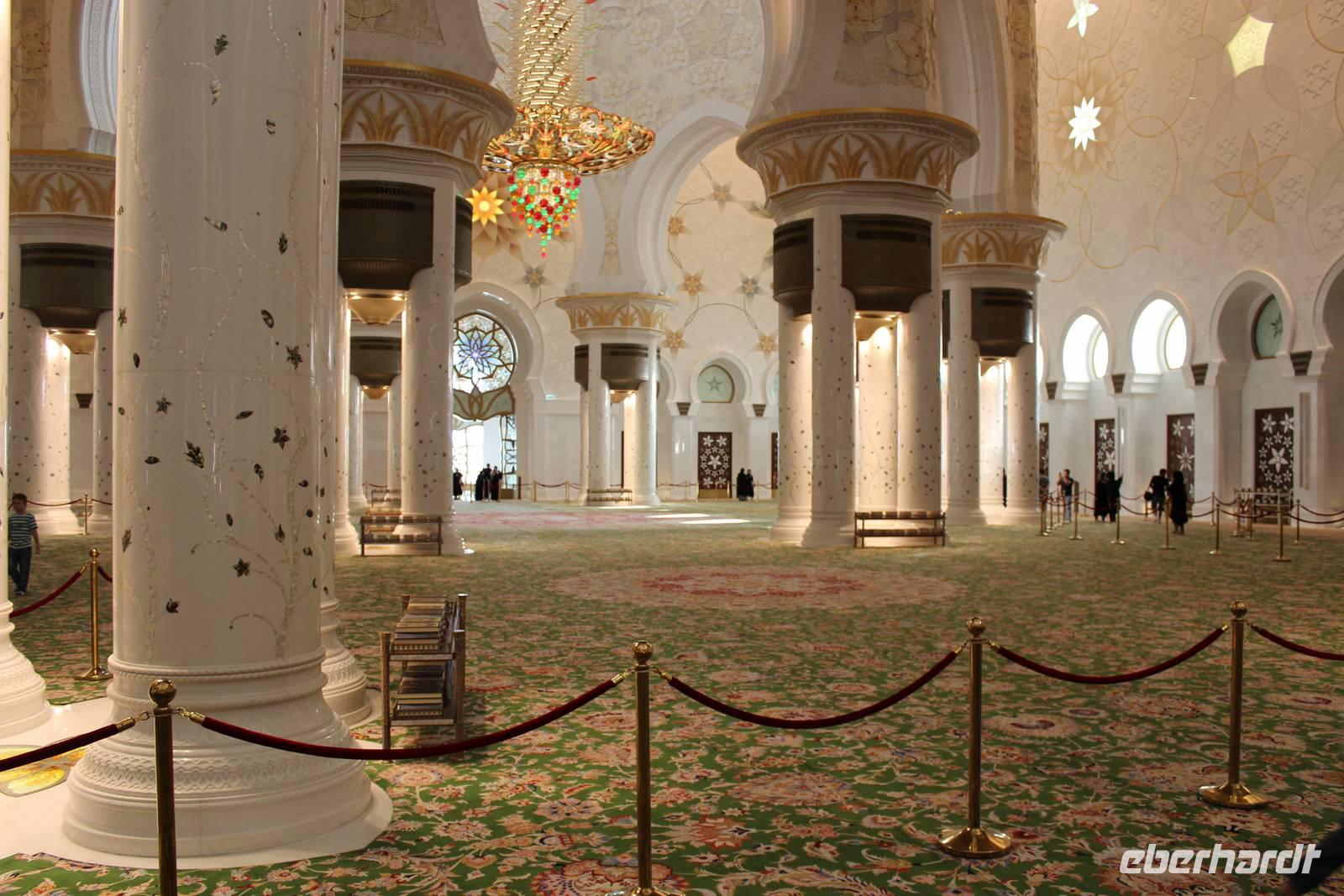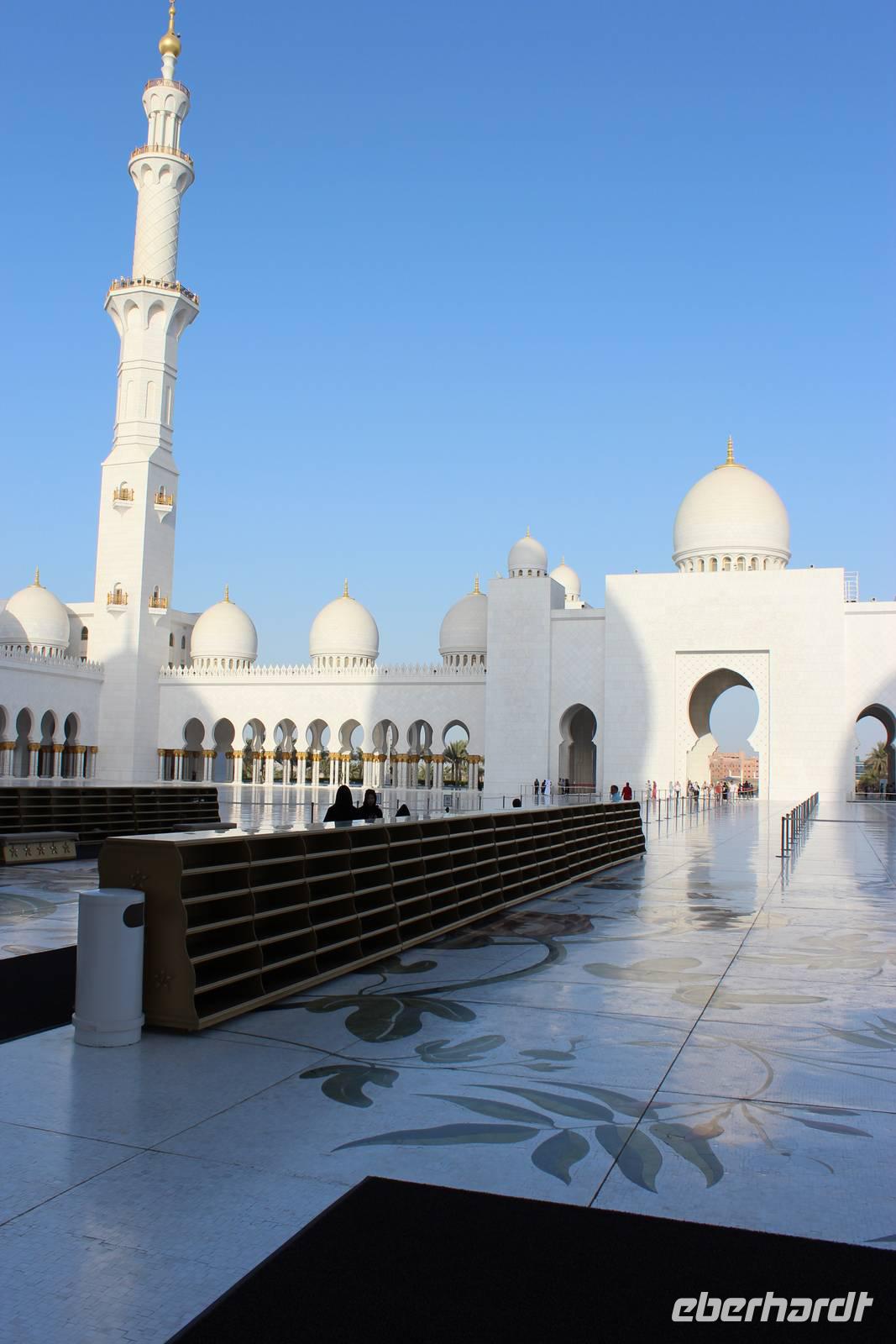Wir fuhren dann zu unserem letzten Ereignis, zur Mohammed Zayed Moschee, der größten Moschee der Welt. Die weißen Steine wurden aus Indien angeliefert und sind das gleiche Material wie beim Taj Mahal, die drei großen Kronleuchter wurden in Deutschland angefertigt und der Teppich wurde von mehr als 1000 Arbeiterinnen handgeknüpft.