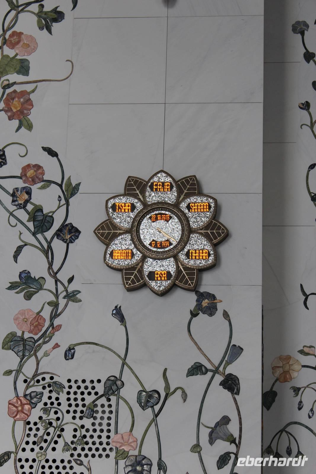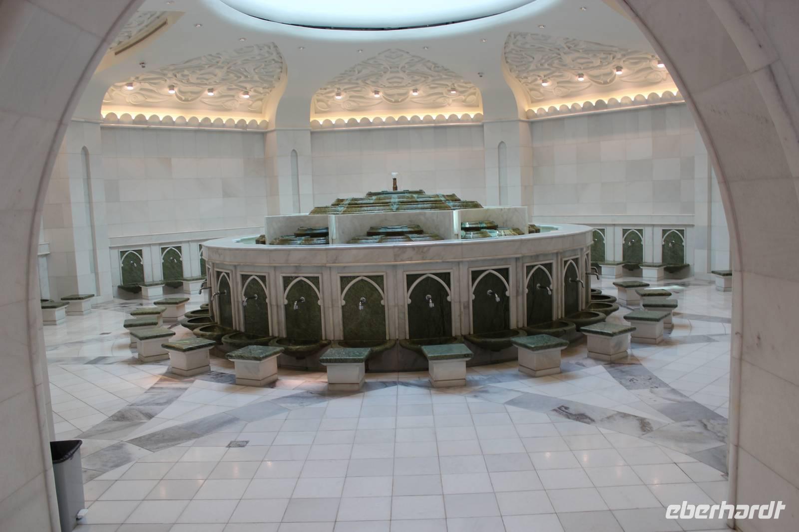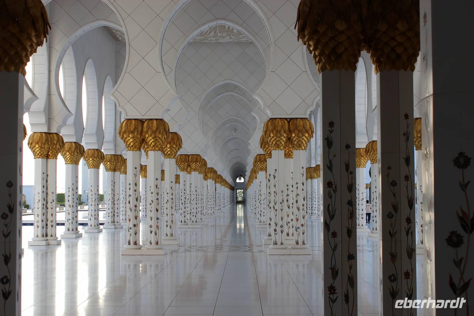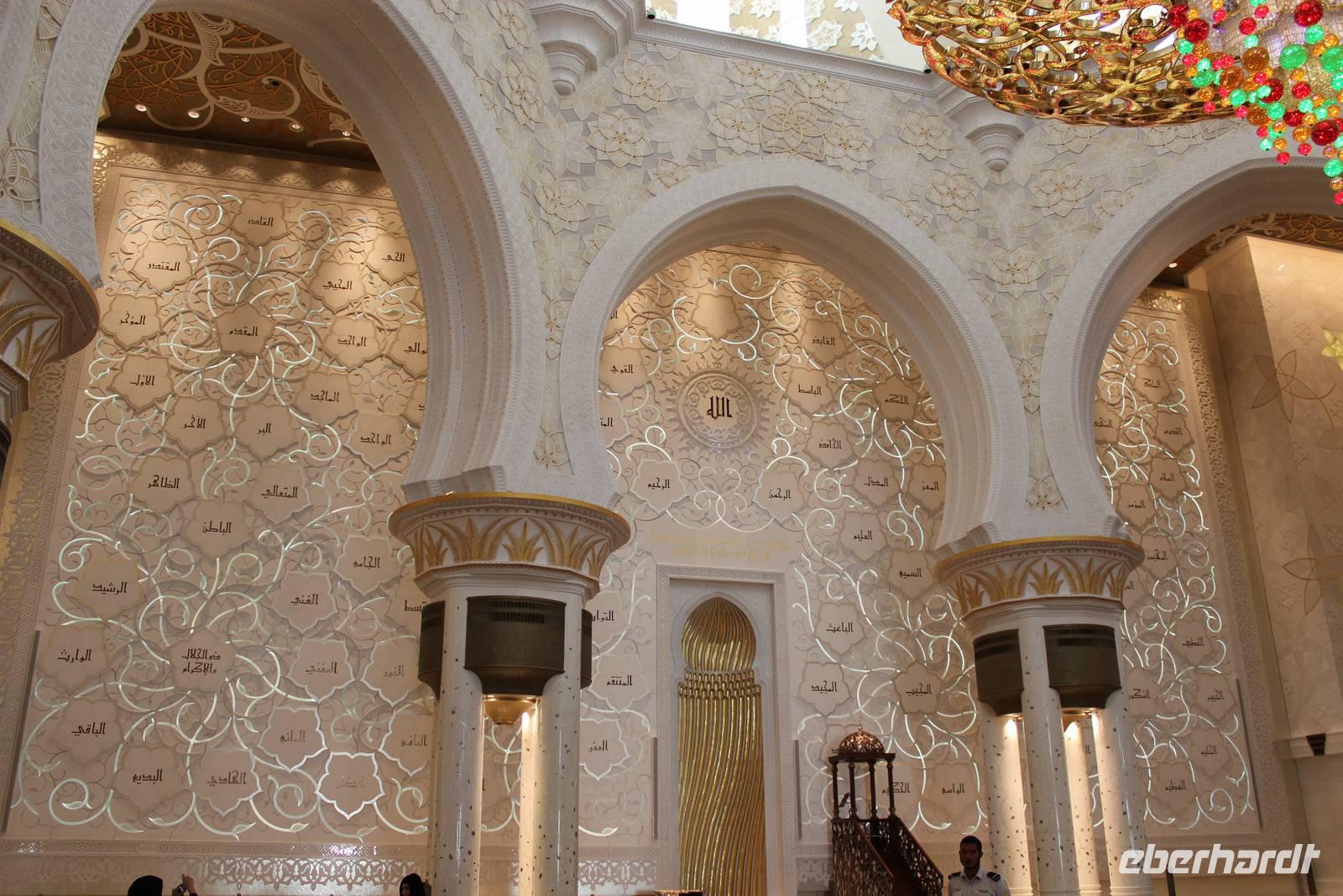 Wir fuhren dann zu unserem letzten Ereignis, zur Mohammed Zayed Moschee, der größten Moschee der Welt. Die weißen Steine wurden aus Indien angeliefert und sind das gleiche Material wie beim Taj Mahal, die drei großen Kronleuchter wurden in Deutschland angefertigt und der Teppich wurde von mehr als 1000 Arbeiterinnen handgeknüpft.