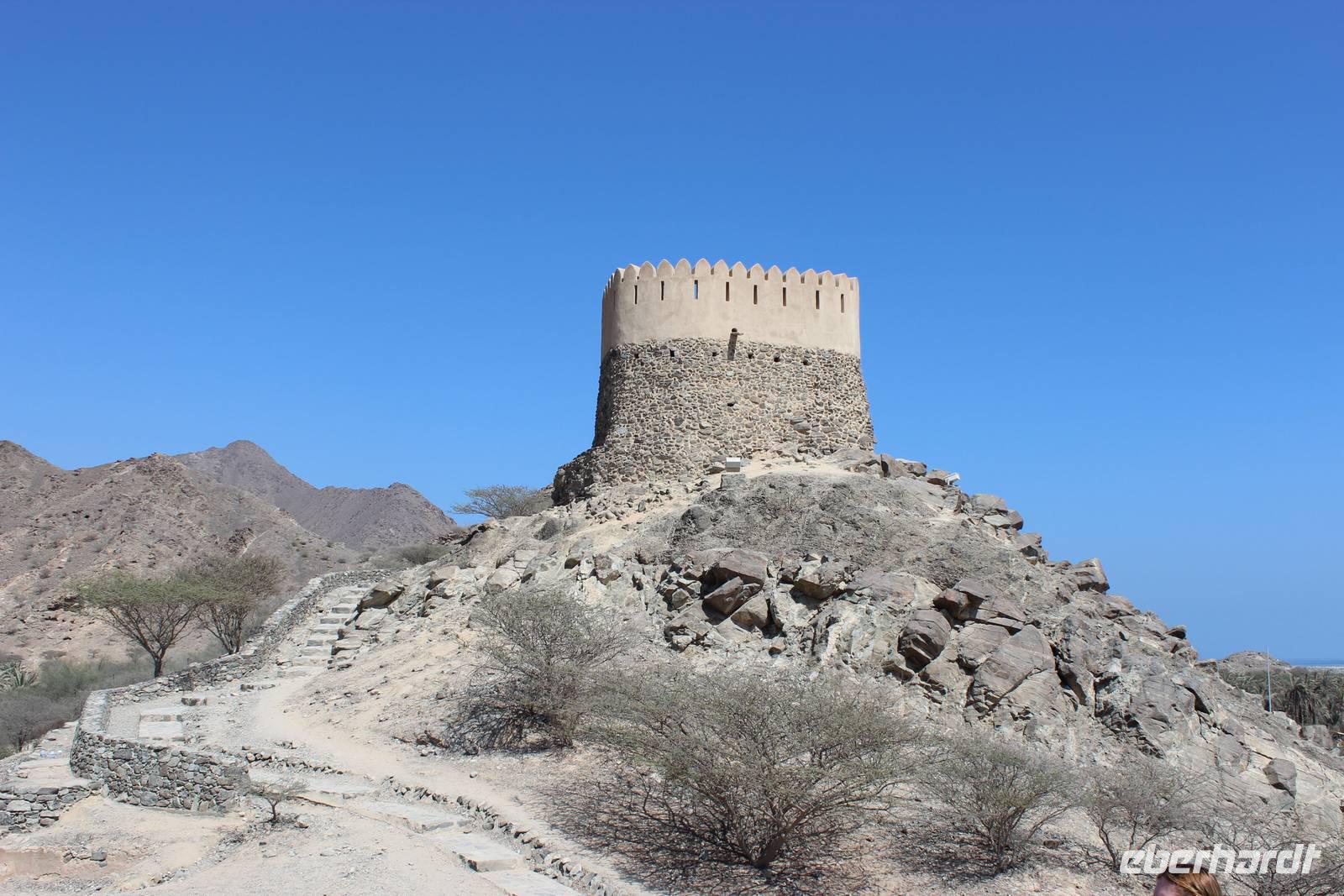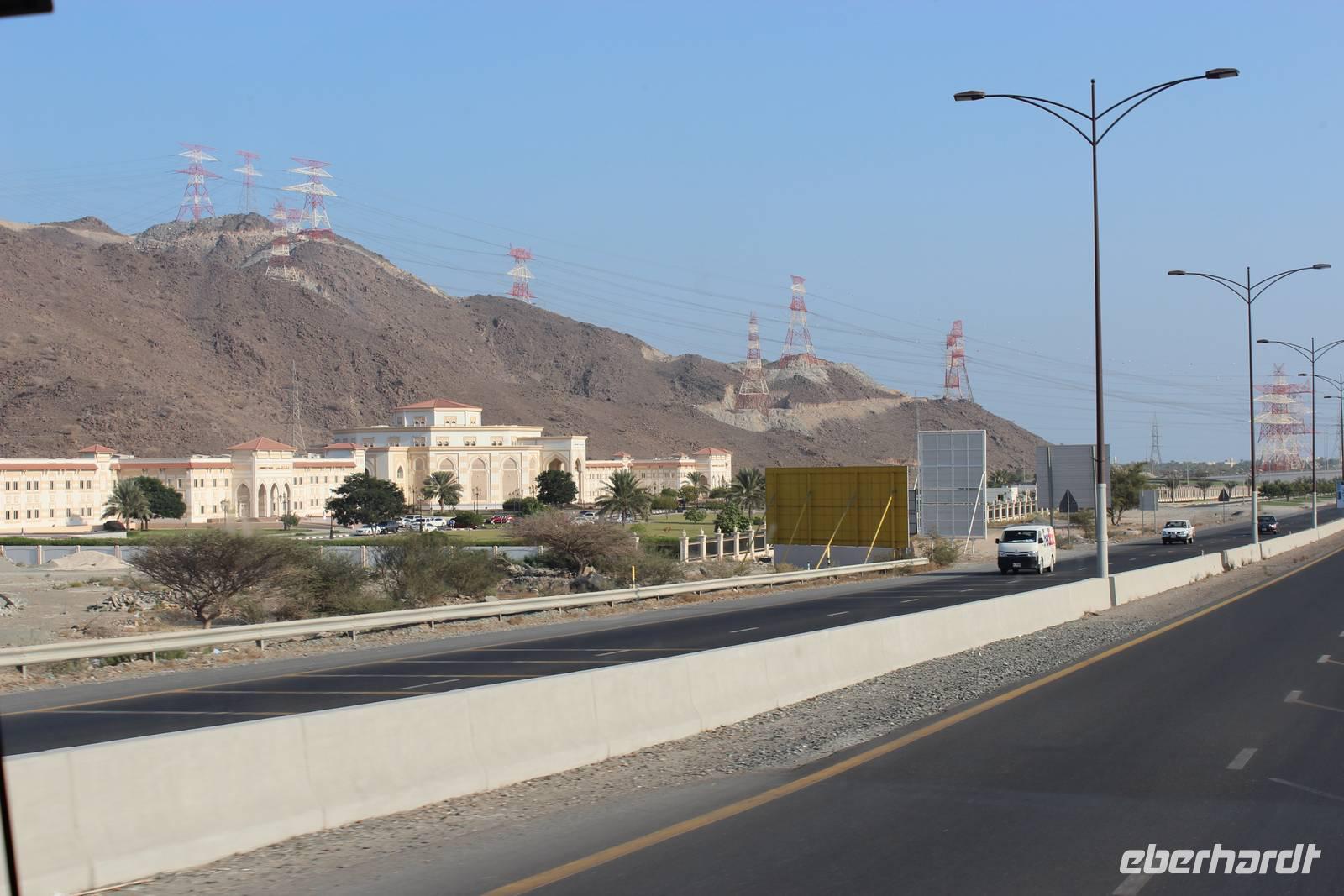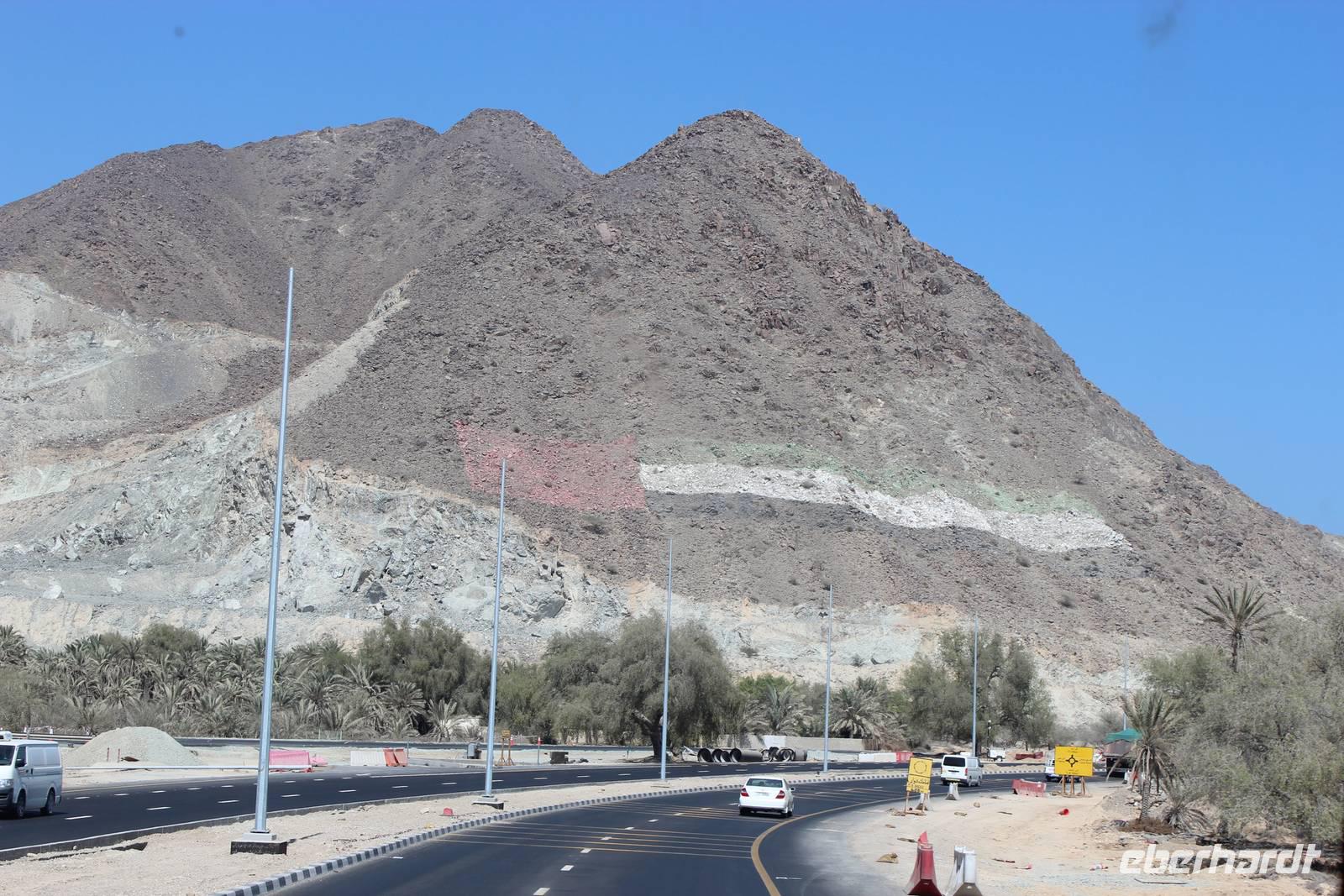 Mit dem Bus fuhren wir heute eine weite Strecke bis an die Ostküste der Vereinigten Arabischen Emirate. Auf dem Weg dort hin kamen uns viele LKW-Kolonnen mit Steinen entgegen. Diese kamen aus dem Hajar-Gebirge und fuhren in die Stadt um diese Steine mahlen zu lassen und anschließend wieder mit der gemahlenen Steinlieferung zurück zu fahren. Kurz vor dem Hajar-Gebirge machten wir eine Pause an einem Markt. Hier kauften einige von uns eine frische Kokosnuss zum Trinken. Danach fuhren wir ins Hajar-Gebirge wo wir ein Fotostopp machten, ehe wir weiter fuhren. Auf dem Weg an die Ostküste kamen wir an einigen Kreisverkehren vorbei, welche sehr hübsch kreiert worden waren. Einer wurde mit sieben Vasen bestückt, ein anderer mit sieben Haien und wieder ein anderer mit anderen Dingen. Und wieder hatte die Zahl sieben etwas mit den sieben Vereinigten Arabischen Emiraten zu tun. Es ging weiter zur ältesten Moschee in den Emiraten, welche sehr klein und aus Sand gebaut worden war. Gegen Mittag kamen wir dann im Sandy Beach Hotel an der Ostküste an. Hier aßen wir als erstes zu Mittag, um danach ein wenig im Meer baden zu gehen. Am späten Nachmittag fuhren wir dann wieder zurück zu unserem Hotel.