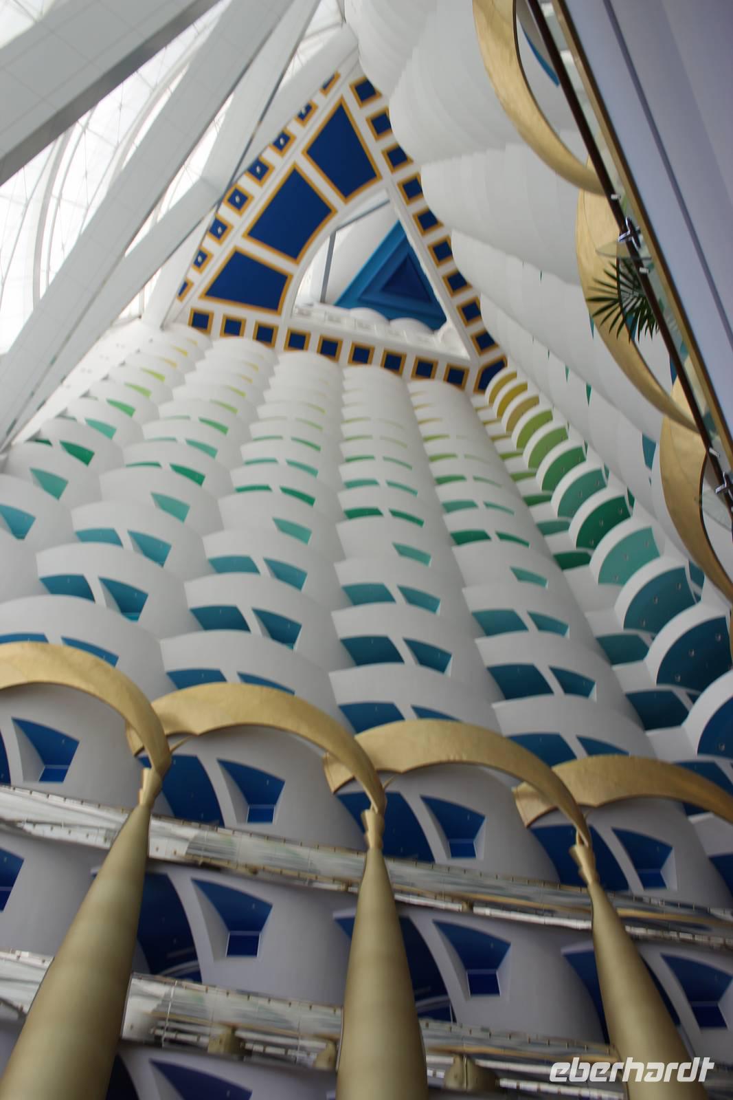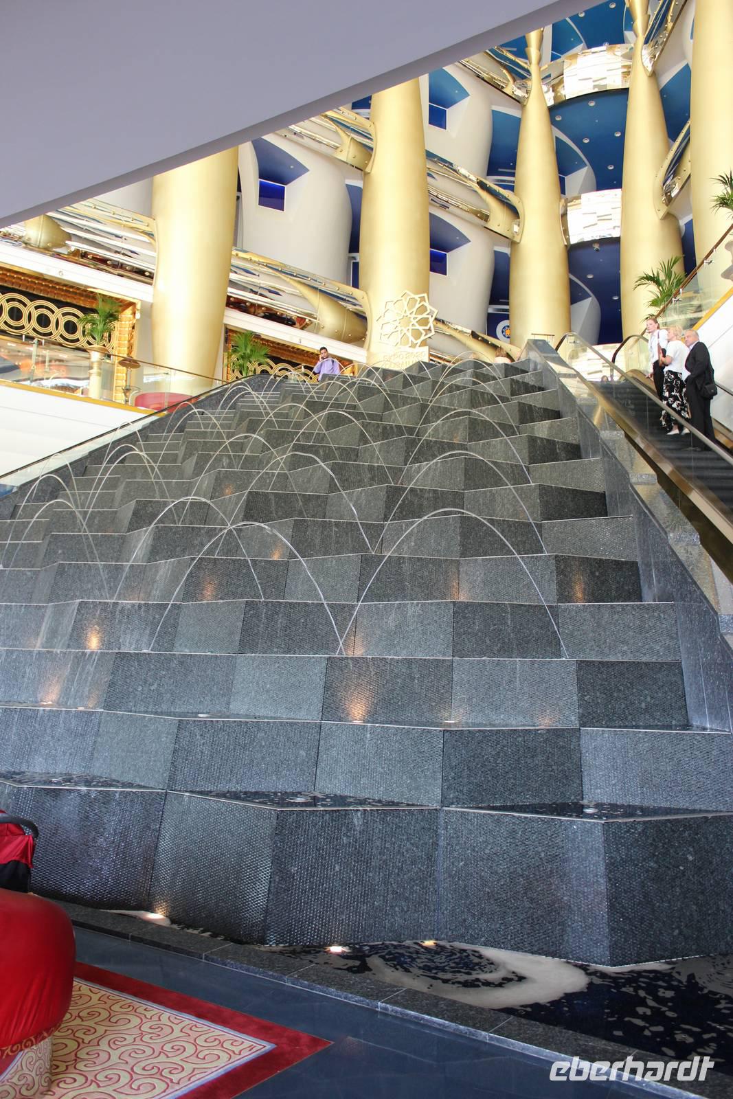 Am heutigen Tag führte uns der Bus zum Burj al Arab, doch bevor es in das wohl luxuriöseste Hotel der Welt ging, fuhren wir zum Souk Madinat Jumeirah. Hier hatten wir einen wunderschönen Blick zum Burj al Arab und konnten ein Gruppenfoto machen. Aber dann fuhren wir zum Luxus Hotel, welches inoffiziell 7 Sterne hat, offiziell aber nur 5 Sterne, da die höchste zu vergebene Sternezahl 5 ist. Als wir hinein gingen, fuhren wir an einem großen Springbrunnen vorbei. Unser Buffet war auch schon reichlich angerichtet. Unsere Kellner falteten für uns unsere Servietten immer wieder zusammen und wenn wir mit einem neuen Teller Essen an den Tisch kamen, wurde uns die Serviette auf unsere Beine gelegt. Nach dem Essen versuchten wir noch mit den Fahrtstühlen einige Etagen nach oben zu fahren, nur wurde uns dies leider versagt, da anscheinend eine höhere Gesellschaft im Hotel anwesend war.