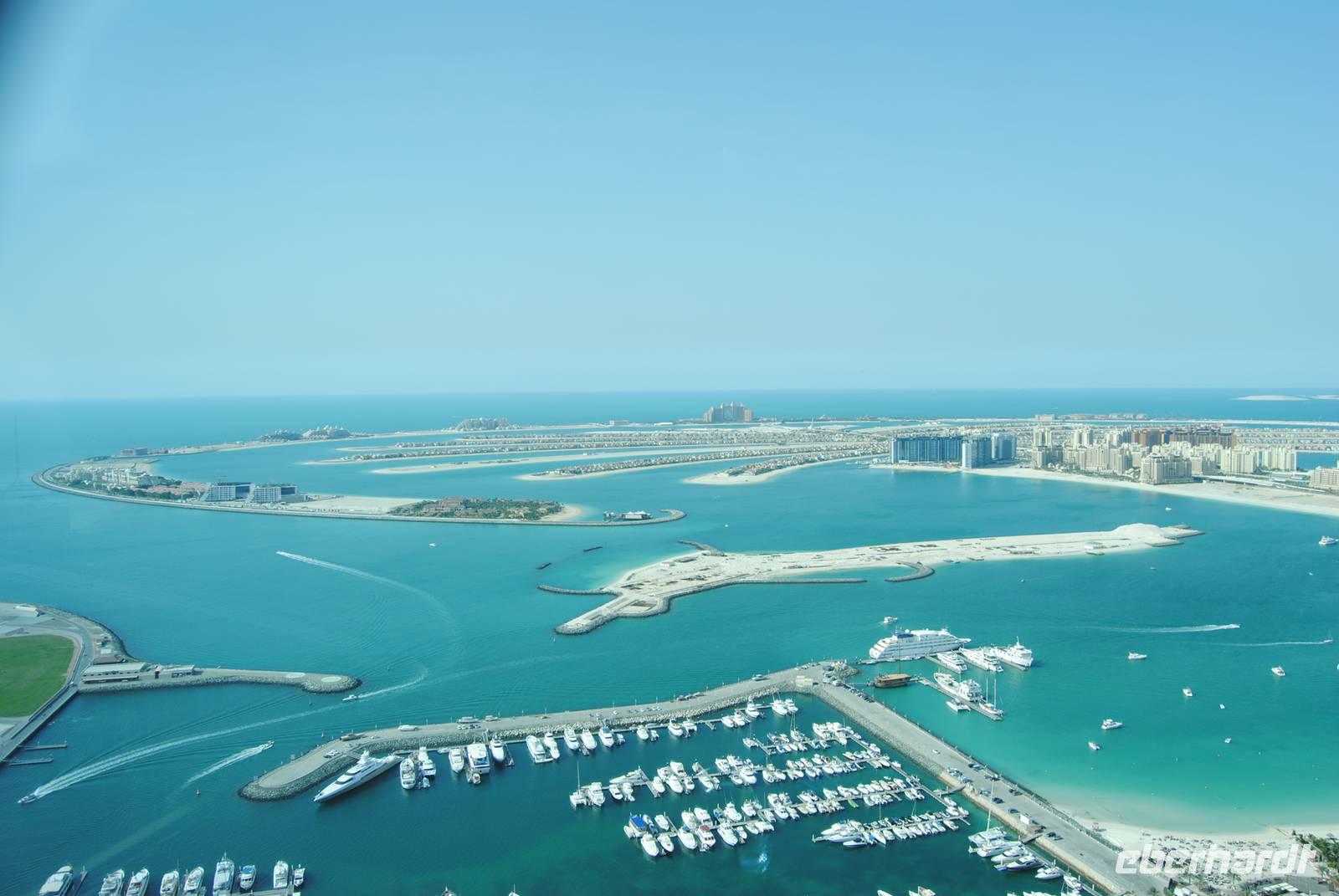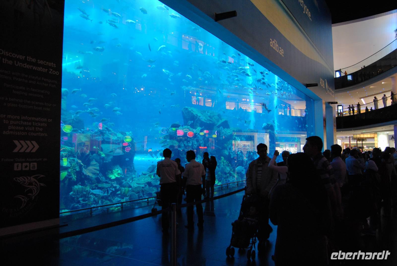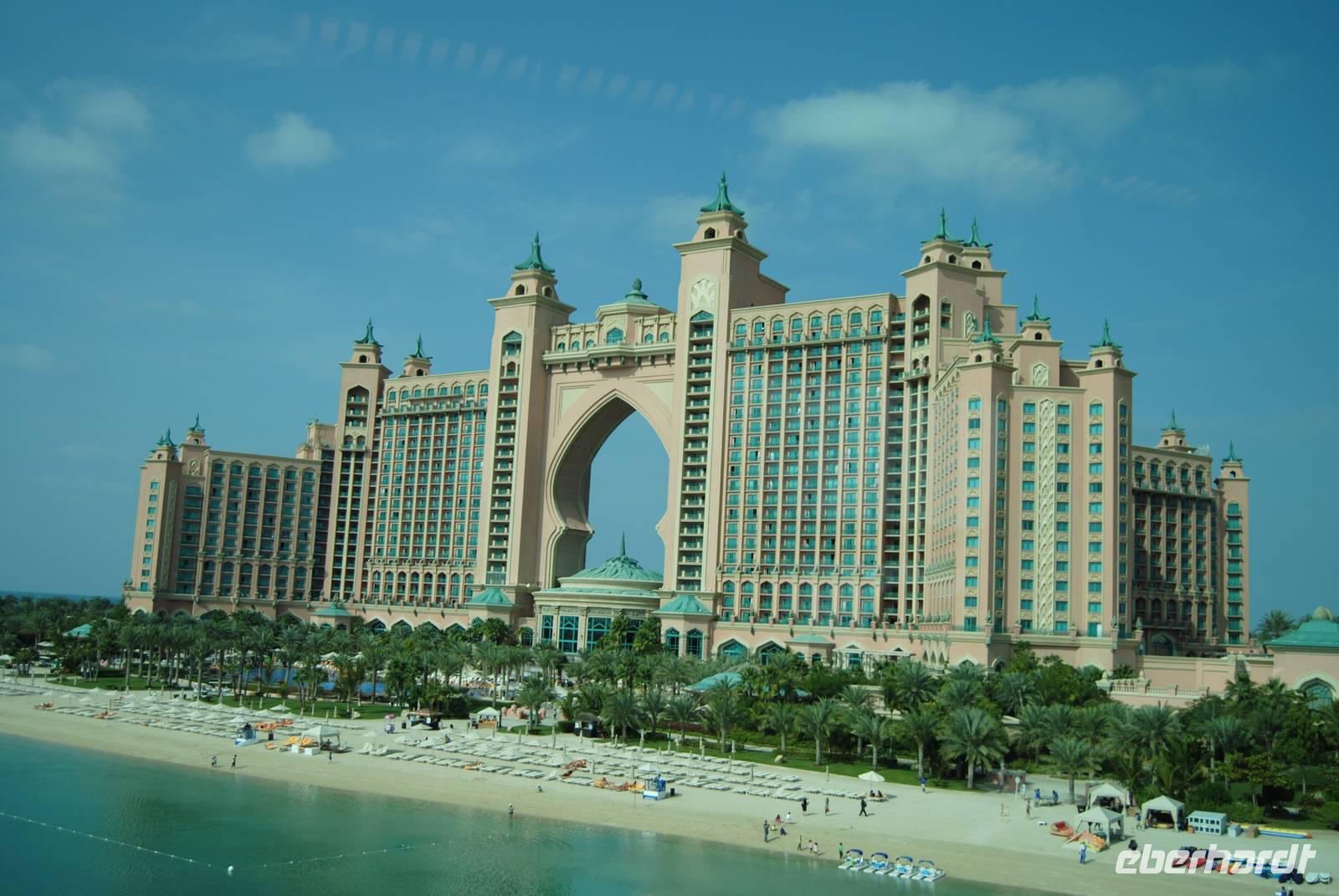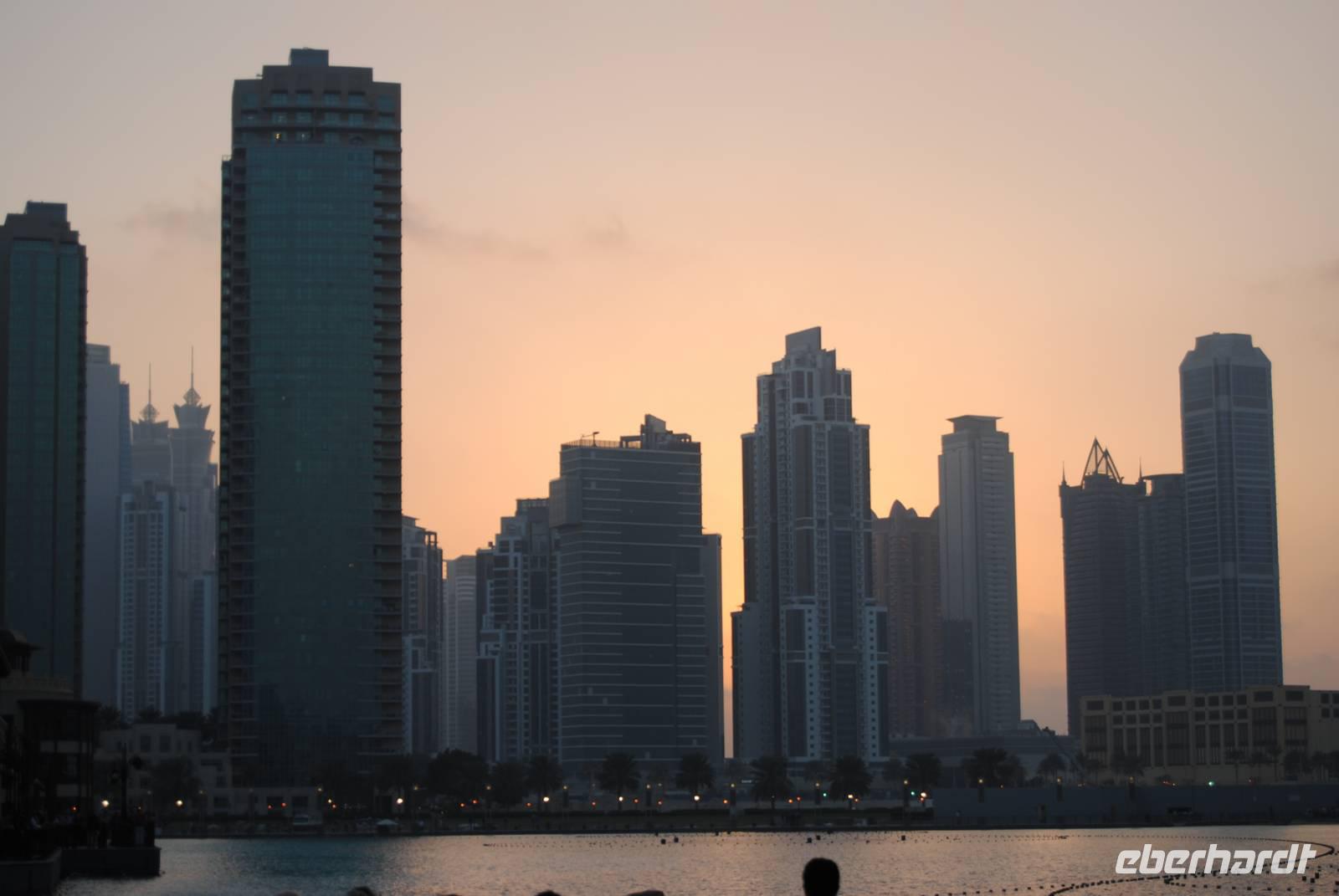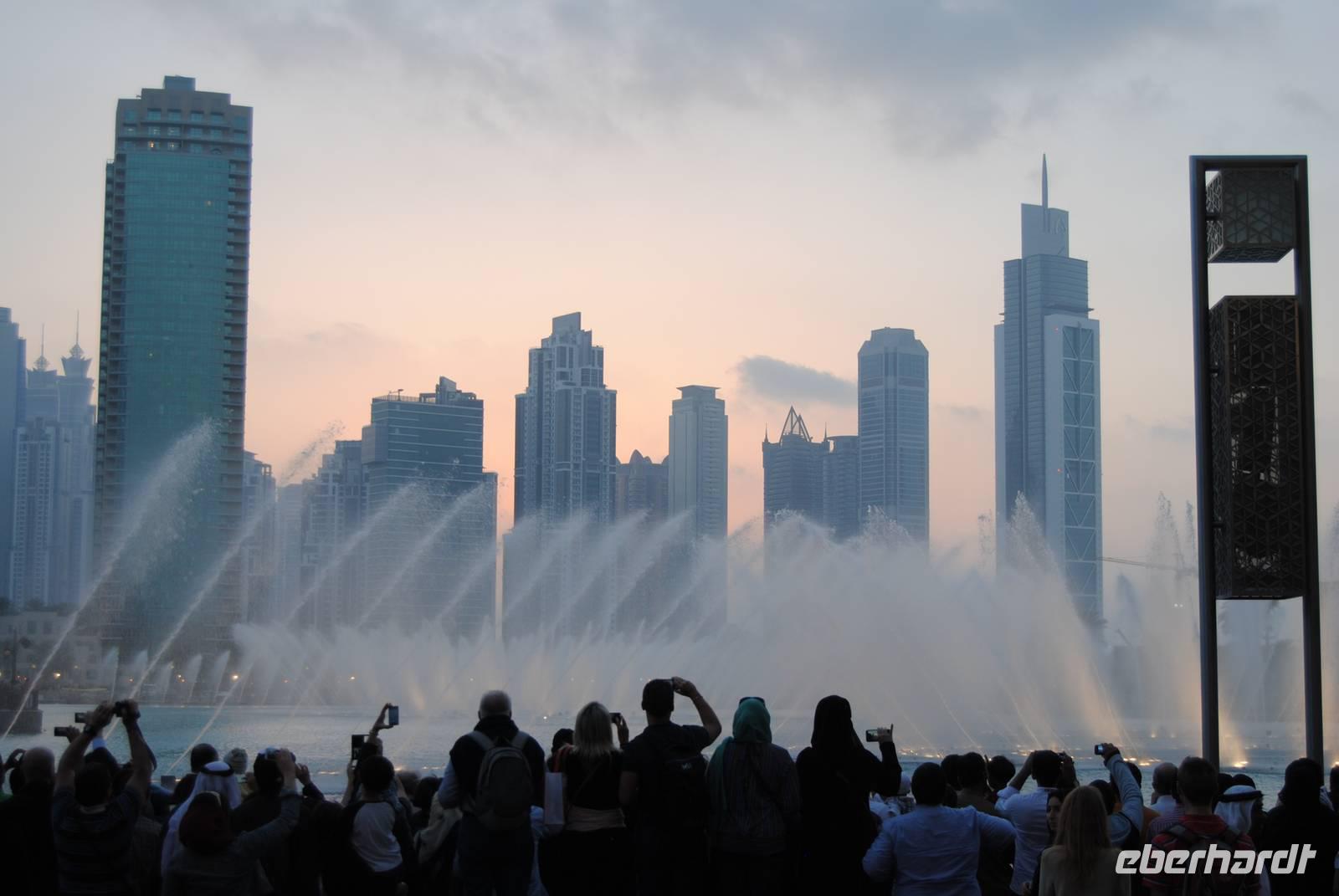 Über die Sheikh-Zayed-Road, der größten Schnellstraße Dubais, die an der breitesten Stelle sechs Spuren in jede Richtung misst, fuhren wir zunächst auf Palm Jumeirah, der bislang einzigen fast vollständig errichteten, künstlichen Insel vor Dubai. Auf dem ca. 4 km langen „Stamm" der Insel fuhren wir bis an Atlantis Hotel und schauten uns das Gebäude mit seinem imposanten Torbogen an. Den Rückweg von der „Palmenspitze" in Richtung „Palmenwurzel" fuhren wir dann mit der Monotrail, einer fahrerlosen Einschienenbahn. Nach einem kurzen Abstecher in die Dubai Marina fuhren wir anschließend mit dem Bus zunächst in die Mall of the Emirates, in der sich mit dem Ski Dubai, der größte Indoor-Skihalle der Welt befindet. Im Anschluss fuhren wir dann in die Dubai Mall, eines der mit einer Verkaufsfläche von ca. 350.000 m2 größten Einkaufszentren der Welt. In der Dubai Mall befinden sich über 1.200 Geschäfte, eine ganzjährig geöffnete Eislaufbahn, sowie ein mit 10.000 Kubikmetern Seewasser gefülltes Aquarium, welches über 30.000 Meerertiere beherbergt. Am Nachmittag stand dann eines der Höhepunkte unserer Reise auf dem Programm, die Auffahrt auf das Welthöchste Gebäude der Welt, den Burj Khalifa. Mit dem Aufzug fuhren wir bis in die 124. Etage des mit 828 m höchsten Gebäudes der Welt und erreichten dann die Aussichtsplattform, von der sich ein toller Blick über Dubai bietet. Am frühen Abend trafen wir uns dann alle zusammen am Fuße des Turmes zu schauten uns gemeinsam die beeindruckenden Wasserspiele an, die hier jeden Abend ab zwischen 18 und 22 Uhr stattfinden.