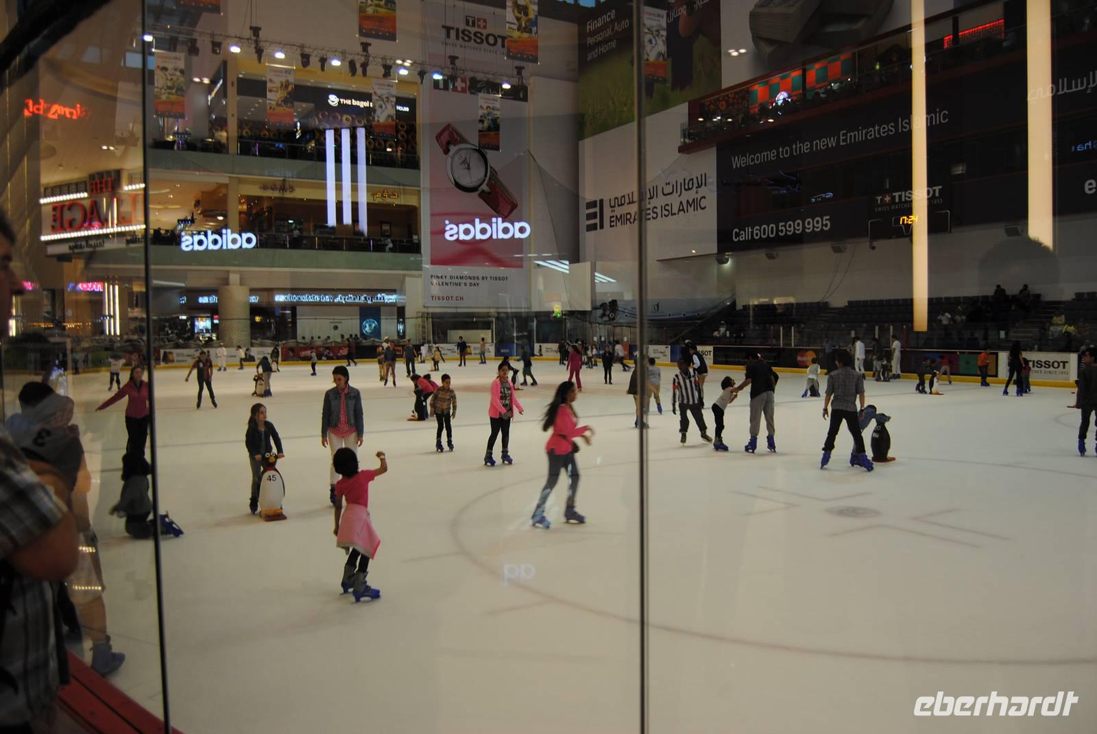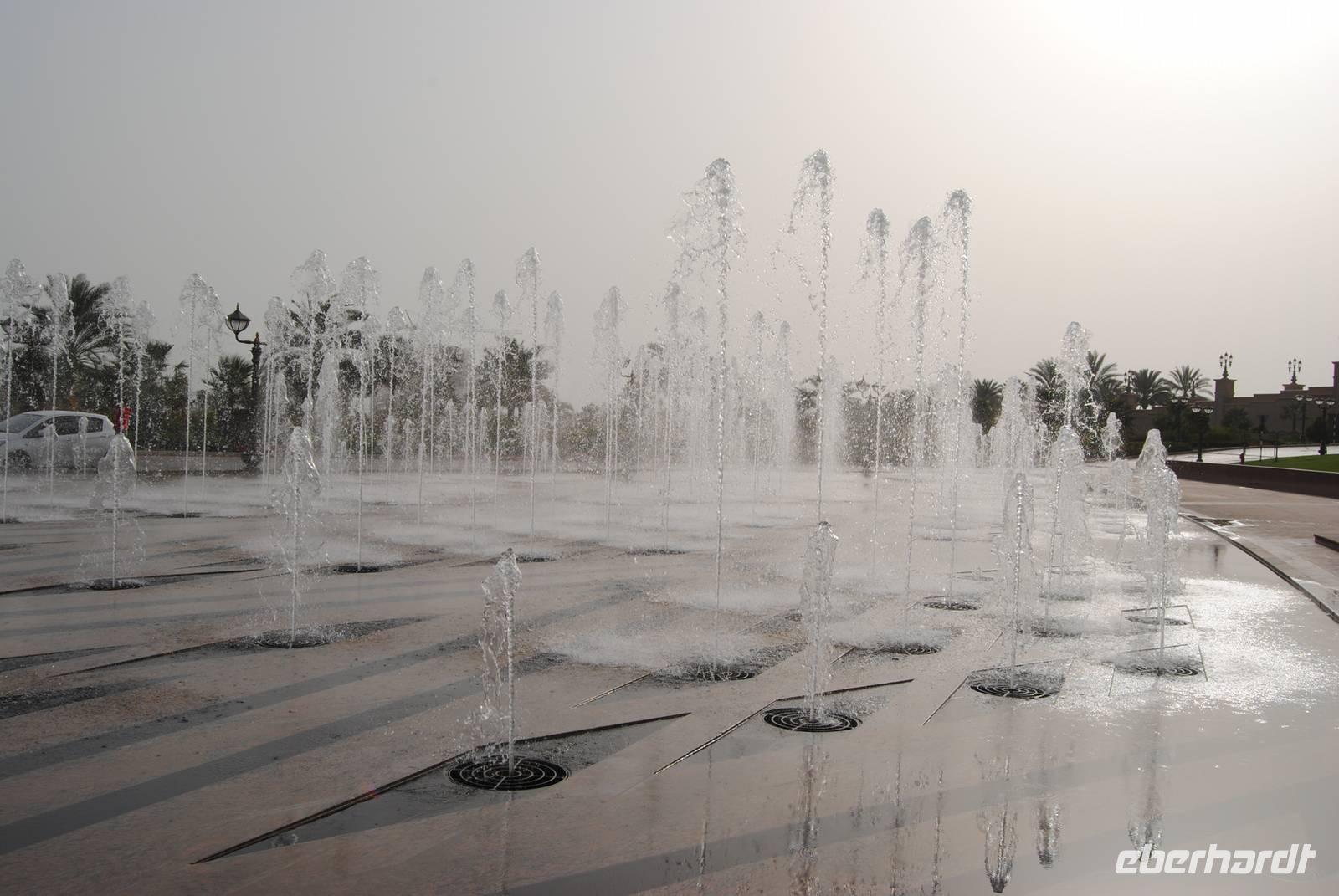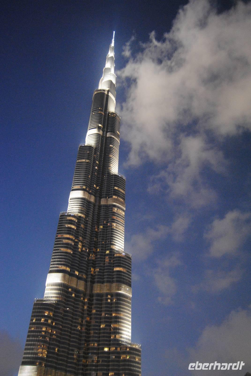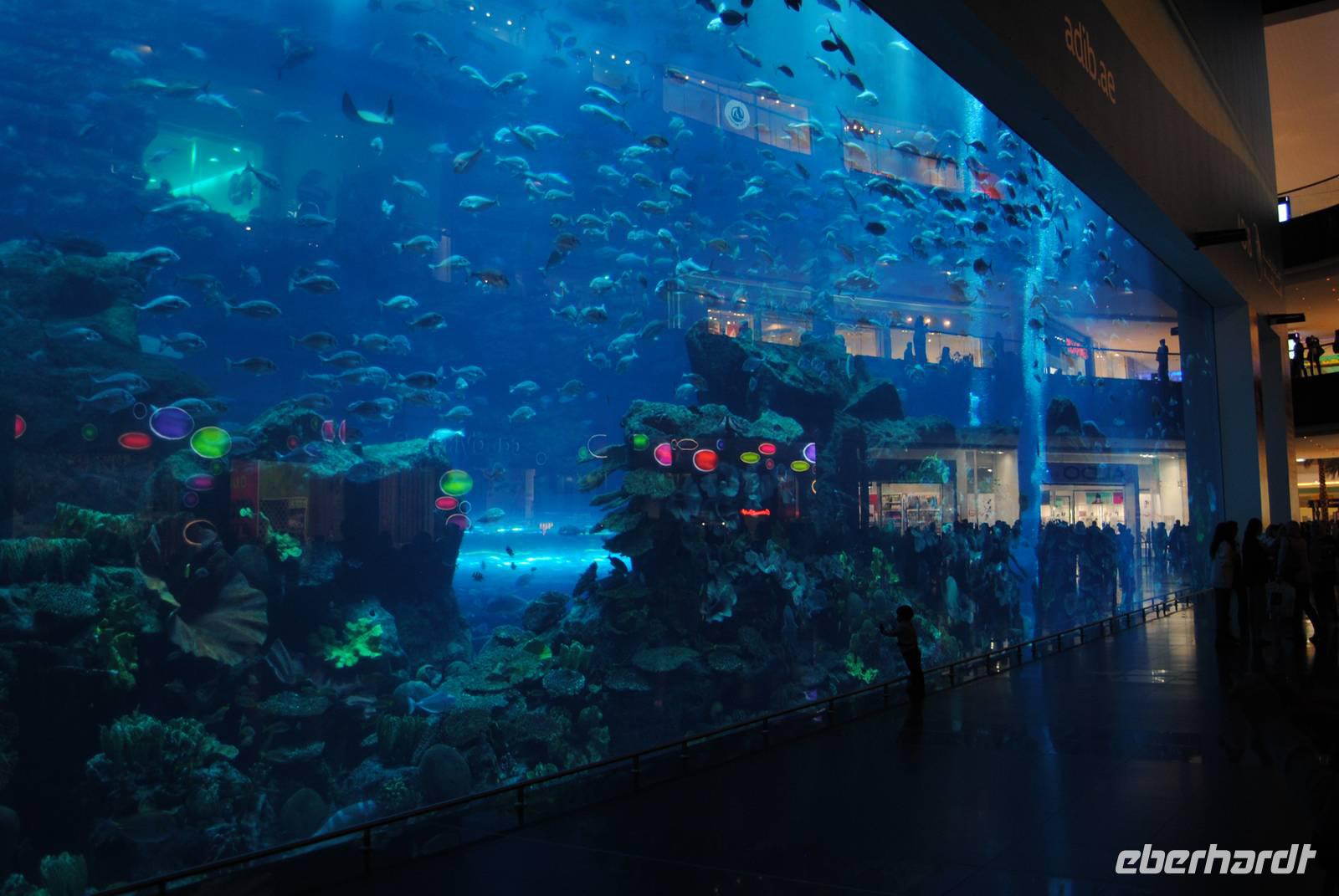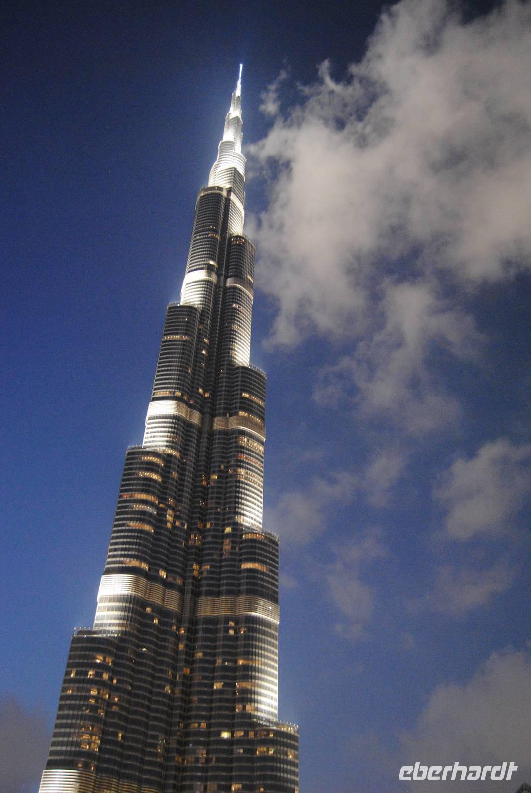 Über die Sheikh-Zayed-Road, der größten Schnellstraße Dubais, die an der breitesten Stelle sechs Spuren in jede Richtung misst, fuhren wir zunächst auf Palm Jumeirah, der bislang einzigen fast vollständig errichteten, künstlichen Insel vor Dubai. Auf dem ca. 4 km langen „Stamm" der Insel fuhren wir bis an Atlantis Hotel und schauten uns das Gebäude mit seinem imposanten Torbogen an. Den Rückweg von der „Palmenspitze" in Richtung „Palmenwurzel" fuhren wir dann mit der Monotrail, einer fahrerlosen Einschienenbahn. Nach einem kurzen Abstecher in die Dubai Marina fuhren wir anschließend mit dem Bus zunächst in die Mall of the Emirates, in der sich mit dem Ski Dubai, der größte Indoor-Skihalle der Welt befindet. Im Anschluss fuhren wir dann in die Dubai Mall, eines der mit einer Verkaufsfläche von ca. 350.000 m2 größten Einkaufszentren der Welt. In der Dubai Mall befinden sich über 1.200 Geschäfte, eine ganzjährig geöffnete Eislaufbahn, sowie ein mit 10.000 Kubikmetern Seewasser gefülltes Aquarium, welches über 30.000 Meerertiere beherbergt. Am Nachmittag stand dann eines der Höhepunkte unserer Reise auf dem Programm, die Auffahrt auf das Welthöchste Gebäude der Welt, den Burj Khalifa. Mit dem Aufzug fuhren wir bis in die 124. Etage des mit 828 m höchsten Gebäudes der Welt und erreichten dann die Aussichtsplattform, von der sich ein toller Blick über Dubai bietet. Am frühen Abend trafen wir uns dann alle zusammen am Fuße des Turmes zu schauten uns gemeinsam die beeindruckenden Wasserspiele an, die hier jeden Abend ab zwischen 18 und 22 Uhr stattfinden.