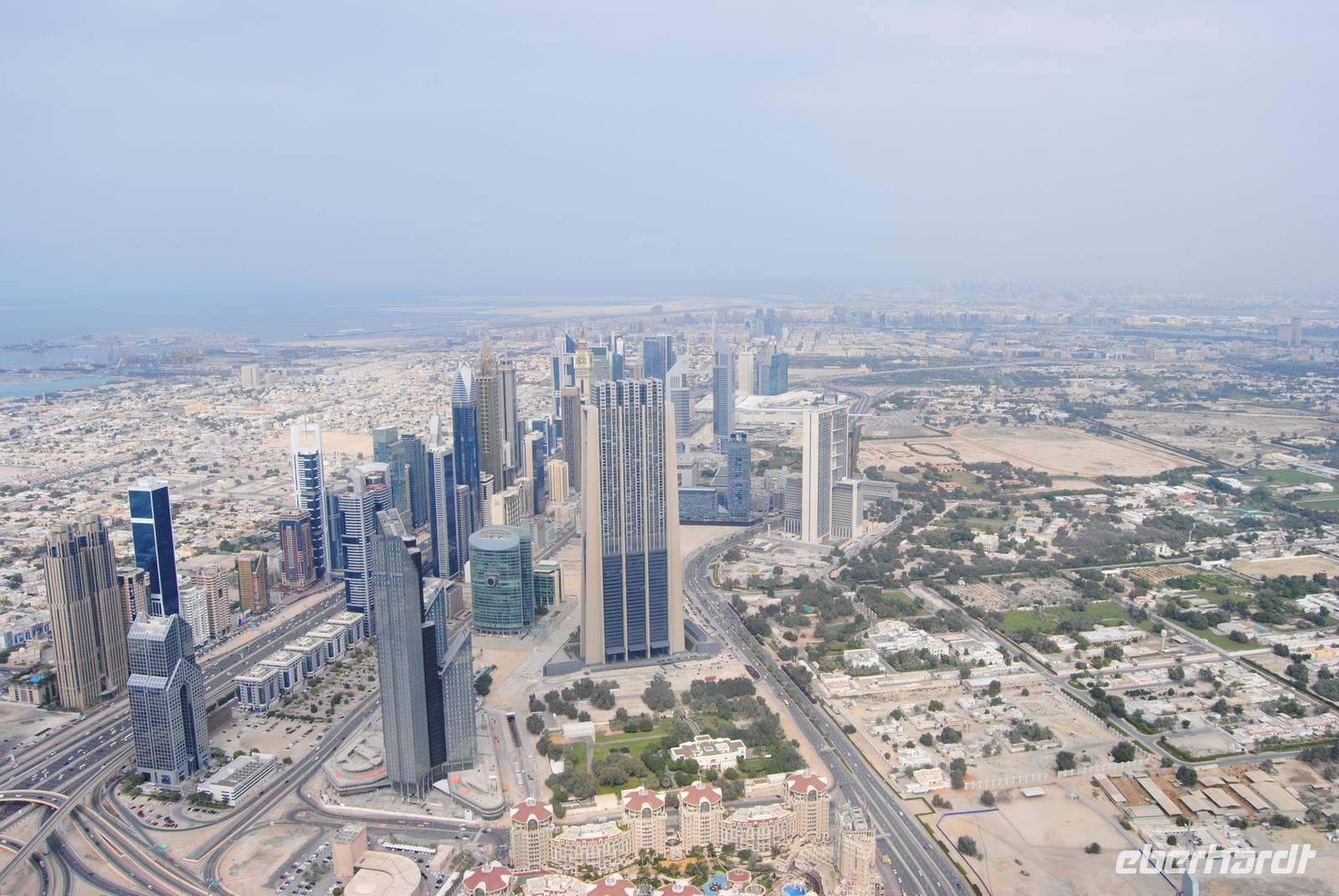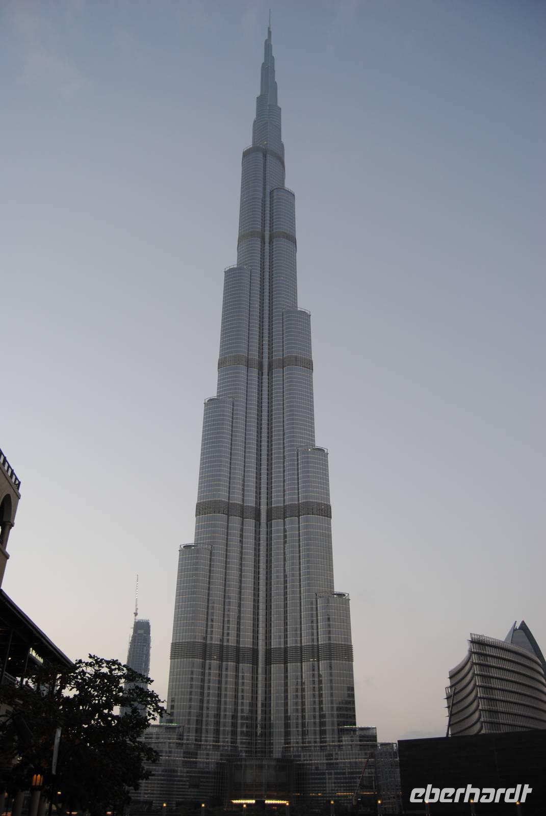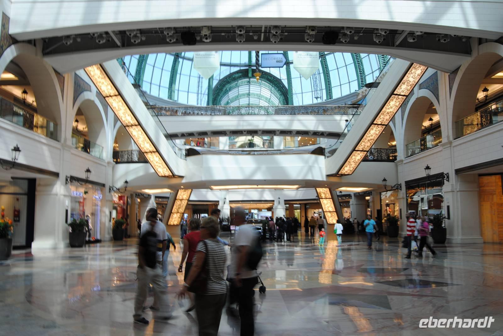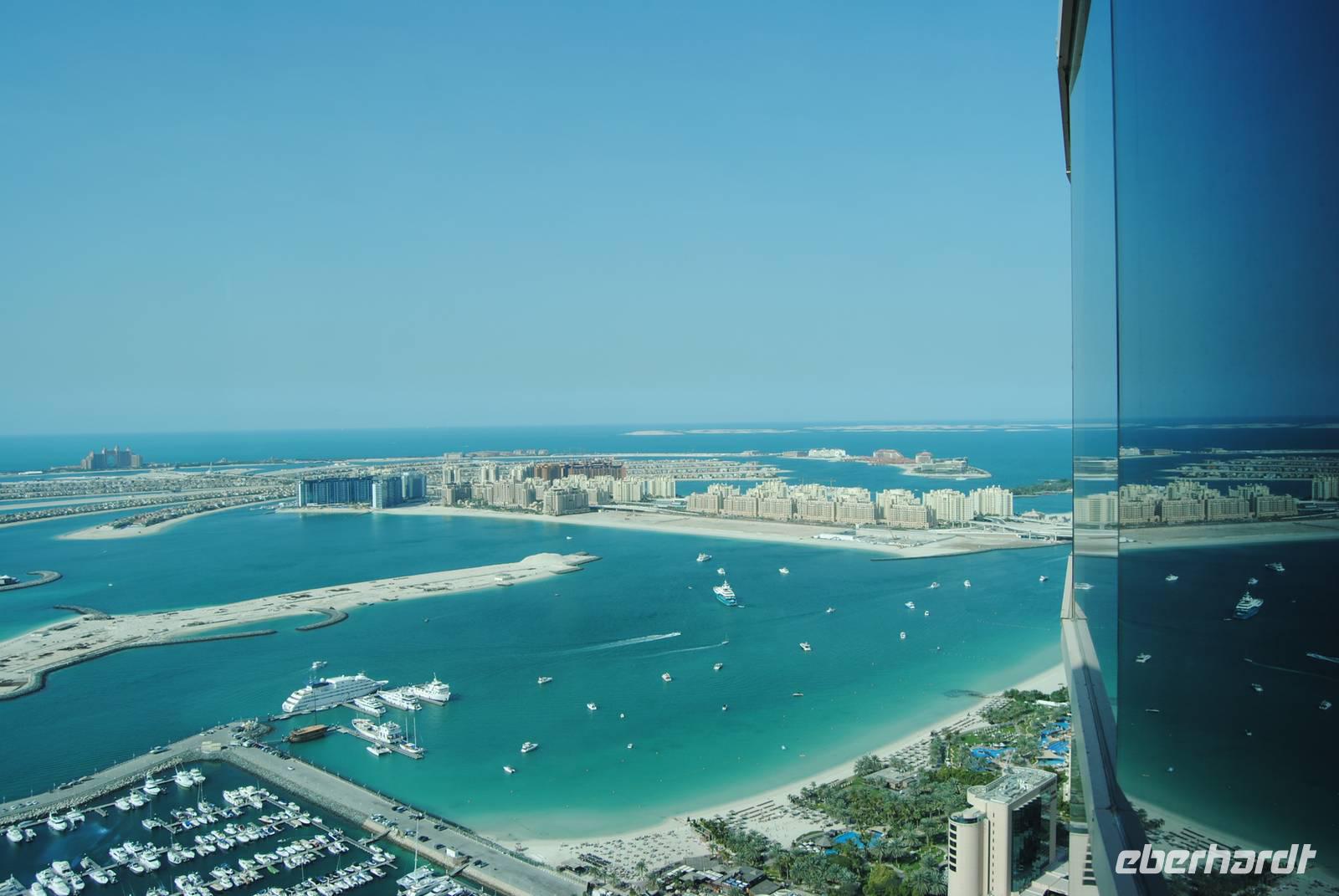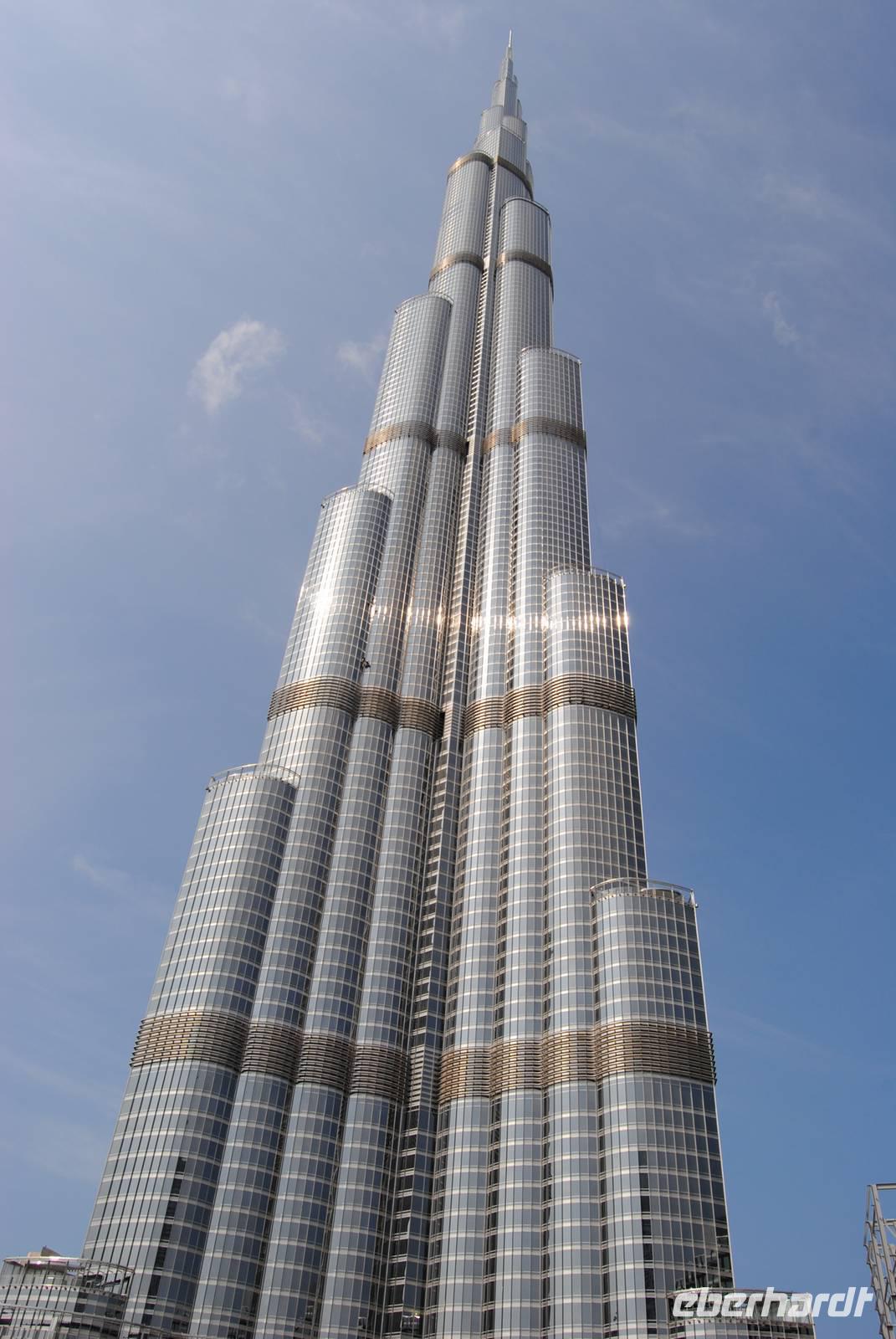 Über die Sheikh-Zayed-Road, der größten Schnellstraße Dubais, die an der breitesten Stelle sechs Spuren in jede Richtung misst, fuhren wir zunächst auf Palm Jumeirah, der bislang einzigen fast vollständig errichteten, künstlichen Insel vor Dubai. Auf dem ca. 4 km langen „Stamm" der Insel fuhren wir bis an Atlantis Hotel und schauten uns das Gebäude mit seinem imposanten Torbogen an. Den Rückweg von der „Palmenspitze" in Richtung „Palmenwurzel" fuhren wir dann mit der Monotrail, einer fahrerlosen Einschienenbahn. Nach einem kurzen Abstecher in die Dubai Marina fuhren wir anschließend mit dem Bus zunächst in die Mall of the Emirates, in der sich mit dem Ski Dubai, der größte Indoor-Skihalle der Welt befindet. Im Anschluss fuhren wir dann in die Dubai Mall, eines der mit einer Verkaufsfläche von ca. 350.000 m2 größten Einkaufszentren der Welt. In der Dubai Mall befinden sich über 1.200 Geschäfte, eine ganzjährig geöffnete Eislaufbahn, sowie ein mit 10.000 Kubikmetern Seewasser gefülltes Aquarium, welches über 30.000 Meerertiere beherbergt. Am Nachmittag stand dann eines der Höhepunkte unserer Reise auf dem Programm, die Auffahrt auf das Welthöchste Gebäude der Welt, den Burj Khalifa. Mit dem Aufzug fuhren wir bis in die 124. Etage des mit 828 m höchsten Gebäudes der Welt und erreichten dann die Aussichtsplattform, von der sich ein toller Blick über Dubai bietet. Am frühen Abend trafen wir uns dann alle zusammen am Fuße des Turmes zu schauten uns gemeinsam die beeindruckenden Wasserspiele an, die hier jeden Abend ab zwischen 18 und 22 Uhr stattfinden.