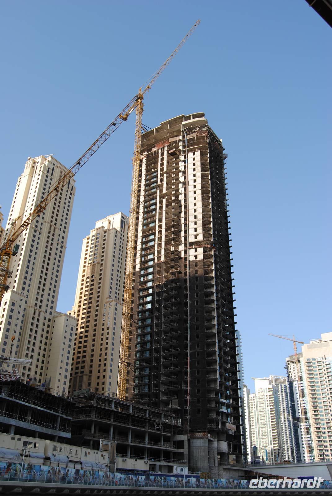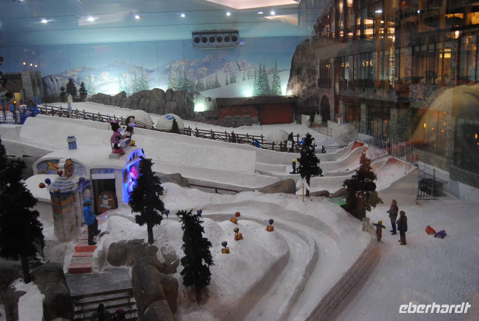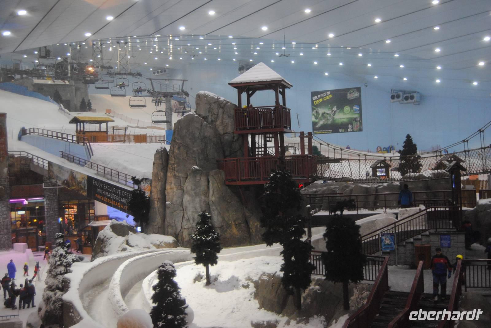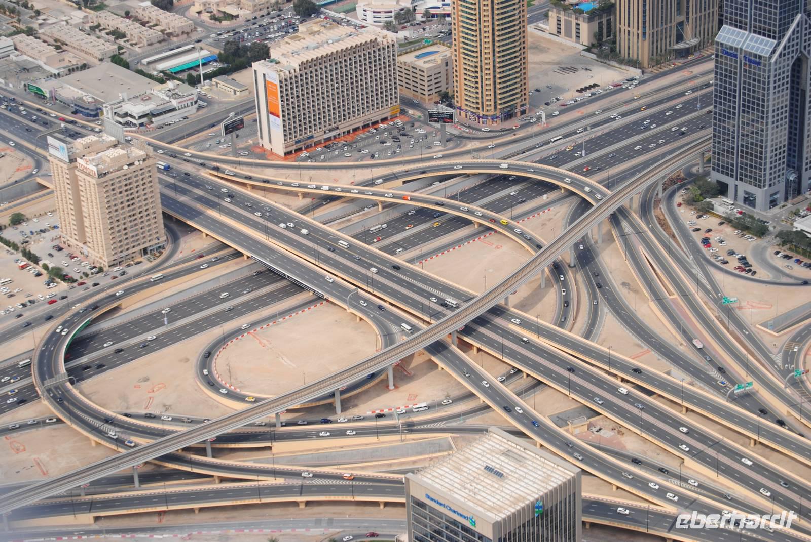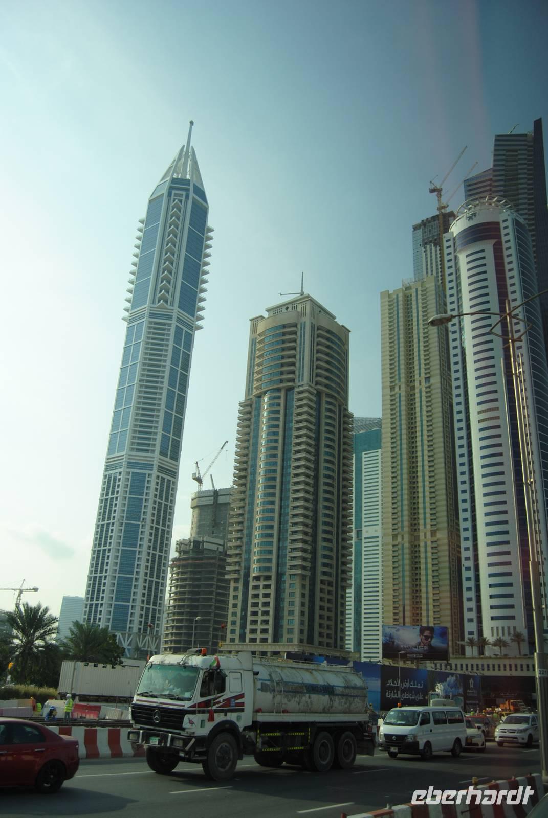 Über die Sheikh-Zayed-Road, der größten Schnellstraße Dubais, die an der breitesten Stelle sechs Spuren in jede Richtung misst, fuhren wir zunächst auf Palm Jumeirah, der bislang einzigen fast vollständig errichteten, künstlichen Insel vor Dubai. Auf dem ca. 4 km langen „Stamm" der Insel fuhren wir bis an Atlantis Hotel und schauten uns das Gebäude mit seinem imposanten Torbogen an. Den Rückweg von der „Palmenspitze" in Richtung „Palmenwurzel" fuhren wir dann mit der Monotrail, einer fahrerlosen Einschienenbahn. Nach einem kurzen Abstecher in die Dubai Marina fuhren wir anschließend mit dem Bus zunächst in die Mall of the Emirates, in der sich mit dem Ski Dubai, der größte Indoor-Skihalle der Welt befindet. Im Anschluss fuhren wir dann in die Dubai Mall, eines der mit einer Verkaufsfläche von ca. 350.000 m2 größten Einkaufszentren der Welt. In der Dubai Mall befinden sich über 1.200 Geschäfte, eine ganzjährig geöffnete Eislaufbahn, sowie ein mit 10.000 Kubikmetern Seewasser gefülltes Aquarium, welches über 30.000 Meerertiere beherbergt. Am Nachmittag stand dann eines der Höhepunkte unserer Reise auf dem Programm, die Auffahrt auf das Welthöchste Gebäude der Welt, den Burj Khalifa. Mit dem Aufzug fuhren wir bis in die 124. Etage des mit 828 m höchsten Gebäudes der Welt und erreichten dann die Aussichtsplattform, von der sich ein toller Blick über Dubai bietet. Am frühen Abend trafen wir uns dann alle zusammen am Fuße des Turmes zu schauten uns gemeinsam die beeindruckenden Wasserspiele an, die hier jeden Abend ab zwischen 18 und 22 Uhr stattfinden.