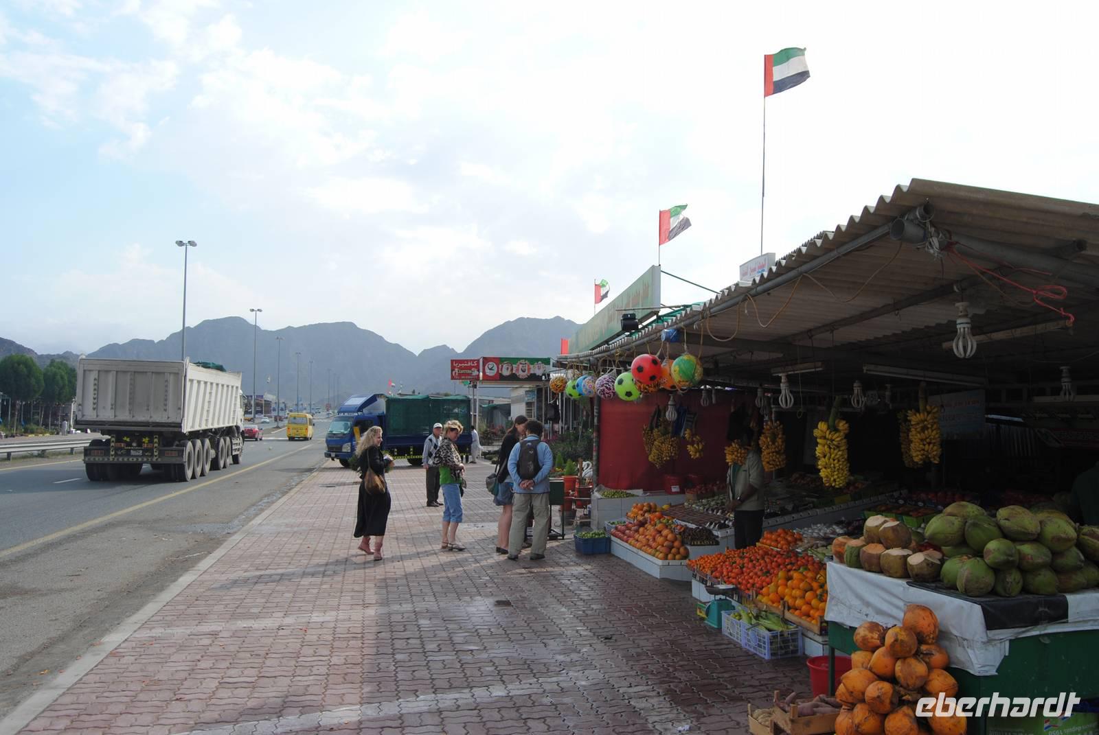 Mit einigen Gästen verließen wir am Morgen Dubai und begaben uns auf den Weg in Richtung Ostküste. Vorbei am Flughafen von Dubai und durch das Emirat Sharjah, erreichten wir nach 1,5 h die Ausläufer des Hajar-Gebirges (Steingebirge), das sich auf einer Länge von über 400 km zwischen dem Oman und den Vereinigten Arabischen Emiraten erstreckt. Nach einem Stopp am Gemüse- und Teppichmarkt, durchquerten wir das Gebirgsmassiv und erreichten am Mittag das Emirat Fujeirah. In Bidiyah besuchten wir zunächst die älteste Moschee der Vereinigten Arabischen Emirate, bevor wir uns nach Al Aqah begaben um im Sandy Beach Hotel Mittag zu Essen sowie anschließend am feinen Sandstrand des Hotels die Sonne zu genießen. Am Nachmittag fuhren wir dann inmitten eines Sandsturmes über Sharjah zurück nach Dubai und erreichten wieder unser Hotel.