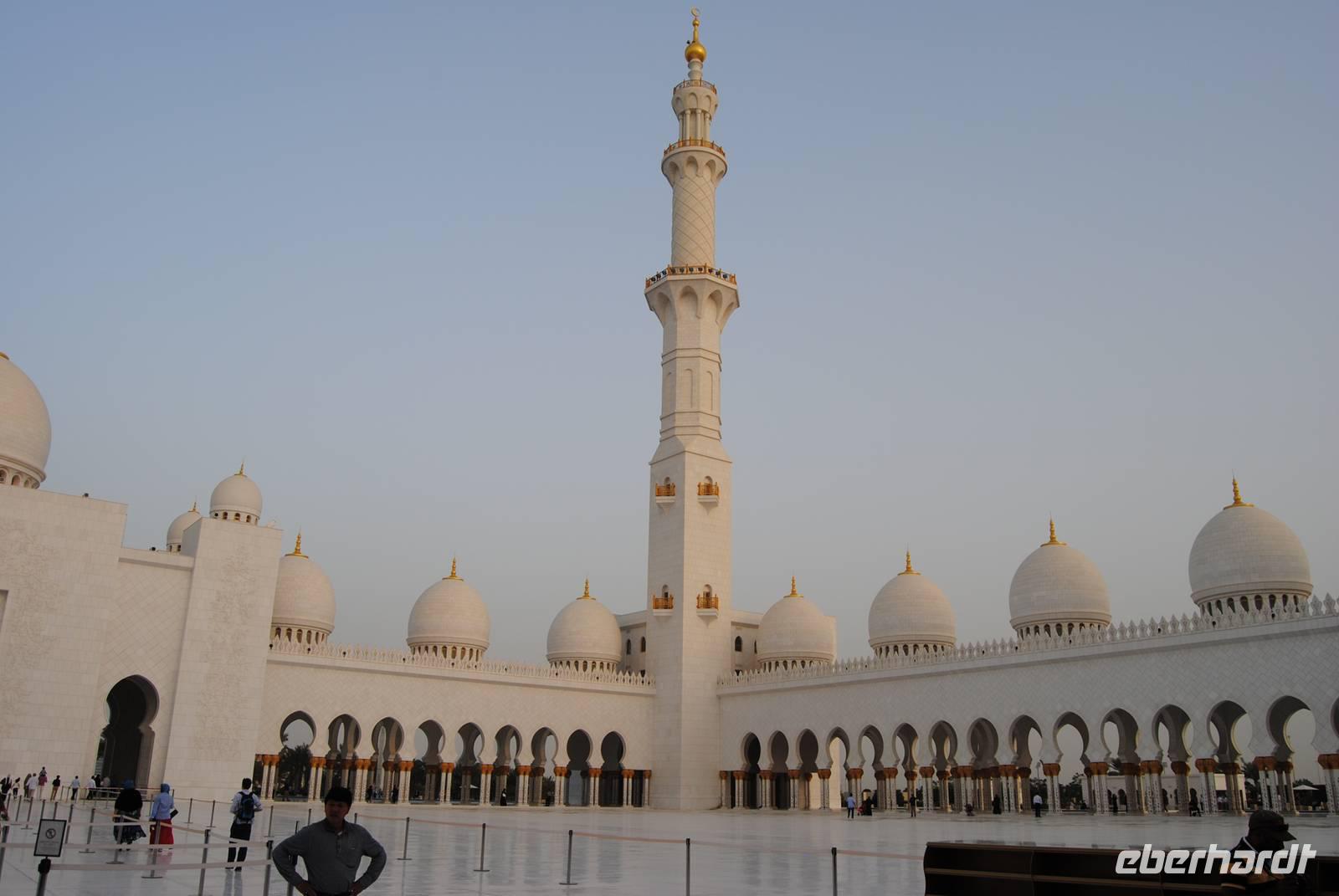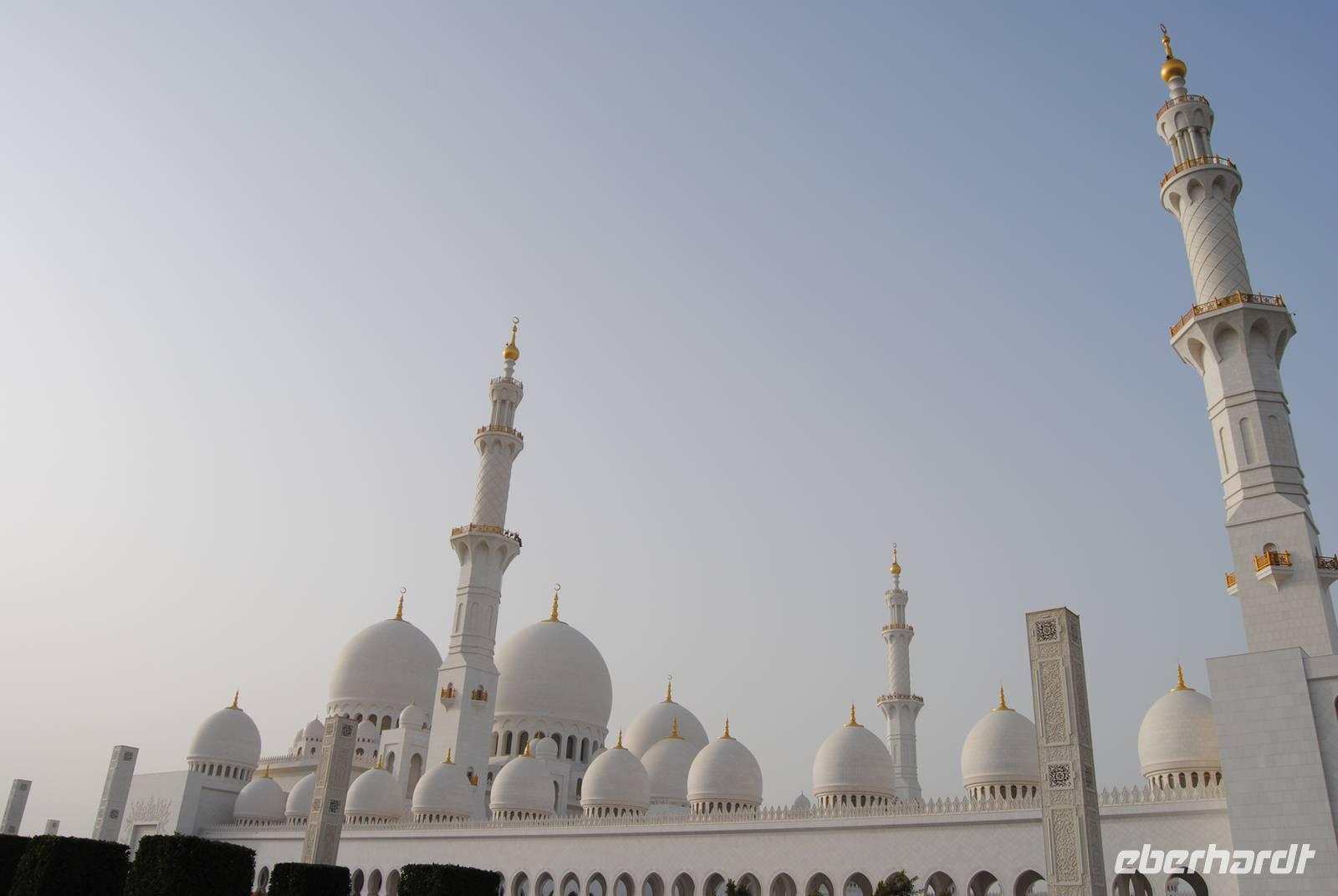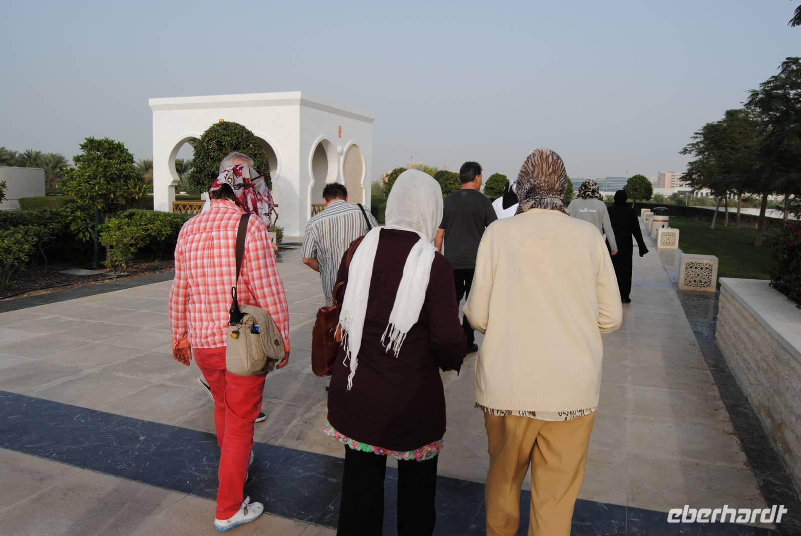 In die Hauptstadt der sieben vereinigten Emirate starteten wir schon recht zeitig, denn man fährt von Dubai über den Stadtteil Jebel Ali, in der sich auch die Freihandelszone des Emirates befindet, ca. 140 km bis zum „Vater der Gazelle", so Abu Dhabi übersetzt. Zunächst fuhren wir in die Falkenklinik etwas außerhalb von Abu Dhabi und lernten bei einem Rundgang durch die Klinik interessantes zum Wappentier der Vereinigten Arabischen Emirate kennen. Am Mittag besuchten wir dann kurz den Yas Marina Circuit, der Rennstrecke, auf dem jährlich die Formel 1 Rennen stattfinden. Über die Saadiyat Insel erreichten wir dann die Marina, bevor wir am Nachmittag im 5* Hotel - Emirates Palace zu einer Teestunde zu Gast waren. Das Emirates Palace wurde 2005 errichtet und hat knapp 400 Zimmer. Auf dem Rückweg in Richtung Dubai statteten wir dann der Sheikh-Zayed-Moschee Moschee noch einen Besuch ab. Sie wurde 2007 zu Ehren des ersten Präsidenten der Vereinigten Arabischen Emirate errichtet und ist die drittgrößte Moschee weltweit.