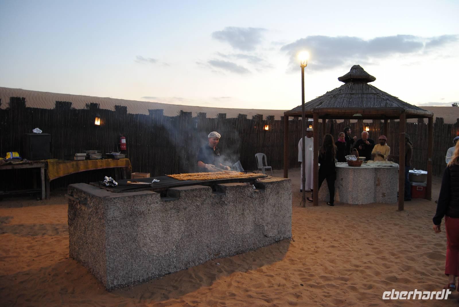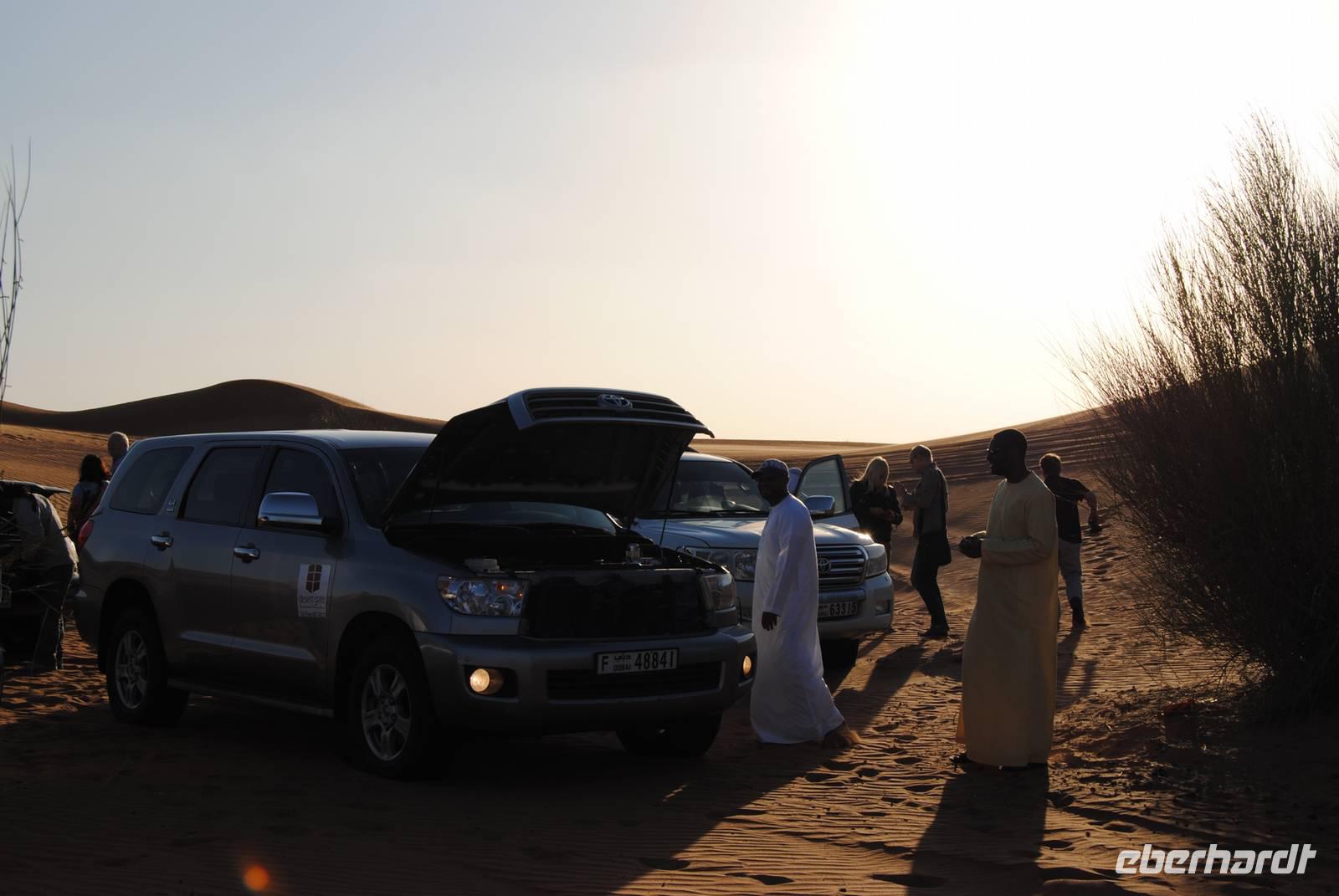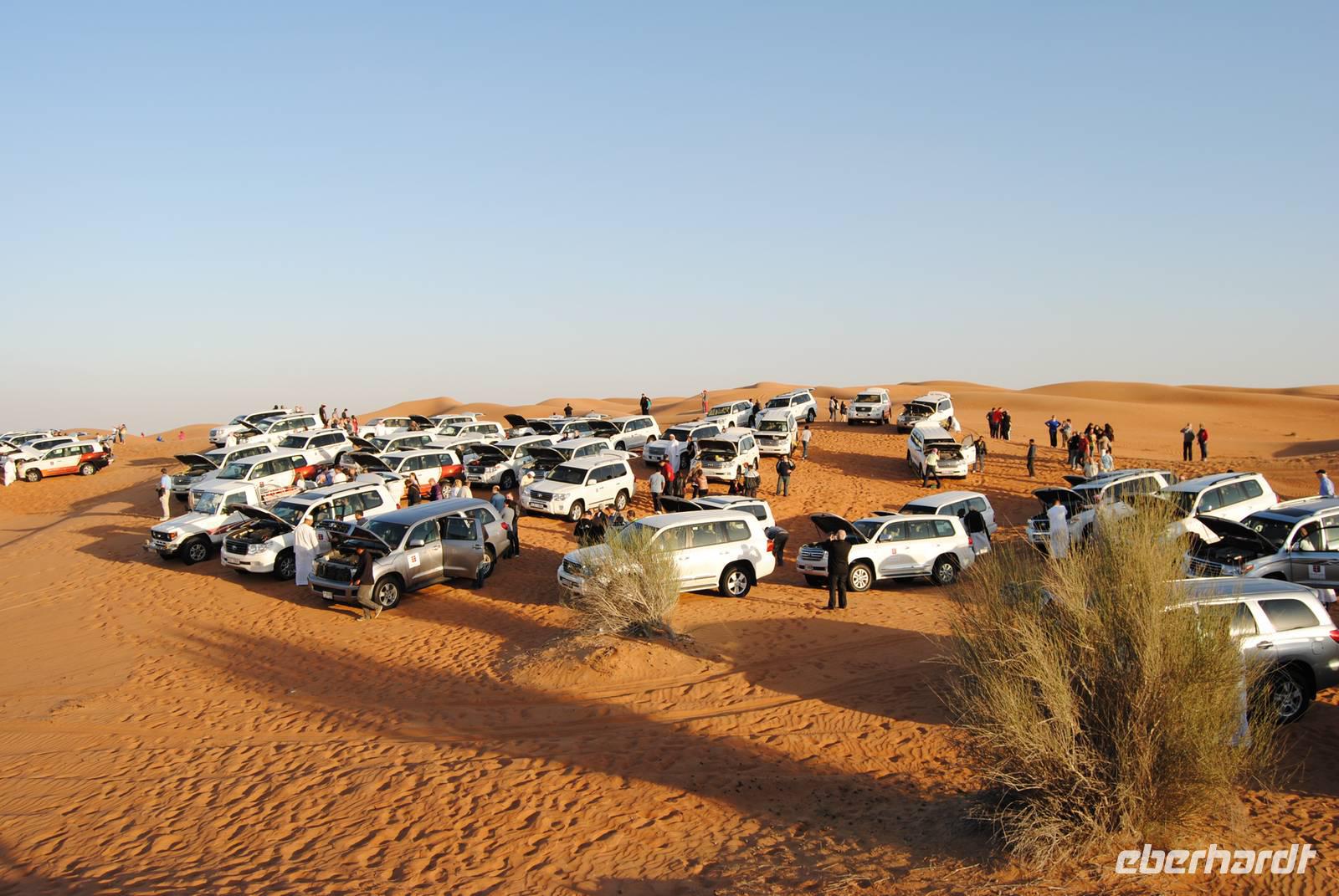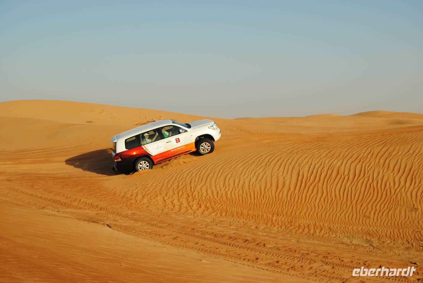 Am Morgen fuhren wir in das Nachbaremirat Sharjah, dem drittgrößten Emirat. Zunächst fuhren wir an die King-Faisal-Moschee und besuchten den Fischmarkt, auf dem man sämtliche Fischarten aus dem Persischen Golf in Hülle und Fülle frisch zu kaufen bekommt. Gleich nebenan befindet sich auch der Gemüse- und Obstmarkt sowie der Blaue Souk, die wir ebenfalls besuchten. Am Nachmittag wurden wir dann an unserem Hotel von drei Jeeps zur Wüstensafari abgeholt und wir fuhren zunächst etwas außerhalb von Dubai an den Wüstenrand, um den Reifendruck abzulassen. Anschließend ging es durch die unendliche Weite der Wüstenlandschaft mit dem Jeep, bevor wir pünktlich zum Sonnenuntergang das Wüstencamp erreichten. Im Camp nahmen wir dann unter sternenklarem Himmel auf gemütlichen Sitzkissen Platz und machten es uns bei gegrilltem und frisch gebackenem Fladenbrot bequem und genossen das orientalische Programm.