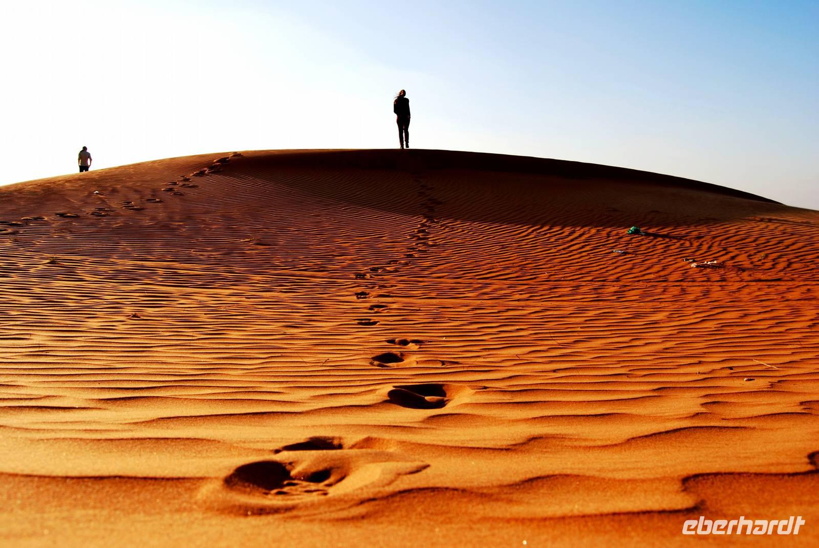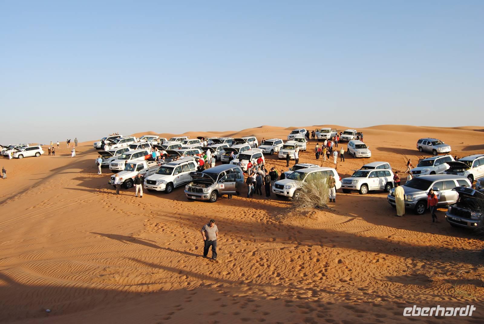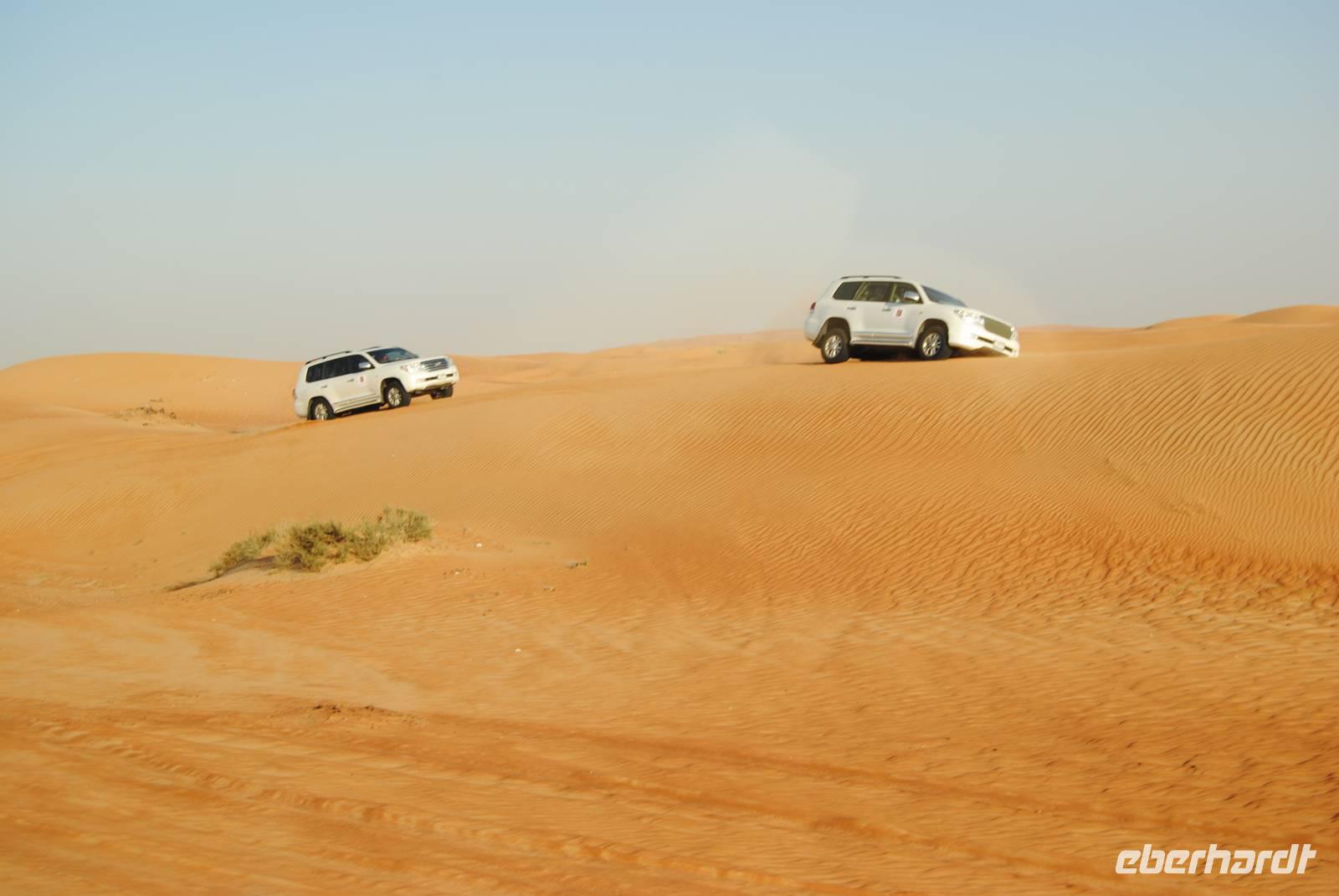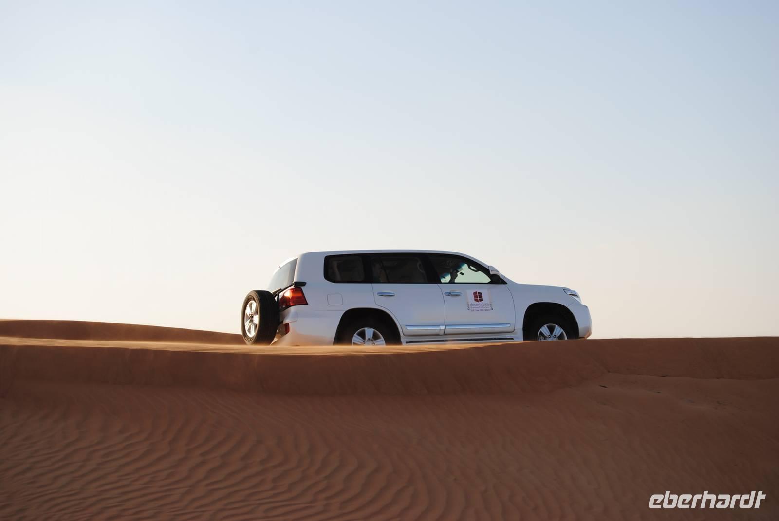 Am Morgen fuhren wir in das Nachbaremirat Sharjah, dem drittgrößten Emirat. Zunächst fuhren wir an die King-Faisal-Moschee und besuchten den Fischmarkt, auf dem man sämtliche Fischarten aus dem Persischen Golf in Hülle und Fülle frisch zu kaufen bekommt. Gleich nebenan befindet sich auch der Gemüse- und Obstmarkt sowie der Blaue Souk, die wir ebenfalls besuchten. Am Nachmittag wurden wir dann an unserem Hotel von drei Jeeps zur Wüstensafari abgeholt und wir fuhren zunächst etwas außerhalb von Dubai an den Wüstenrand, um den Reifendruck abzulassen. Anschließend ging es durch die unendliche Weite der Wüstenlandschaft mit dem Jeep, bevor wir pünktlich zum Sonnenuntergang das Wüstencamp erreichten. Im Camp nahmen wir dann unter sternenklarem Himmel auf gemütlichen Sitzkissen Platz und machten es uns bei gegrilltem und frisch gebackenem Fladenbrot bequem und genossen das orientalische Programm.
