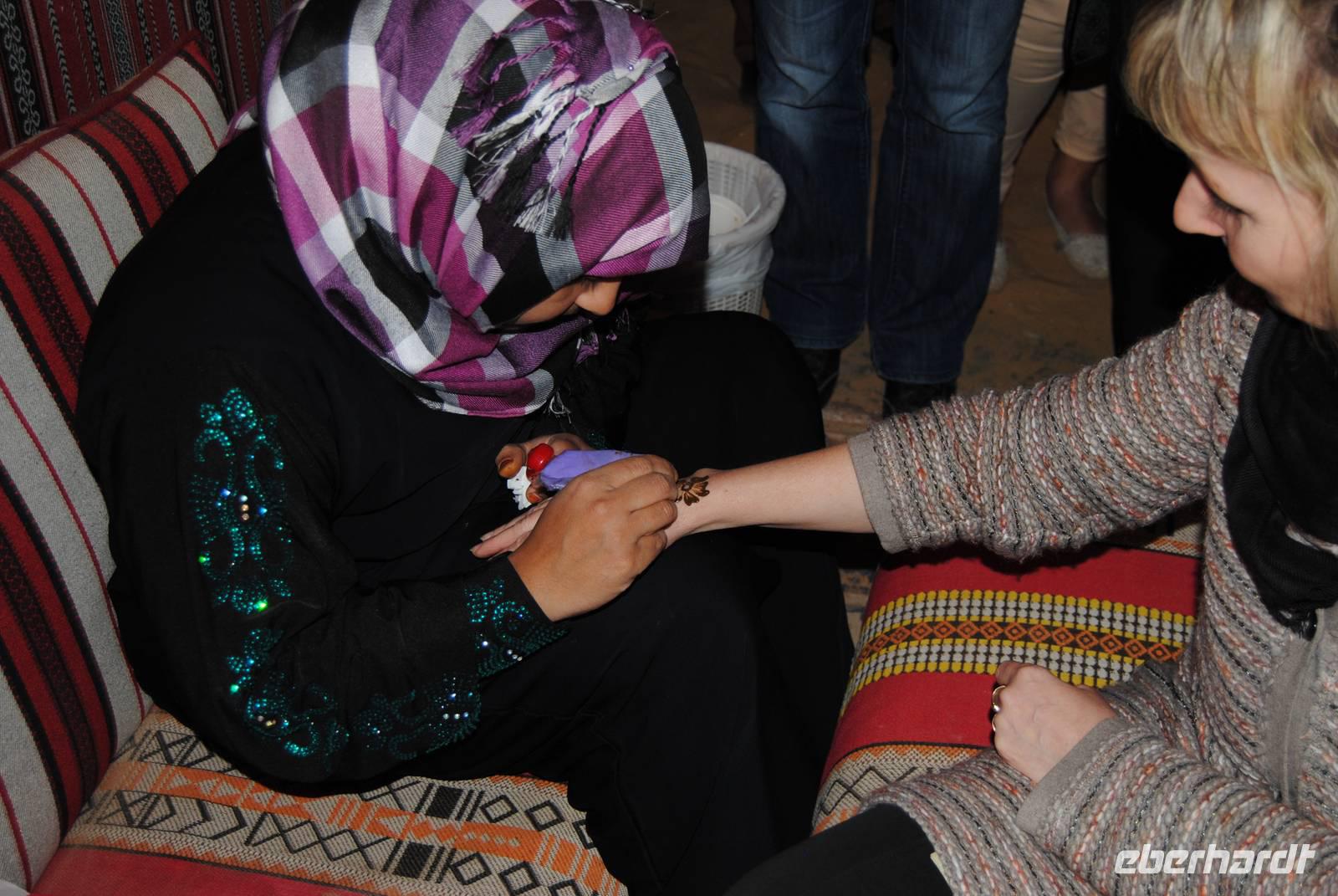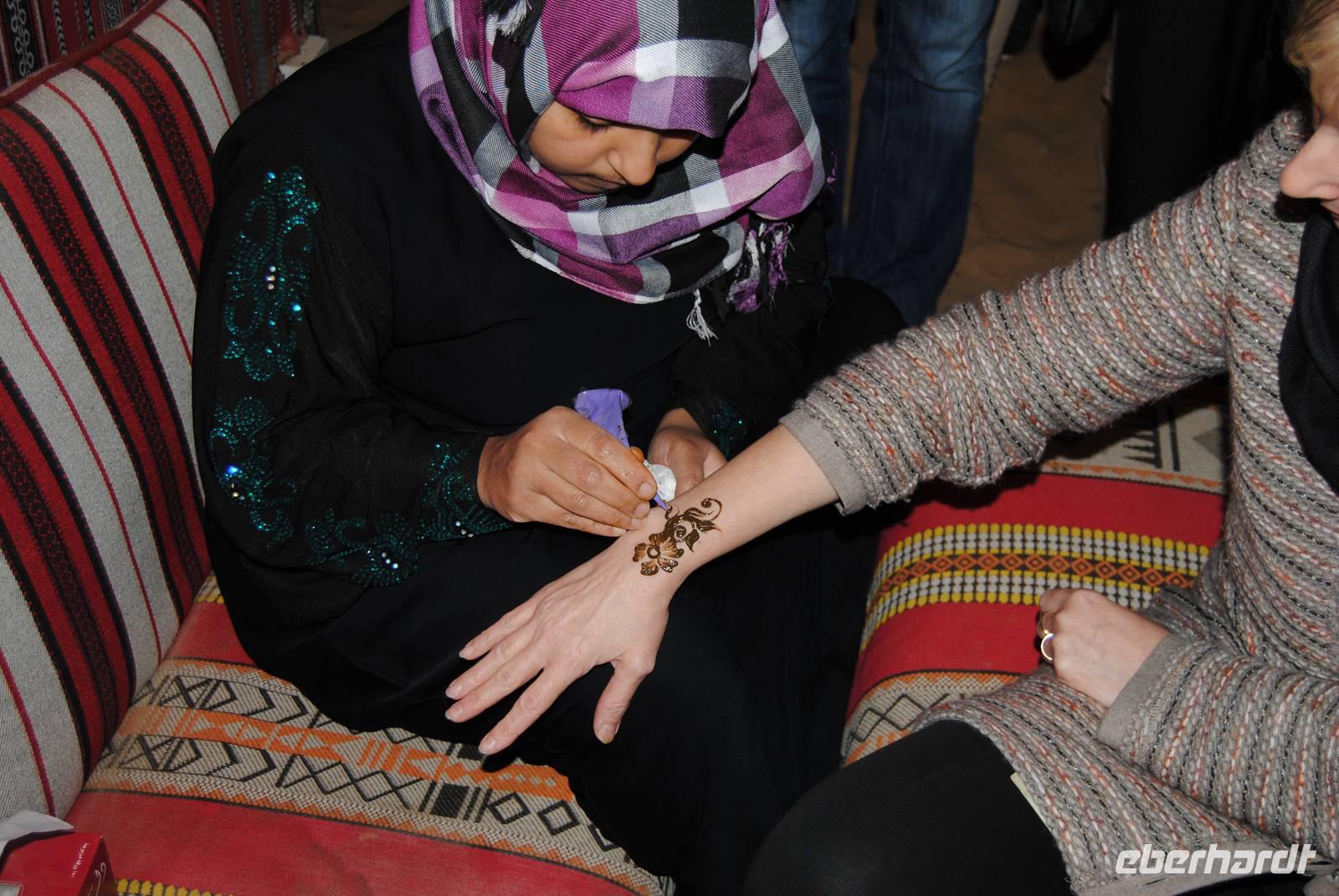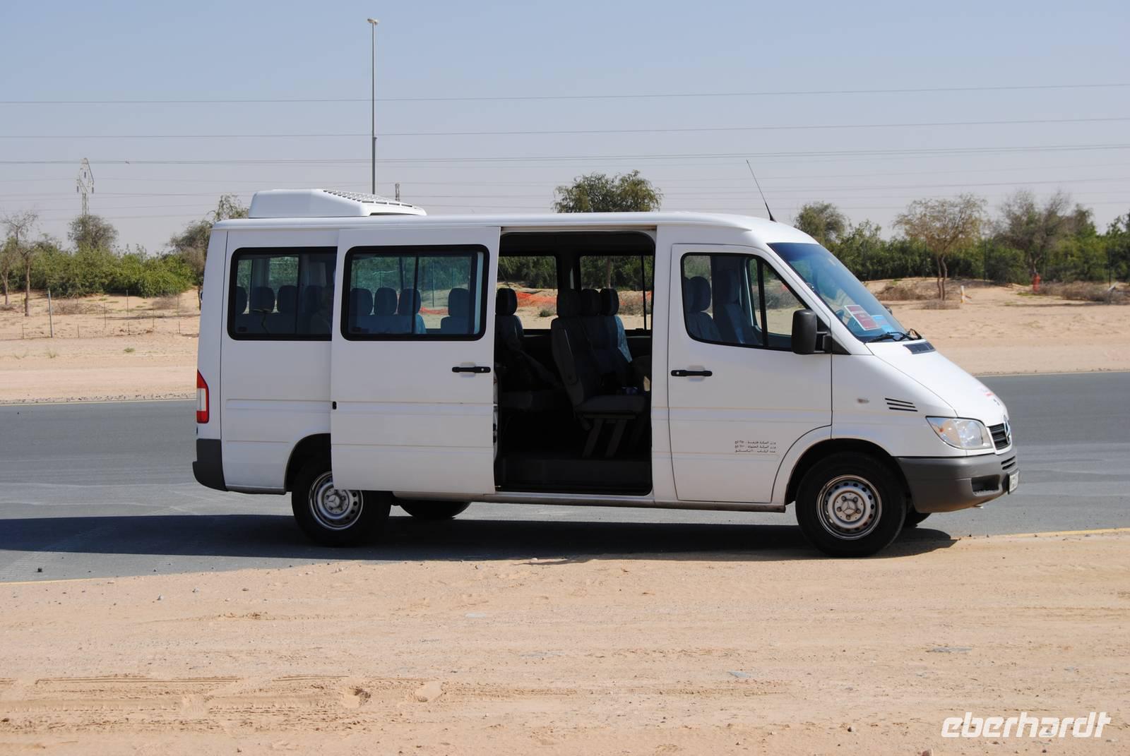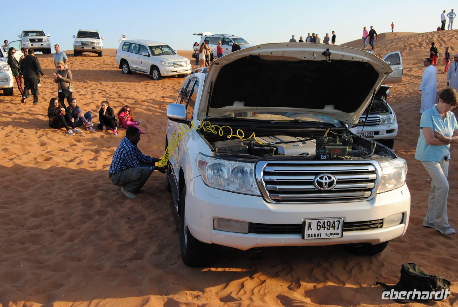 Am Morgen fuhren wir in das Nachbaremirat Sharjah, dem drittgrößten Emirat. Zunächst fuhren wir an die King-Faisal-Moschee und besuchten den Fischmarkt, auf dem man sämtliche Fischarten aus dem Persischen Golf in Hülle und Fülle frisch zu kaufen bekommt. Gleich nebenan befindet sich auch der Gemüse- und Obstmarkt sowie der Blaue Souk, die wir ebenfalls besuchten. Am Nachmittag wurden wir dann an unserem Hotel von drei Jeeps zur Wüstensafari abgeholt und wir fuhren zunächst etwas außerhalb von Dubai an den Wüstenrand, um den Reifendruck abzulassen. Anschließend ging es durch die unendliche Weite der Wüstenlandschaft mit dem Jeep, bevor wir pünktlich zum Sonnenuntergang das Wüstencamp erreichten. Im Camp nahmen wir dann unter sternenklarem Himmel auf gemütlichen Sitzkissen Platz und machten es uns bei gegrilltem und frisch gebackenem Fladenbrot bequem und genossen das orientalische Programm.