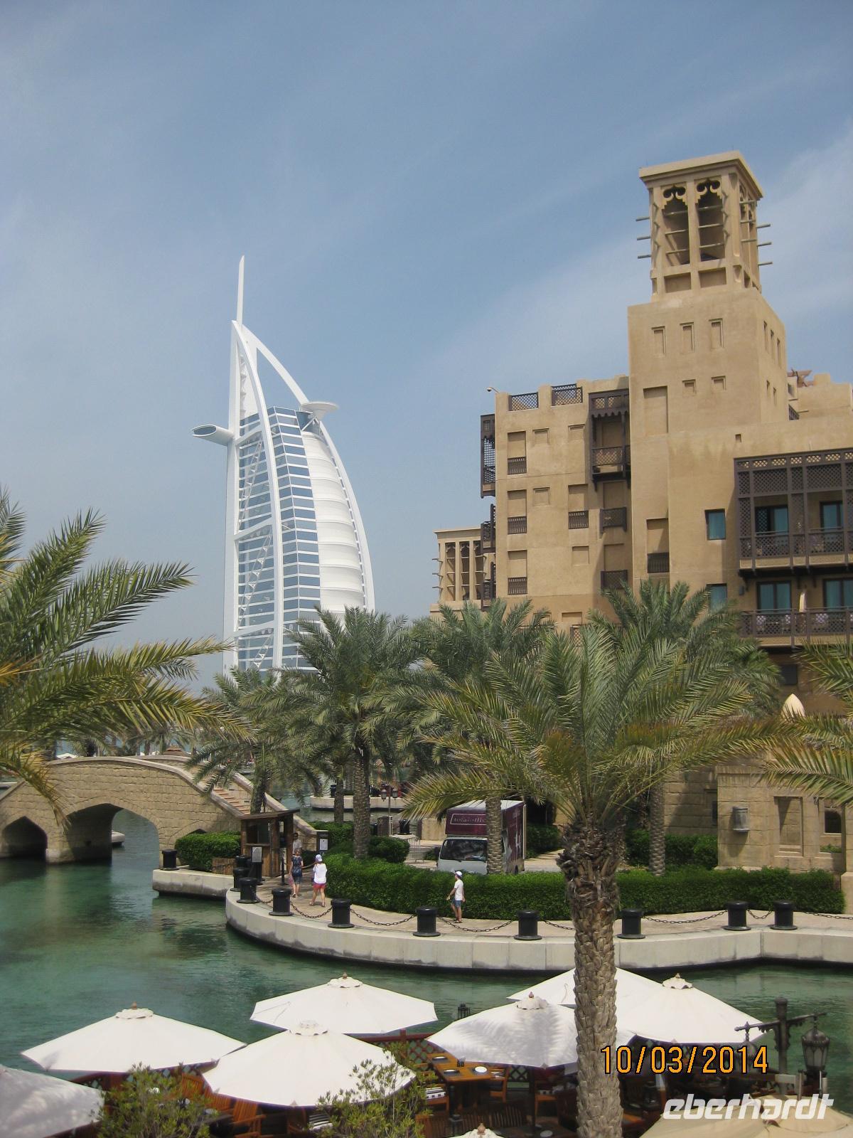 Heute starten wir noch einmal ganz in Ruhe in den Tag und nutzen die heutige späte Abfahrt, um früh ein wenig länger auszuschlafen, einen kleinen Spaziergang durch die Umgebung zu unternehmen oder den Pool des Hotels zu testen. Gegen Mittag machen wir uns dann wieder gemeinsam auf den Weg. Heute steht ein exklsuives Mittagessen im Hotel Burj al Arab auf dem Programm. Vor diesem schauen wir uns aber noch einen kleinen sehr hübsch angelegten Souk/Markt von Dubai an. In diesem Falle geht es um den Madinat Jumairah Souk, welcher zum Verweilen und schlendern einlädt. Auch als klein Venedig wird dieser kleine Ort bezeichnet, da sich kleinere Flussarme um die einzelnen Gebäude mit ihren kleinen Geschäften schlängeln.
