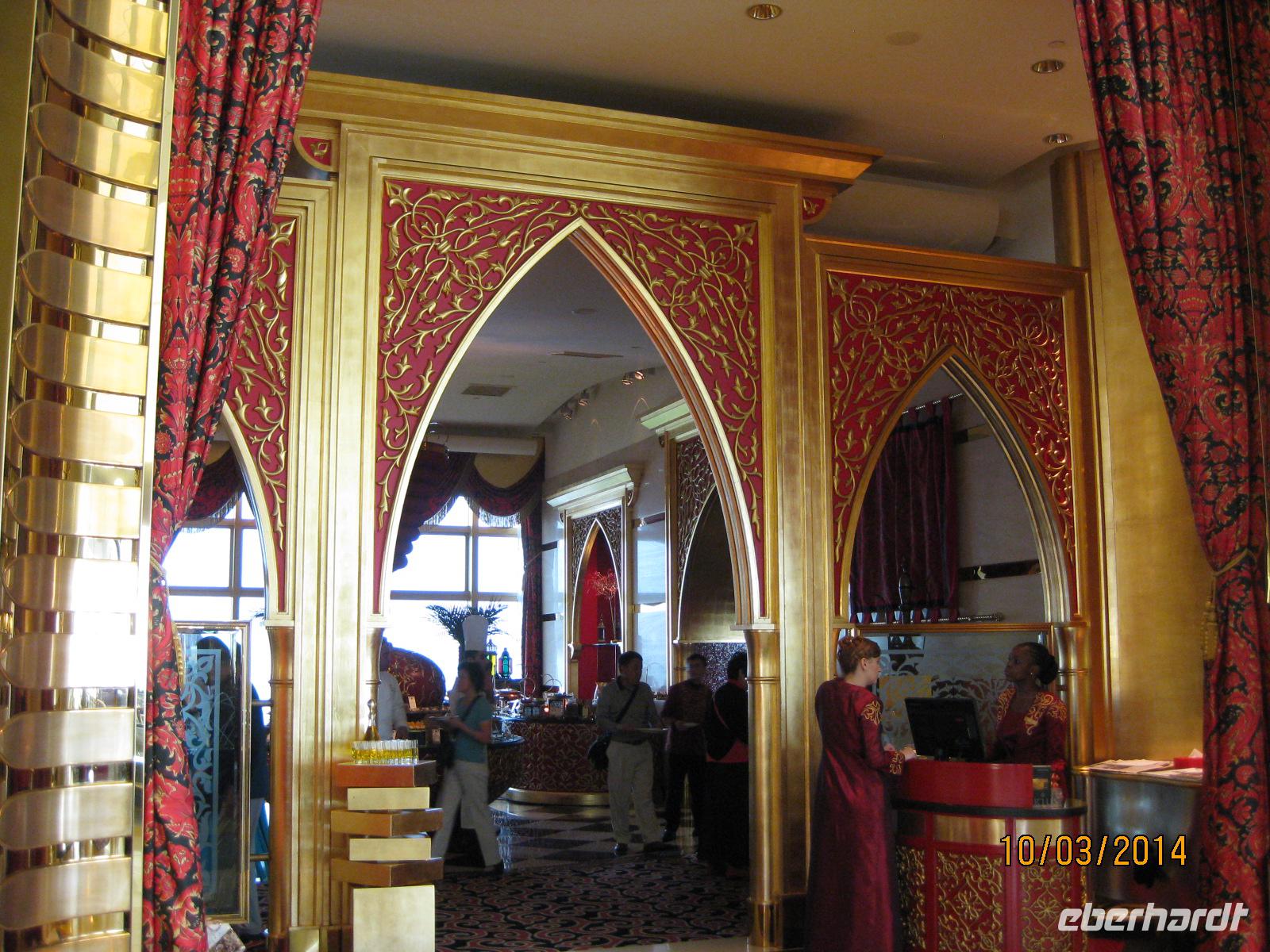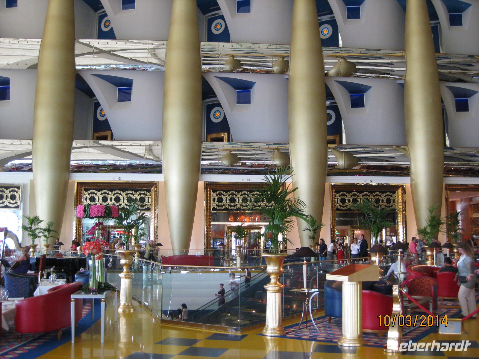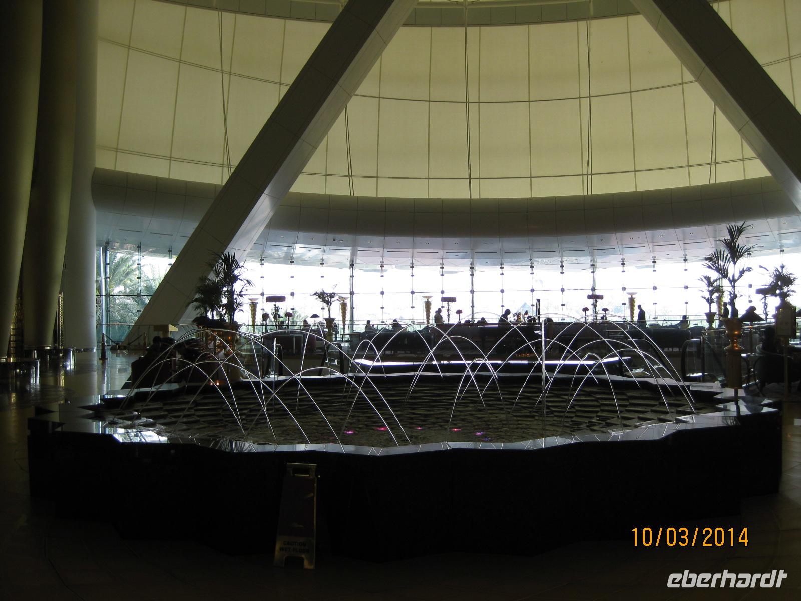 Danach heißt es, noch einmal die Krawatte zurechtrücken und dann geht es schon los zum Mitaggessen im exklusiven Hotel Burj al Arab. Bereits mit großen Augen treten wir in das Hotel ein und genießen im Restaurant des Hotels ein wirklich vorzügliches Mittagessen mit Hummer, Muscheln, Lamm und vielen kleinen süßen Leckereien als Dessert. Da fällt es schwer, von etwas nicht zu probieren. Im direkten Anschluss daran versuchen wir möglichst noch einen Blick in die kleinsten Ecken des Hotels zu erhaschen. Und auch dieses Erlebnis ist einfach unbeschreiblich beeindruckend für uns.