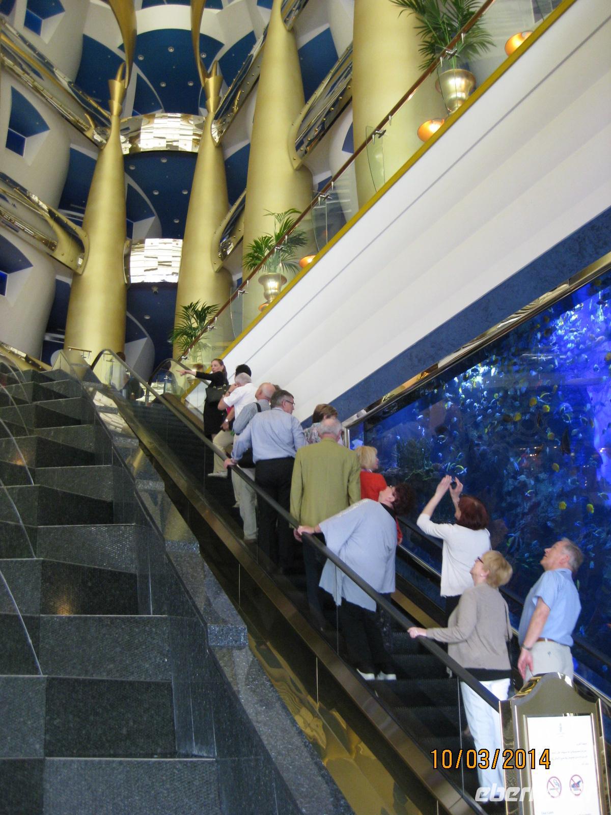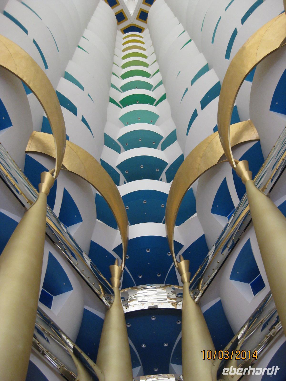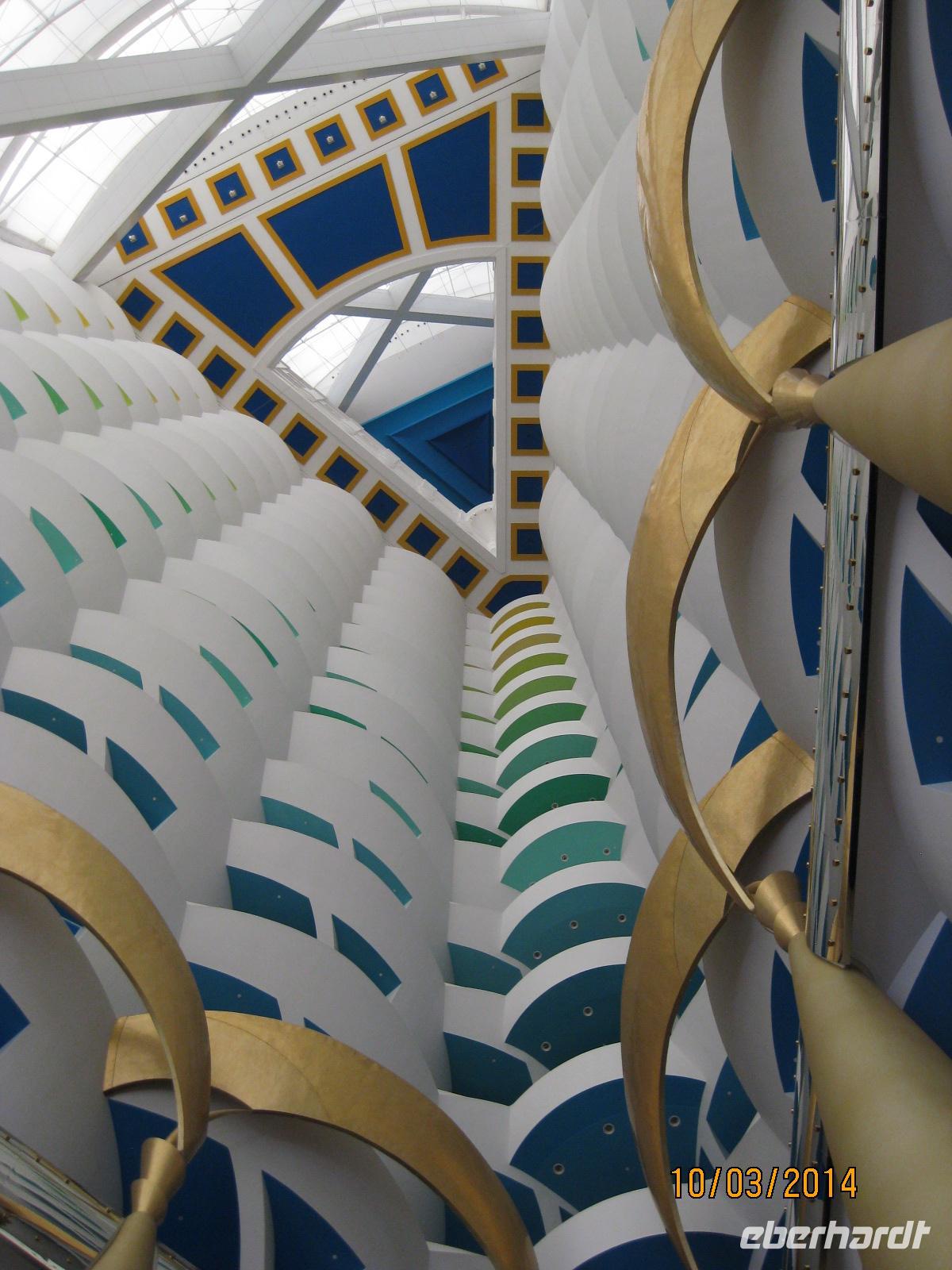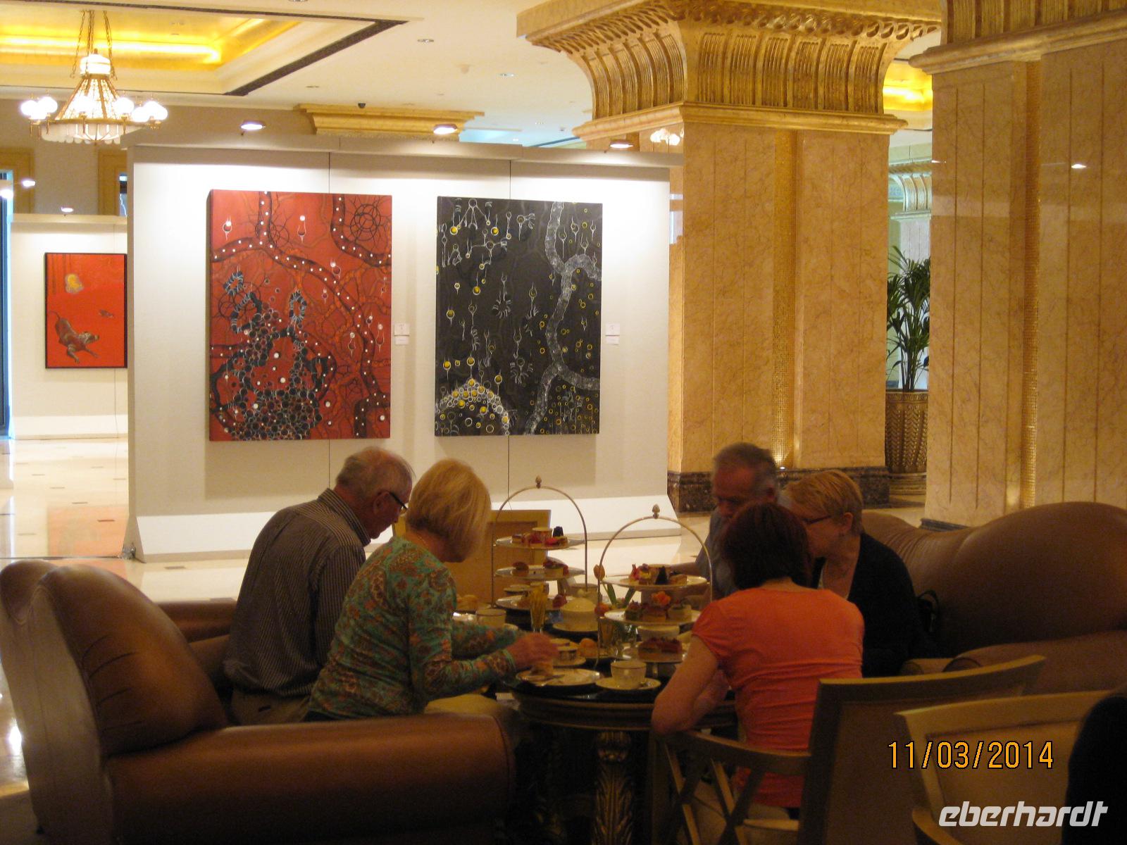 Danach heißt es, noch einmal die Krawatte zurechtrücken und dann geht es schon los zum Mitaggessen im exklusiven Hotel Burj al Arab. Bereits mit großen Augen treten wir in das Hotel ein und genießen im Restaurant des Hotels ein wirklich vorzügliches Mittagessen mit Hummer, Muscheln, Lamm und vielen kleinen süßen Leckereien als Dessert. Da fällt es schwer, von etwas nicht zu probieren. Im direkten Anschluss daran versuchen wir möglichst noch einen Blick in die kleinsten Ecken des Hotels zu erhaschen. Und auch dieses Erlebnis ist einfach unbeschreiblich beeindruckend für uns.
