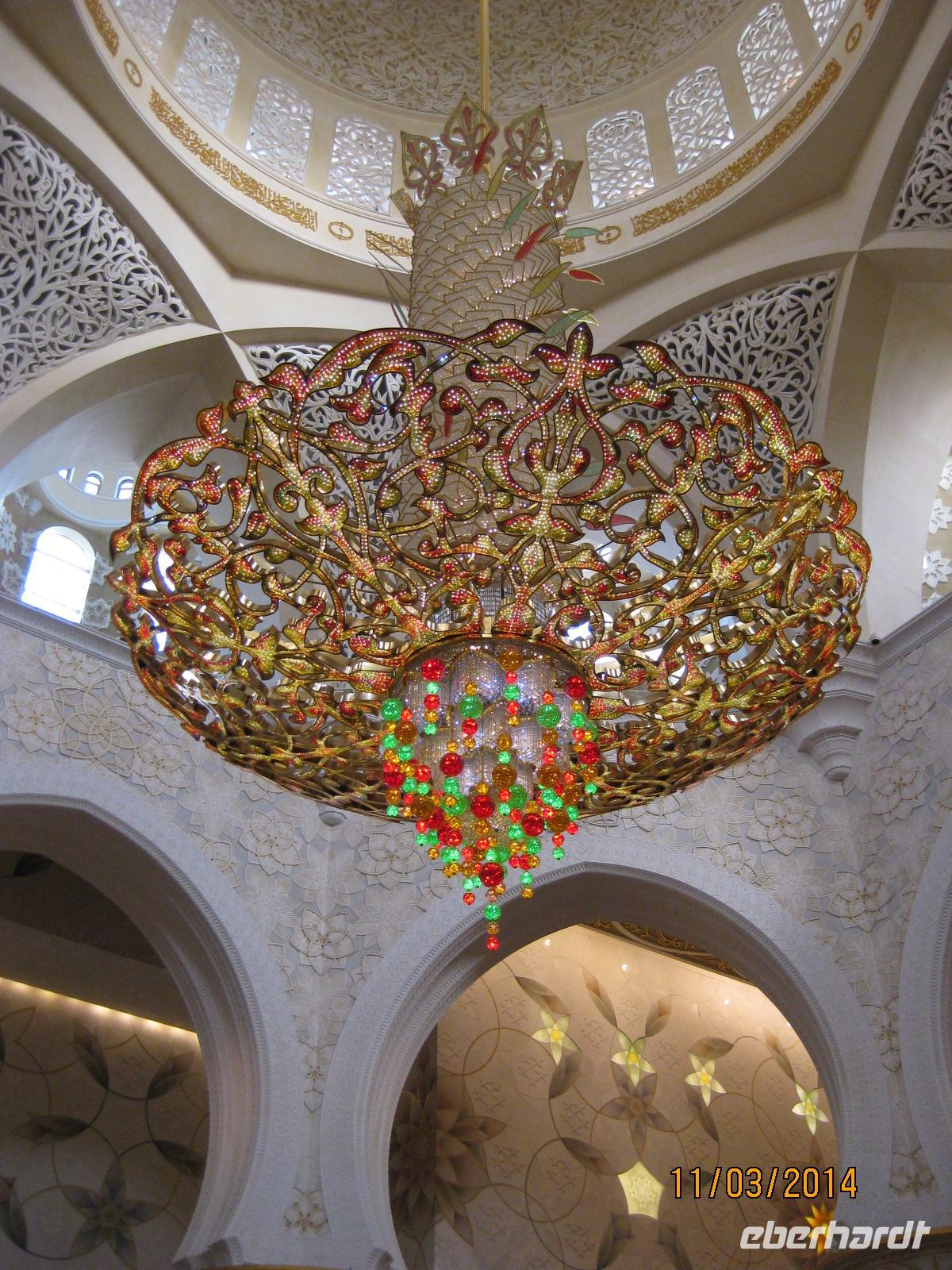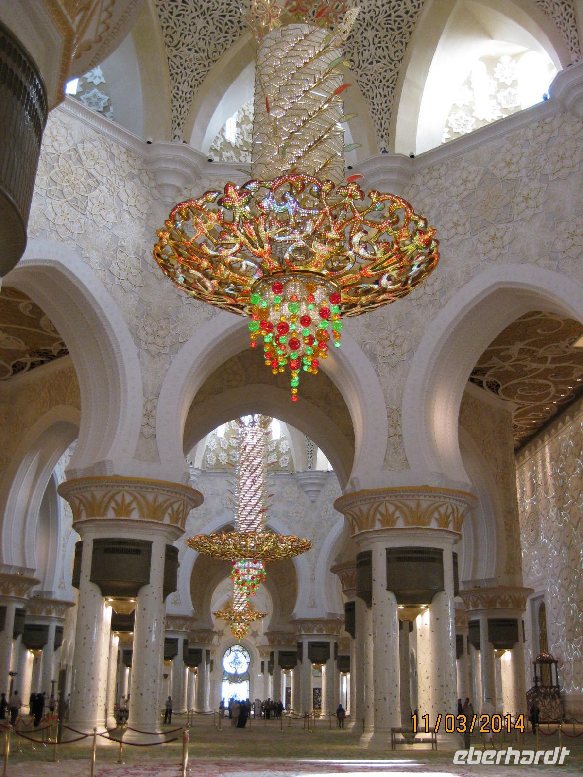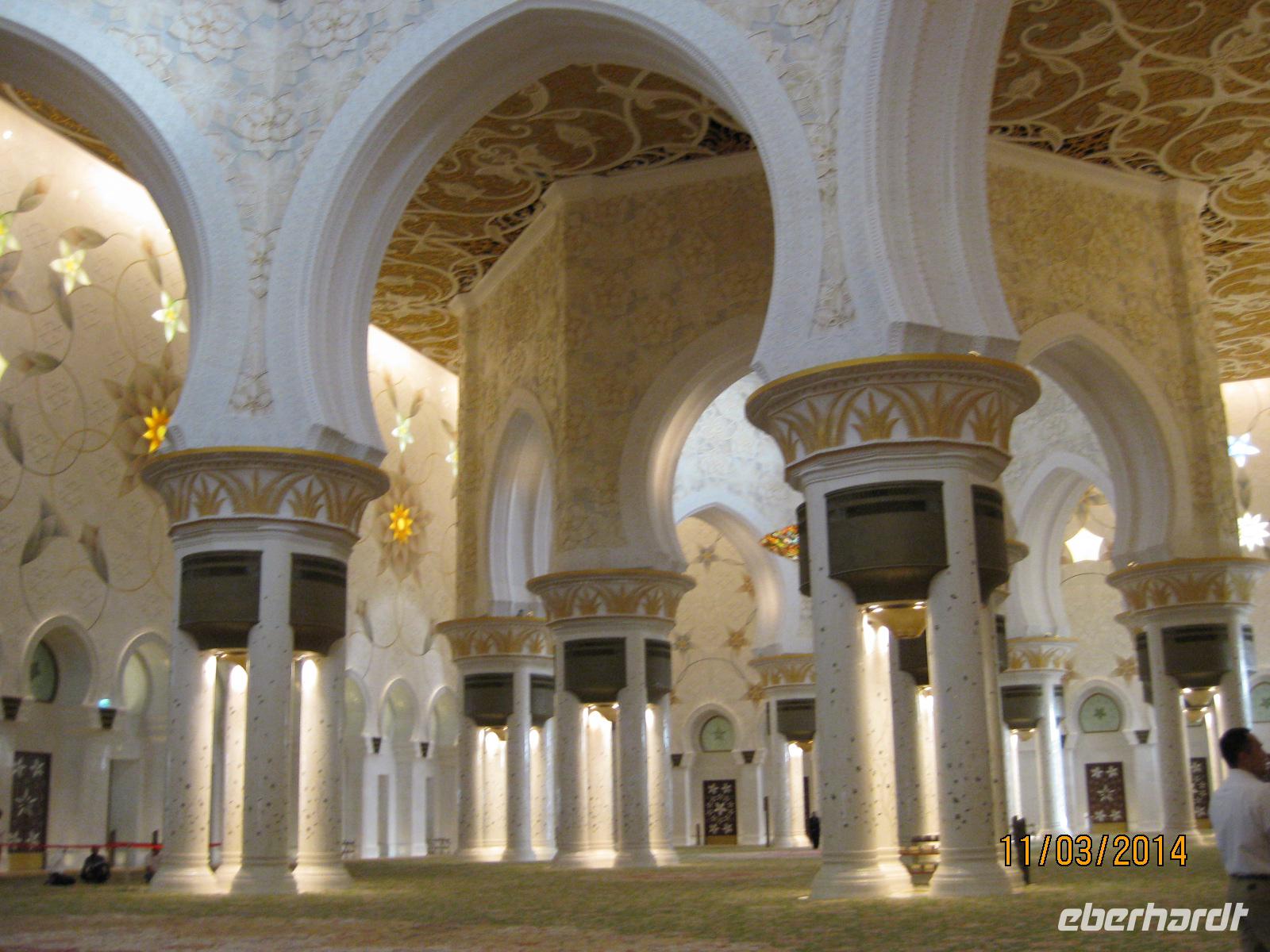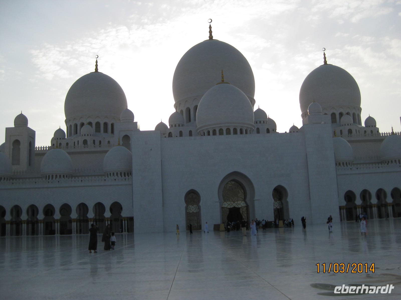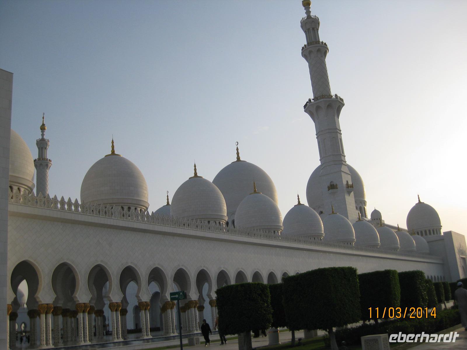 Als ersten Punkt in der Stadt Abu Dhabi selbst steuern wir das Heritage Village an. Dabei handelt es sich um ein sehr schönes Naturkundemuseum, welches uns in die vergangene Zeit der Region entführt und einen wirklich traumhaften Blick auf die Skyline der Stadt Abu Dhabi bietet. Am Nachmittag möchten wir uns auch heute wieder ganz vornehm stärken und wählen dabei natürlich das Hotel Emirates Palace, wo wir einen vornehmlich und vor allem sehr genüsslichen High Tea (gehobene Teestunde) genießen. So exklusiv gestärkt, begeben wir uns am Nachmittag noch zum Besuch der Sheikh Zayed Moschee. Bereits von weitem kommen wir ins Stauen beim Anblick der Moschee. Wichtig für unseren Besuch ist vor allem das Daranhalten, dass wir Frauen uns möglichst von oben bis unten komplett bedecken, um die Religion zu wahren und ihr vor allem Respekt entgegenzubringen. Voller Staunen laufen wir durch die Moschee und unsere Reiseleiterin Anja gibt uns noch einen schönen Einblick in die Religion.