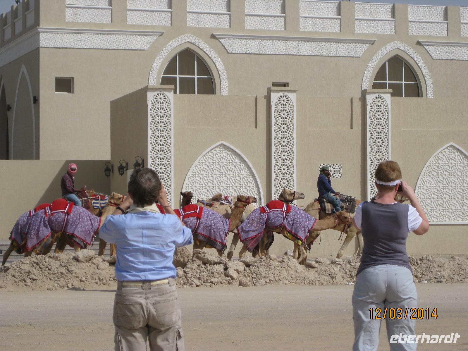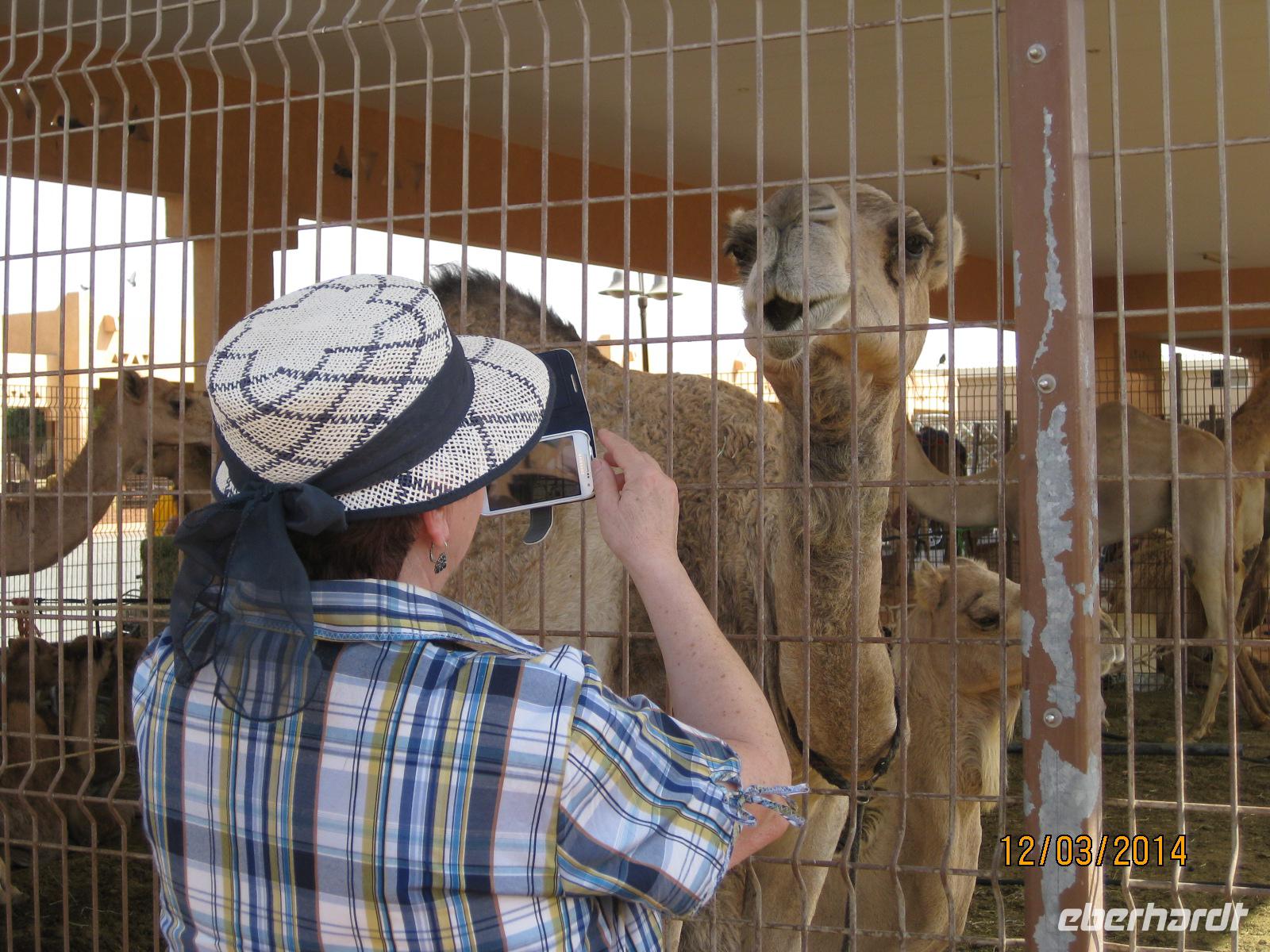 Den heutigen Tag widmen wir ganz der Oasenstadt Al Ain. Nach dem Frühstück starten wir zu unserem Ausflug. Ca. 2 Stunden dauert unsere Fahrt bis in die Oasenstadt. Bevor wir diese aber erreichen, machen wir noch einen Halt an der Kamelrennstrecke. Hier gewinnen wir einmal einen Einblick in den hier doch sehr bekannten Sport und können uns ein solches Rennen vom Ablauf nun sehr gut vorstellen. Einige Kamelrenngruppen können wir sogar von ganz nah beobachten während diese an uns vorbeiziehen.
