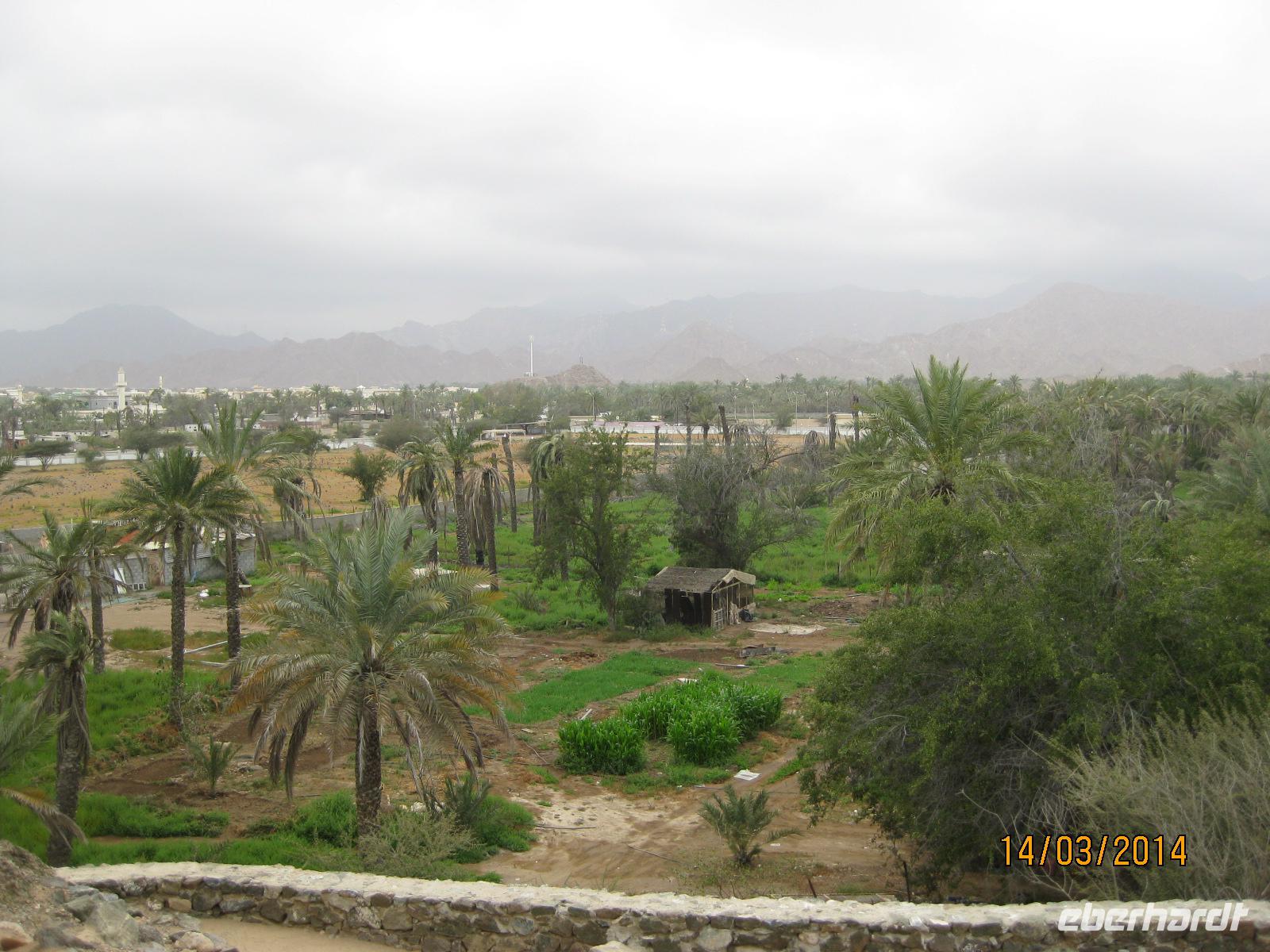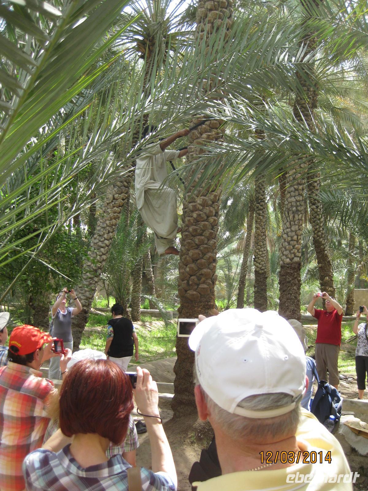 Neben dem Museum werfen wir danach einen Blick in die Oase von Al Ain. Daher stammt auch der Name der Stadt und man kann es kaum glauben, dass man einen solch grünen Punkt inmitten der Wüste entdecken kann. Ein wahre Augnweide sind die Dattelpalmen, welche weit in die Höhe ragen. Hier dürfen wir auch einmal bei der Ernte der Datteln zu schauen und natürlich die süßen Früchte auch probieren. Letztendlich stellen wir aber fest, wie hart die Arbeit der Palmenkletterer ist.