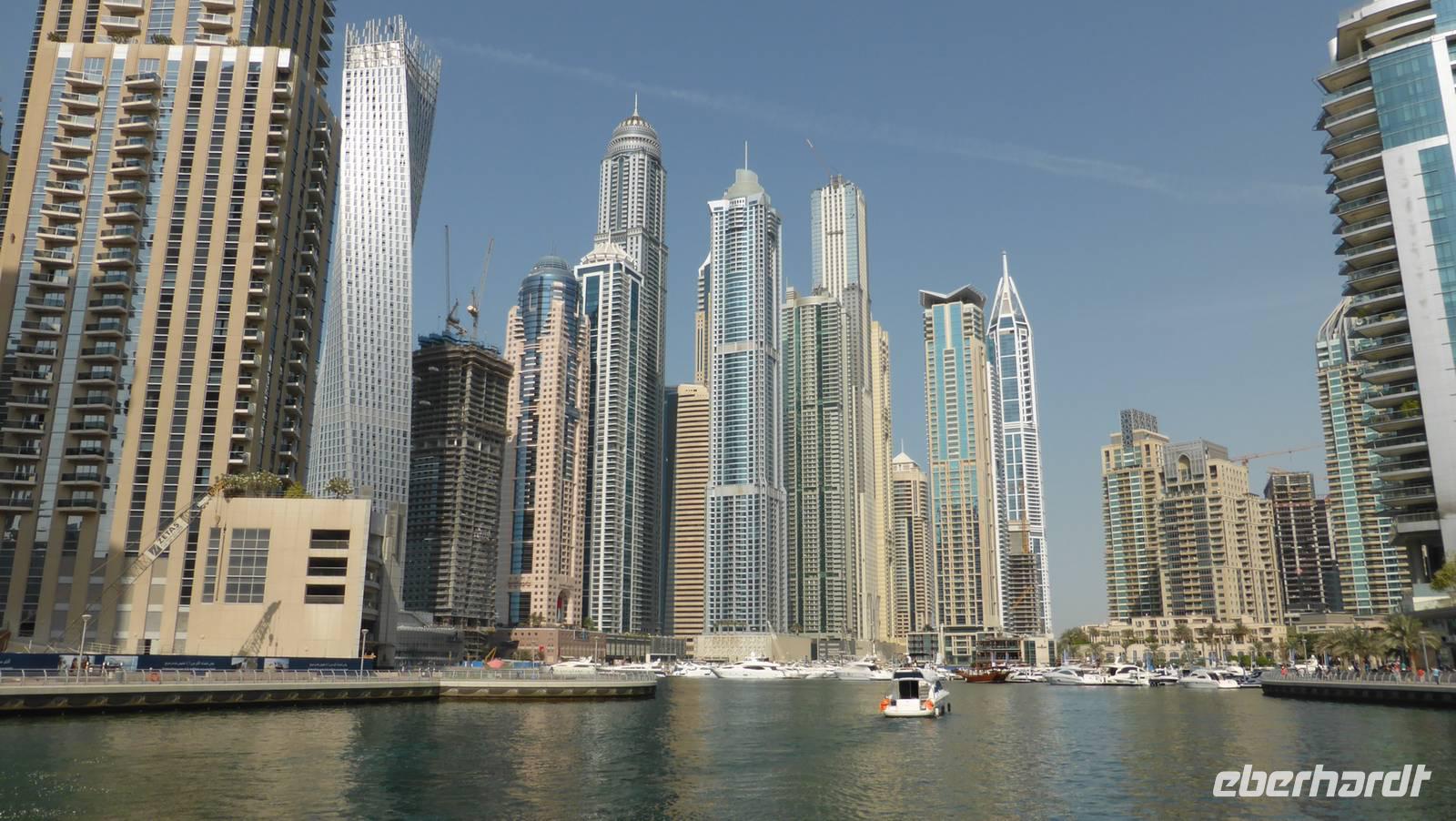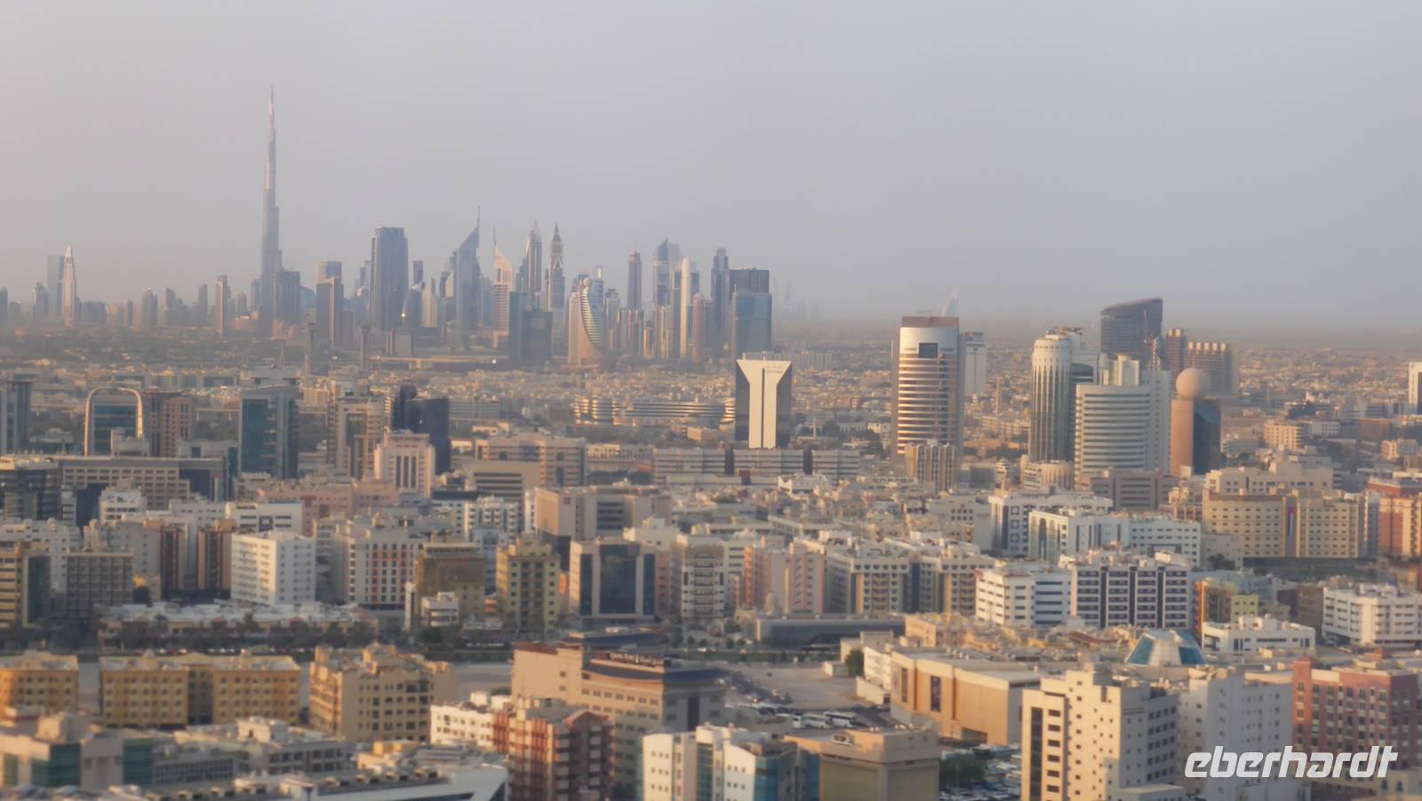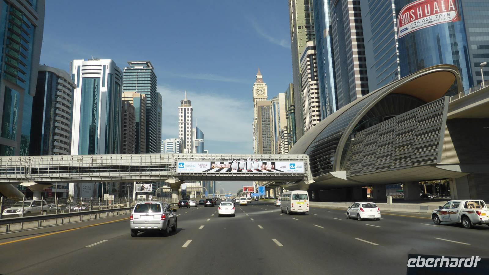 Etwas müde aufgrund der nächtlichen Anreise kehren wir am Nachmittag zurück ins Hotel. Dabei durchfahren wir das erste Mal den „Hochhauscanyon" der Shaikh Zayed Road, der uns angesichts der Höhe und Fülle der Wolkenkratzer ganz winzig erscheinen lässt. Hier bekommen wir auch schon mal eine erste Vorstellung von den Ausmaßen des Burj Khalifa, welcher morgen auf unserem Programm steht.