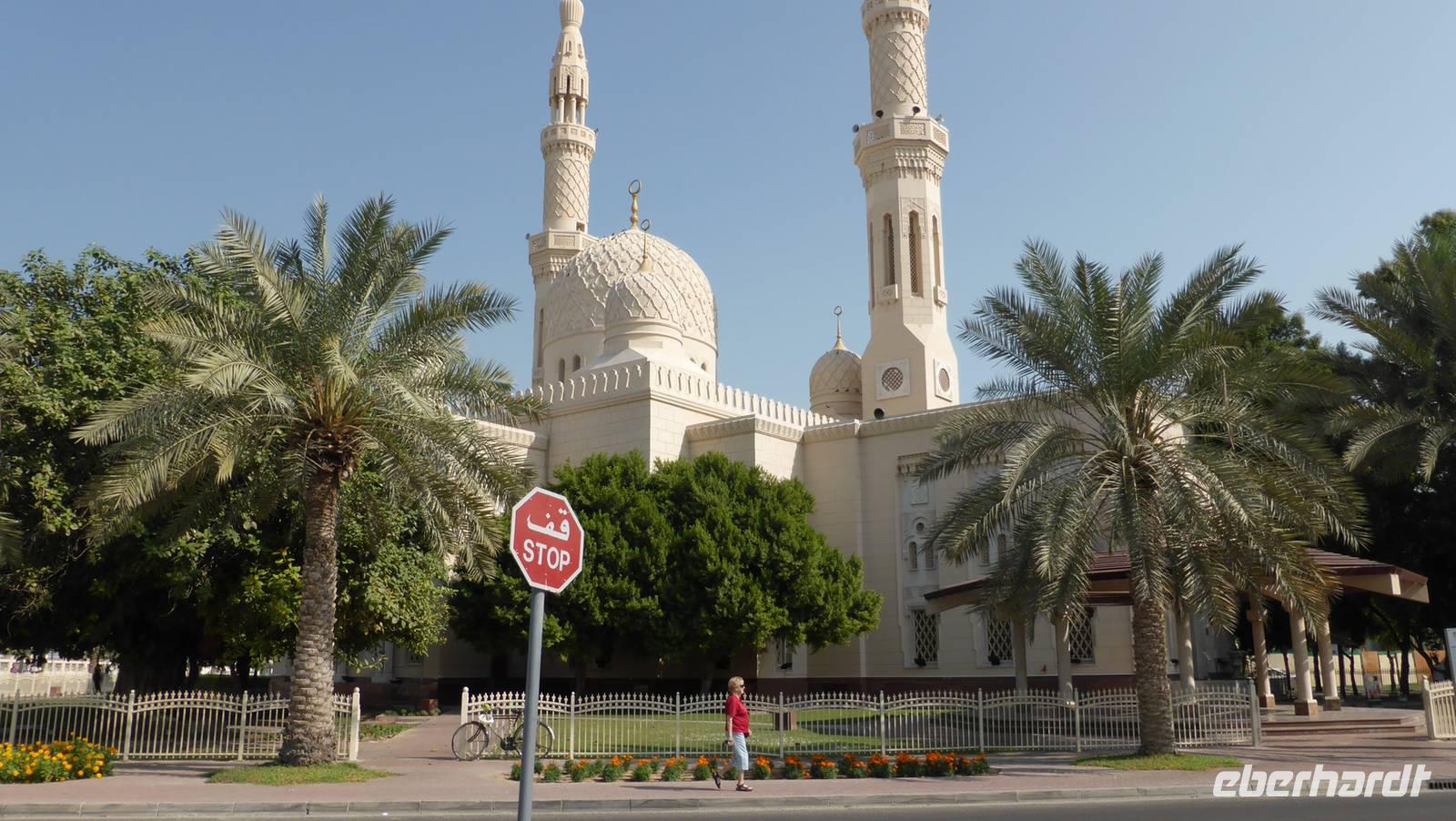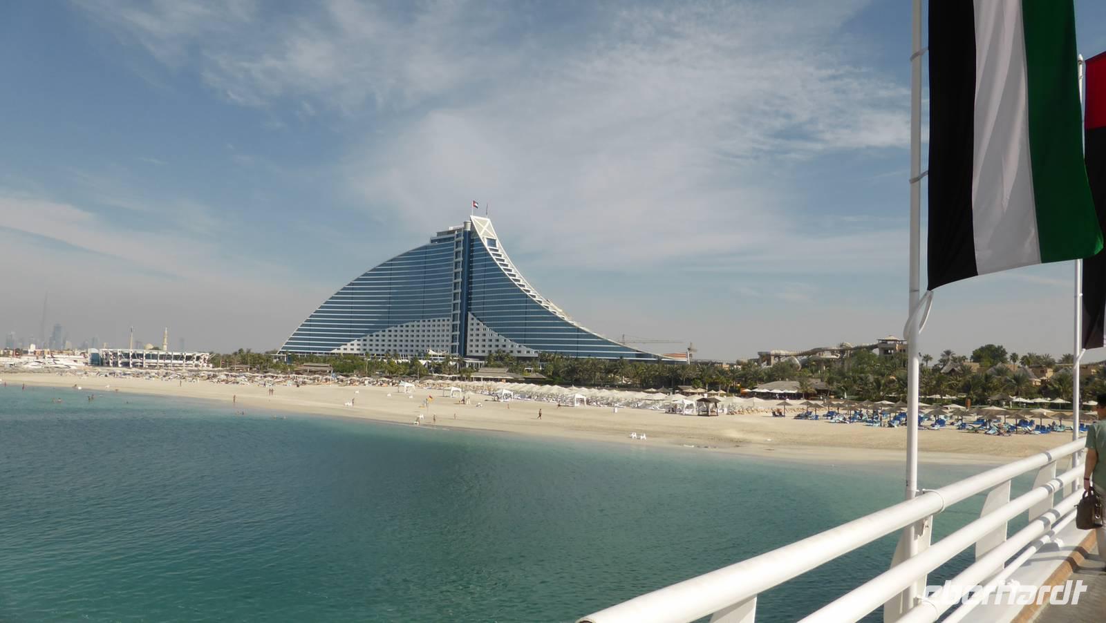 Mit Anja, unserer Begleiterin vor Ort und unserem Busfahrer Omar aus Pakistan beginnen wir unsere Stadtrundfahrt durch das moderne Dubai. Wir werfen einen Blick auf die Jumairah Moschee und das Burj Al Arab am Strand von Jumairah. Übermorgen werden wir das berühmte 7-Sterne Hotel Burj Al Arab während eines Mittagessens besichtigen können.