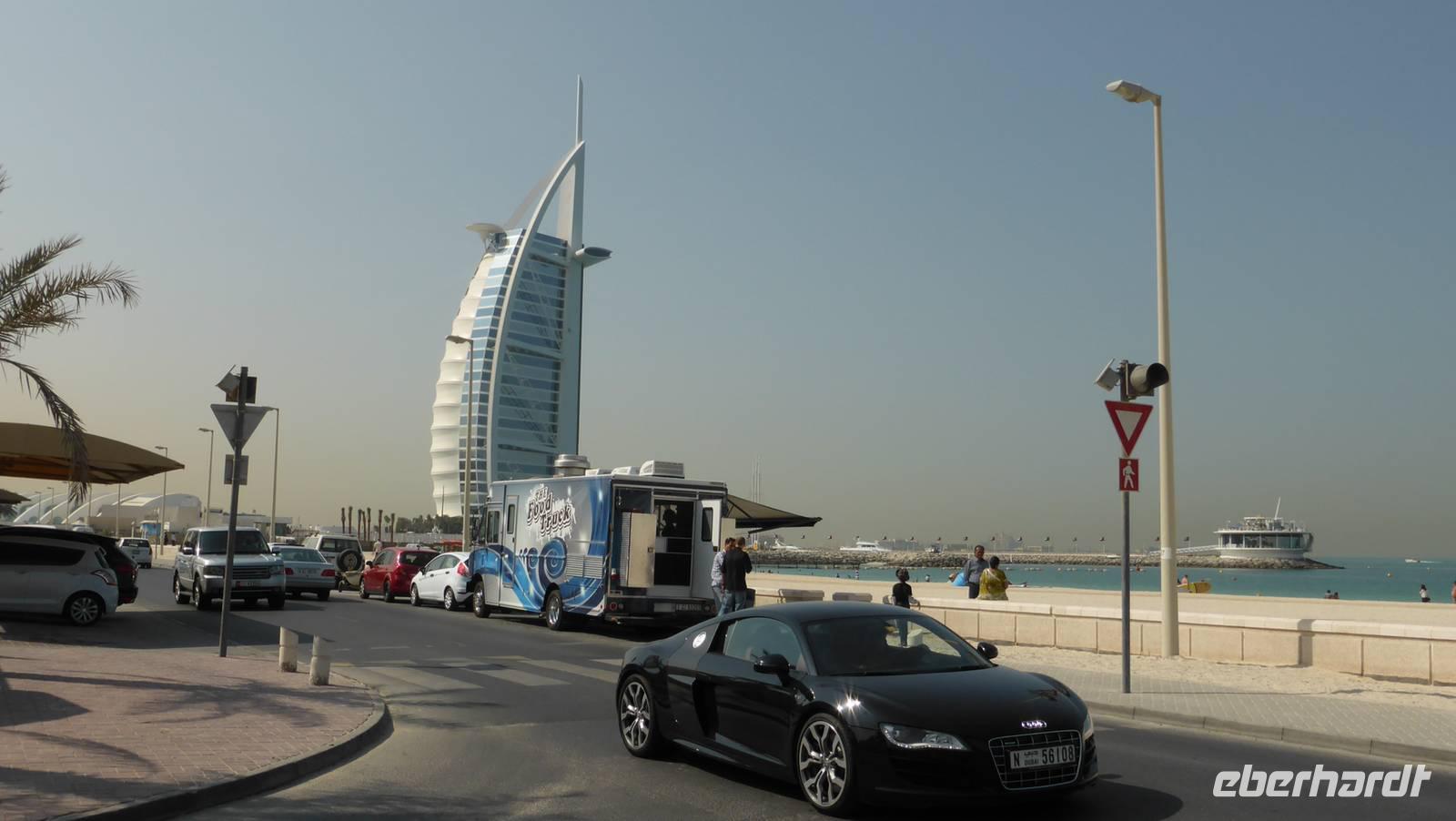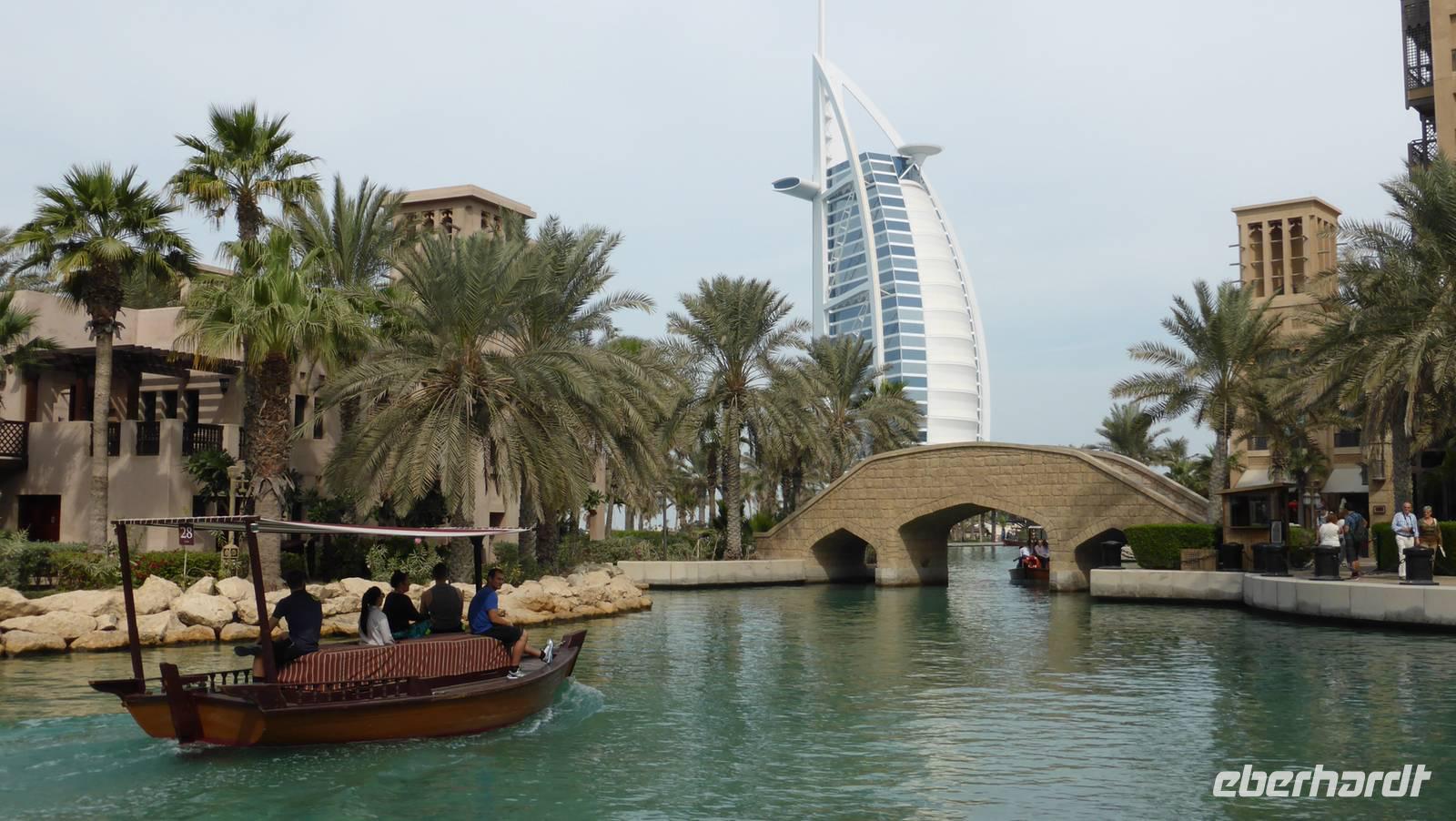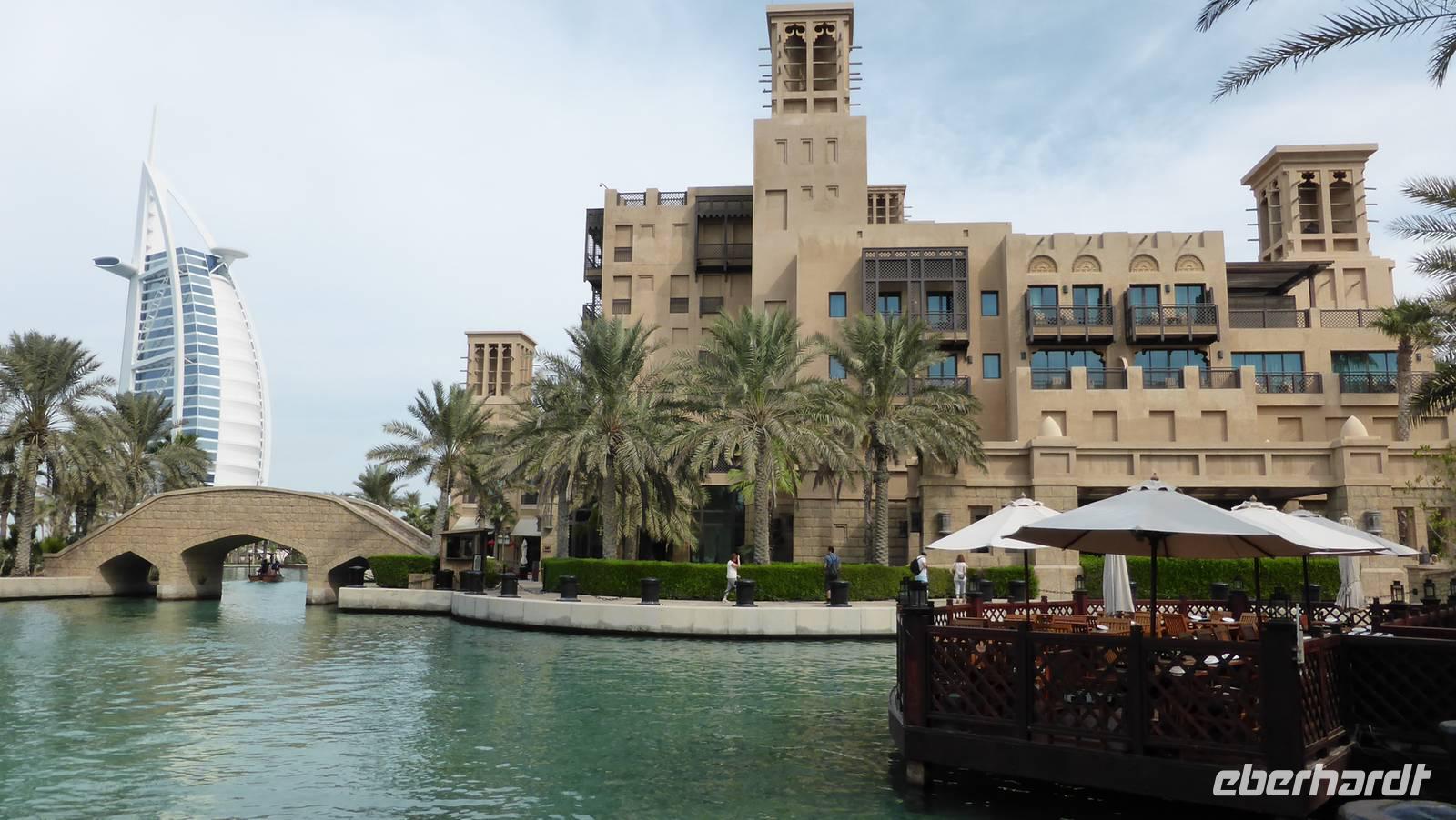 Wir werfen uns also in Schale und machen zunächst Halt im Madinat Souk (Madinat Jumairah), einem 2004 fertiggestellten Viertel neben dem Burj Al Arab. Das Viertel besteht aus einem Ensemble von Lagunen, Hotels, Restaurants und Geschäften im traditionellen „Windtturmstil". Von hier ergeben sich tolle Ausblicke auf das Burj Al Arab.