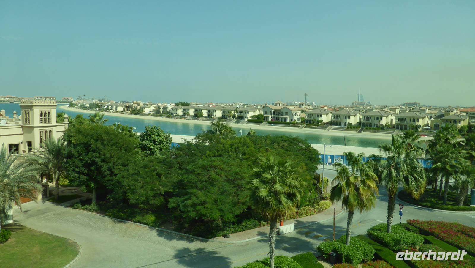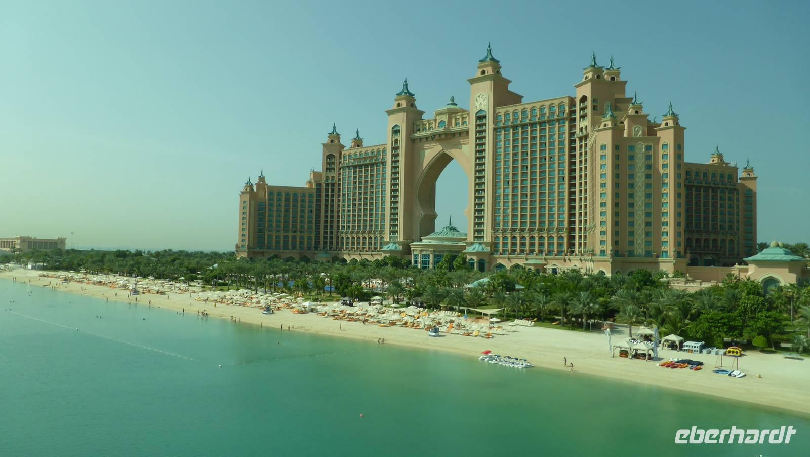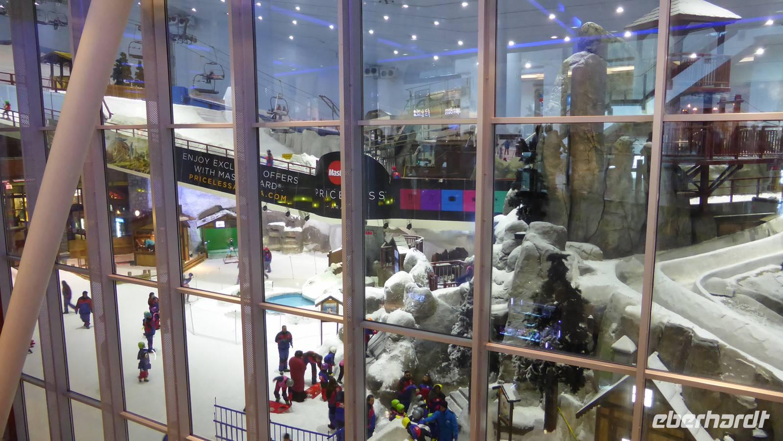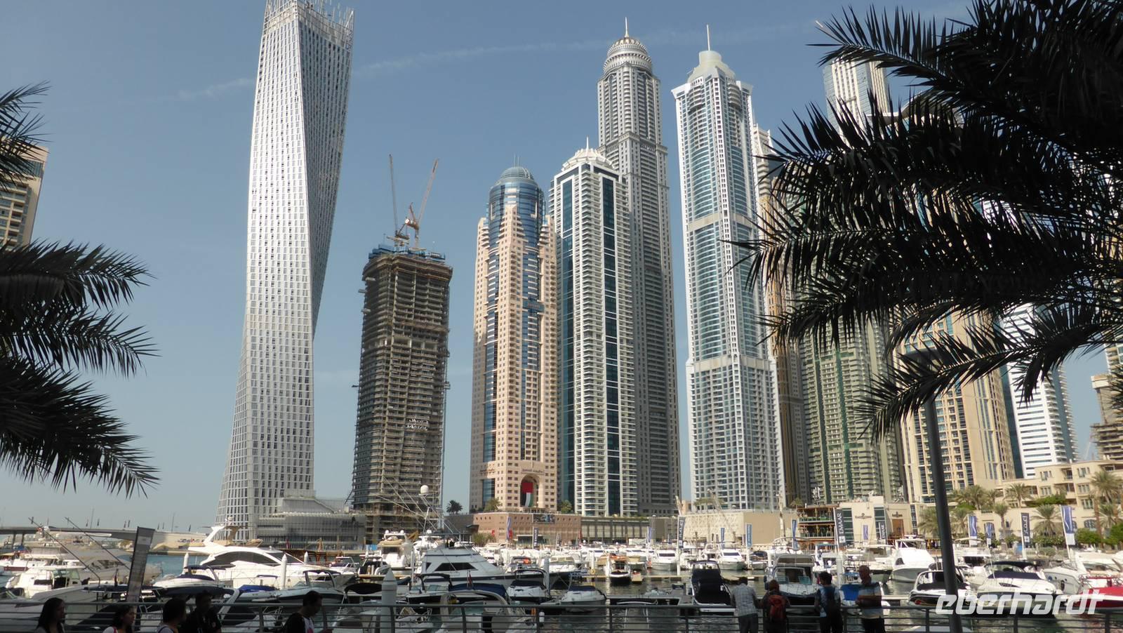 Von hier aus kann man in der Ferne schon die größte künstliche Insel der Welt, die Palmeninsel „Palm Jumairah" erkennen. Mit der Monorail, der inseleigenen Hochbahn, fahren wir auf dem Palmenstamm auf das Atlantis-Hotel zu. Von der Monorailstation am Atlantis haben wir Aussicht auf den Wassererlebnispark mit seinen vielen Rutschen - kann man sich schon mal als Ausflugsziel für unseren freien Tag vormerken. Das Atlantishotel ist mit rund 1.500 Betten das zweitgrößte Hotel Dubais und wurde 2010 während der Immobilien- und Finanzkrise an einen ausländischen Investor verkauft. Beim Verlassen von Palm Jumairah passieren wir einen riesigen Kreisverkehr. In diesem Kreisverkehr entsteht mit Dubai Pearl, entworfen von einem Hamburger Architekten, ein ganzer Stadtteil. Hier sehen wir auch die erste Straßenbahn Dubais, erst vor wenigen Tagen in Betrieb gegangen. Sie führt bis in die Dubai Marina, wo wir unseren nächsten Halt machen und an der künstlichen Lagune einen kleinen Spaziergang unternehmen. Viele der Wolkenkratzer hier erreichen mehr als 300 Meter, das höchste Wohngebäude der Welt sogar 414 Meter. Von Weitem kann man schon unser nächstes Ziel erkennen - die Skihalle Dubais. Ihre Aluminiumhülle glänzt in der Sonne und sorgt zusammen mit einer guten Dämmung dafür, dass sich der Energieverbrauch in Grenzen hält. Wir sollten also diese Skihalle nicht voreilig als Energieverschwender verurteilen, zumal wir in Deutschland trotz hervorragender Wintersportbedingungen in den Gebirgen auch noch Skihallen bauen. Gönnen wir also den Einwohnern Dubais auch das Skivergnügen! Die Skihalle ist Teil der 2005 eröffneten MoE, der Mall of the Emirates. So können wir von der Mall aus, quasi durch´s „Schaufenster" das Skivergnügen in nachgeahmter Alpenlandschaft aus der Nähe verfolgen.