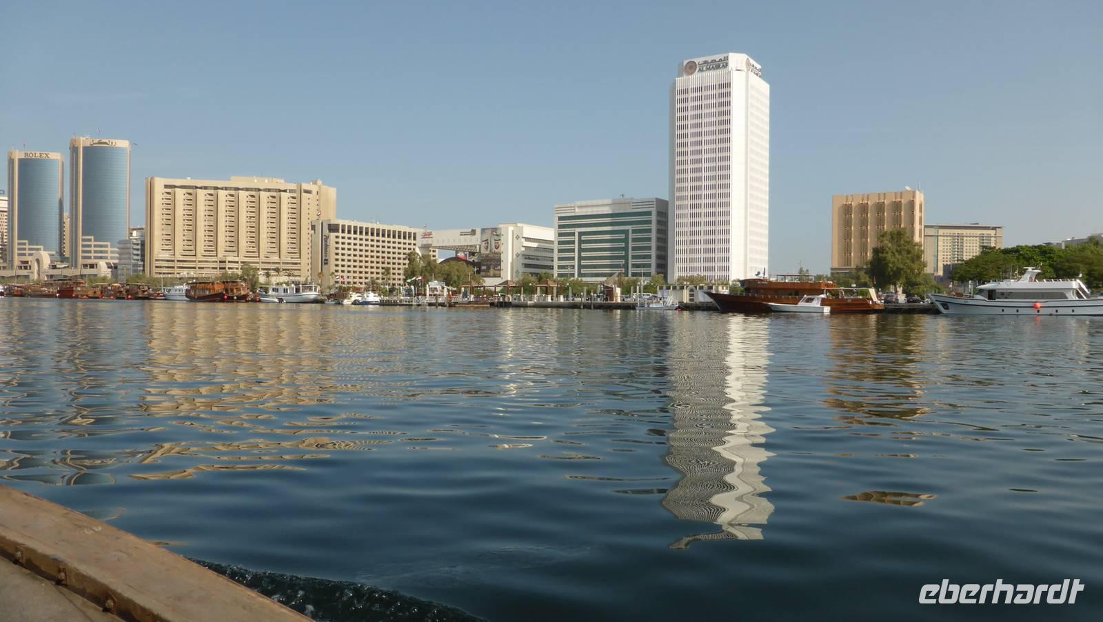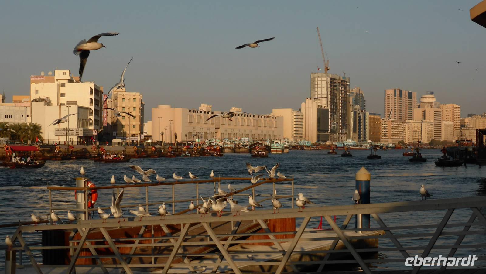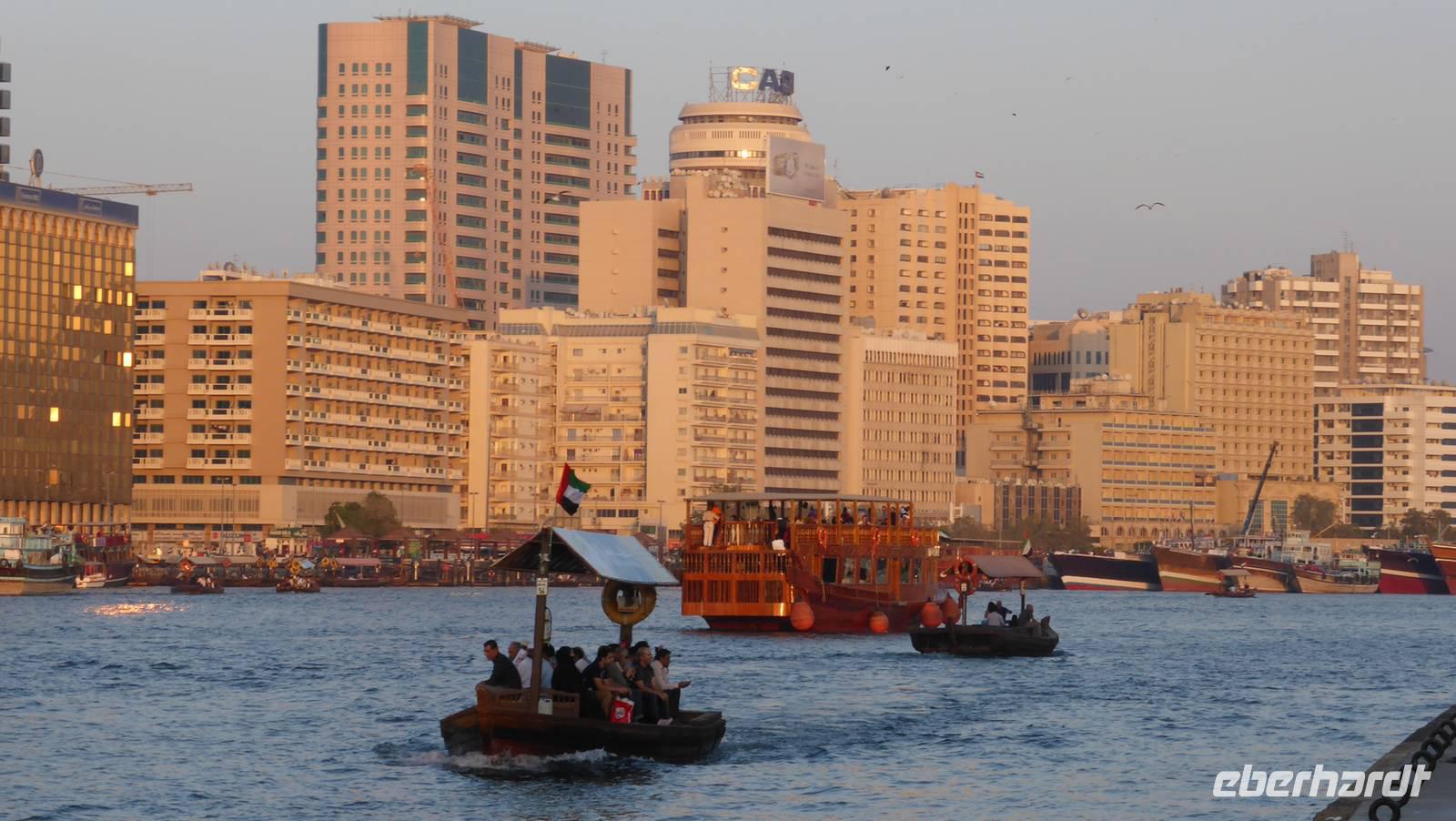 Die Lagune Dubais, Creek genannt, ist ein Meeresarm, welcher wie ein Fluss das alte Dubai in die Stadtviertel Bur Dubai (unsere Hotelseite) und Deira teilt. Hier liegen die alten Souks mit Gewürzen, Stoffen und Goldgeschäften und den traditionellen Bauten mit Windtürmen sowie die Wolkenkratzer der 1990er Jahre. Mit dem hier gebräuchlichen Wassertaxi, der Abra, unternehmen wir eine längere Fahrt entlang dieser Kulisse, bevor wir in das Markttreiben auf dem Gewürz- und Goldmarkt eintauchen.