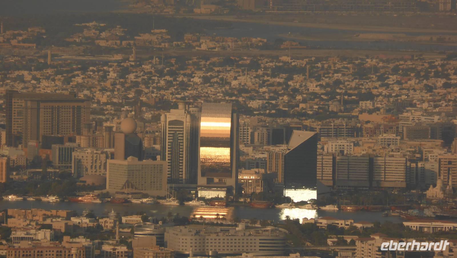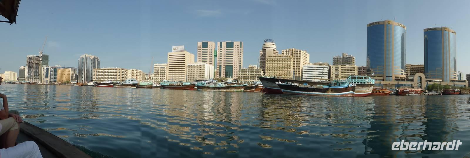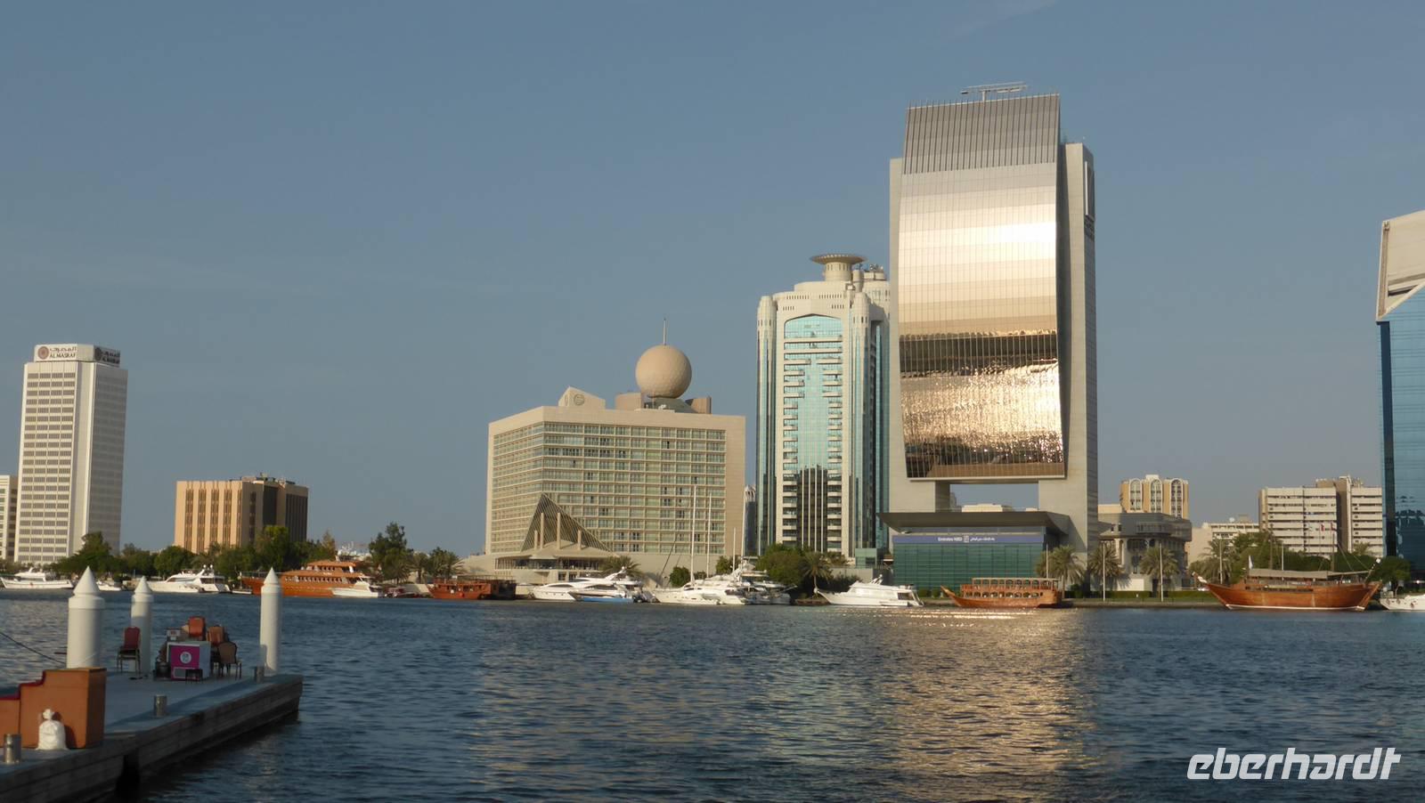 Die Lagune Dubais, Creek genannt, ist ein Meeresarm, welcher wie ein Fluss das alte Dubai in die Stadtviertel Bur Dubai (unsere Hotelseite) und Deira teilt. Hier liegen die alten Souks mit Gewürzen, Stoffen und Goldgeschäften und den traditionellen Bauten mit Windtürmen sowie die Wolkenkratzer der 1990er Jahre. Mit dem hier gebräuchlichen Wassertaxi, der Abra, unternehmen wir eine längere Fahrt entlang dieser Kulisse, bevor wir in das Markttreiben auf dem Gewürz- und Goldmarkt eintauchen.