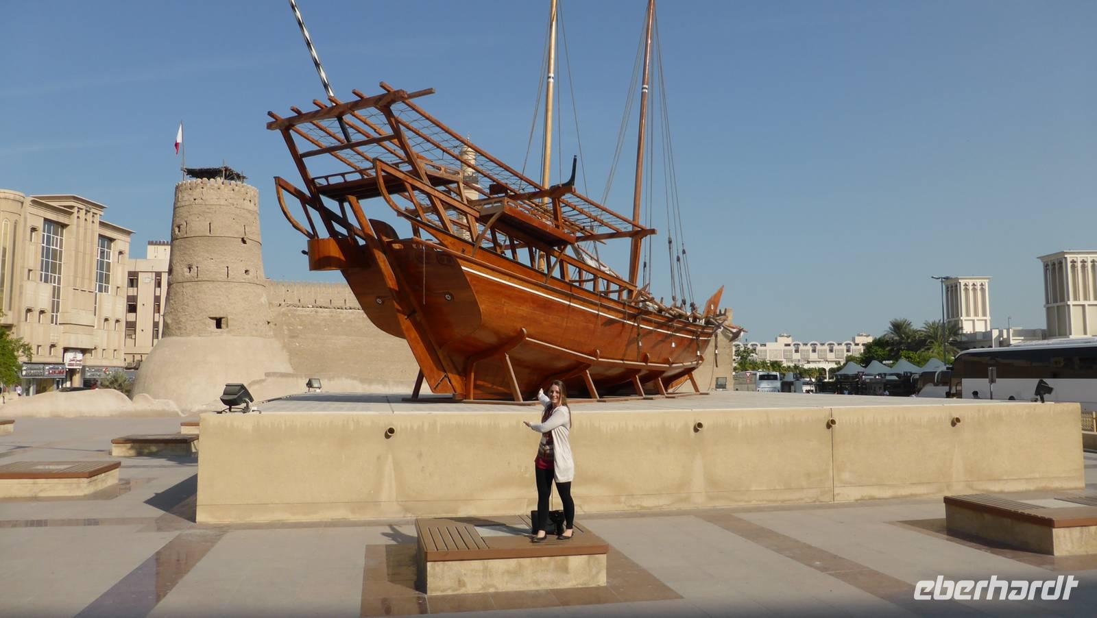 Wir haben gestern das moderne Dubai mit vielen Superlativen näher kennengelernt. Man kann diese besser verstehen, wenn man sich mit der Geschichte Dubais und dem sich daraus ergebenden Selbstverständnis als Handels-, Finanz- und Dienstleistungszentrum beschäftigt. Einen sehr anschaulichen Überblick über die Geschichte Dubais erhalten wir im Fahidi Fort, dem heutigen Dubai Museum, welches sich direkt neben unserem Hotel befindet. Was man diesem Fort von außen nicht ansieht, ist sein moderner Museumsteil im Untergeschoss.