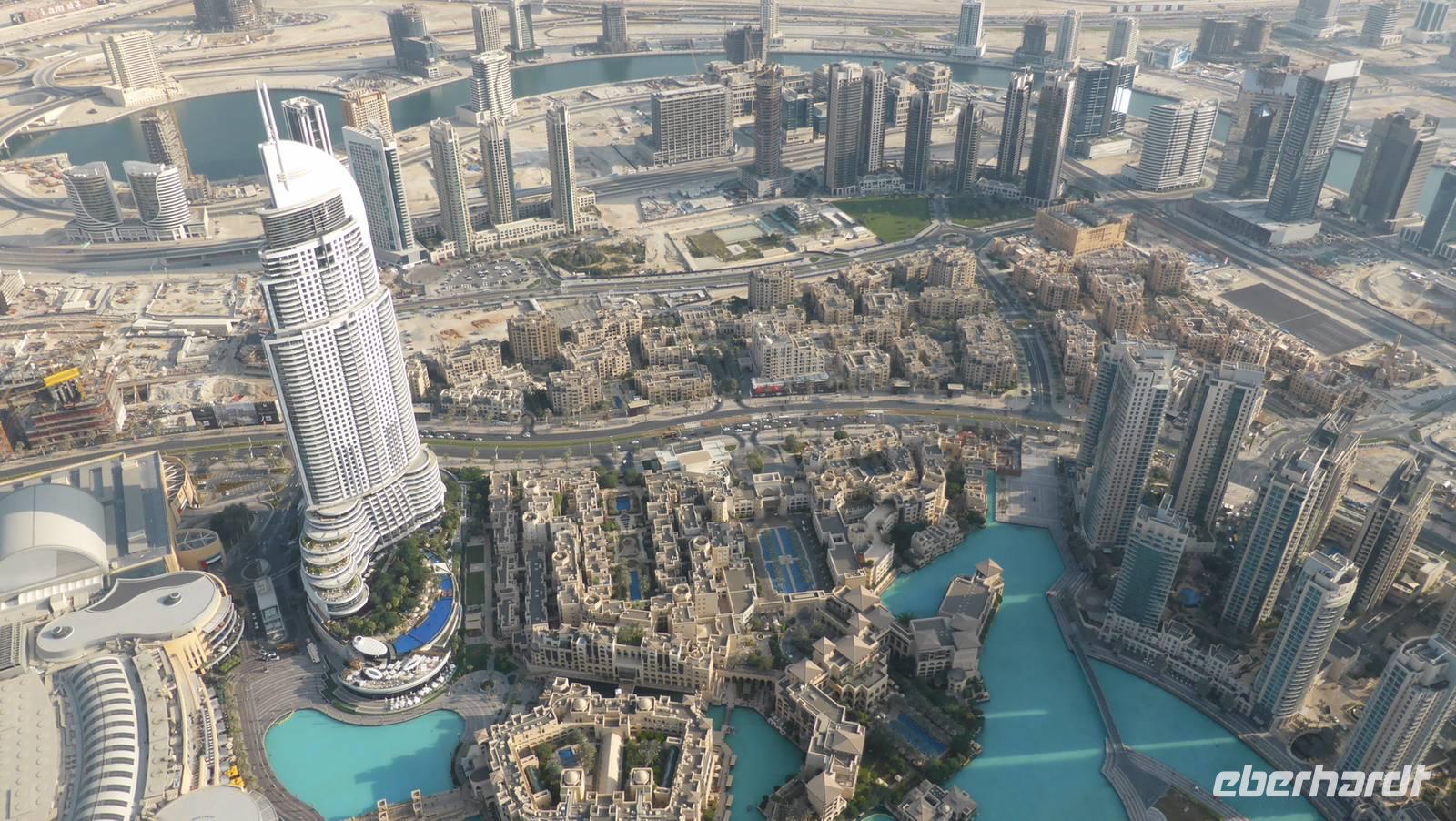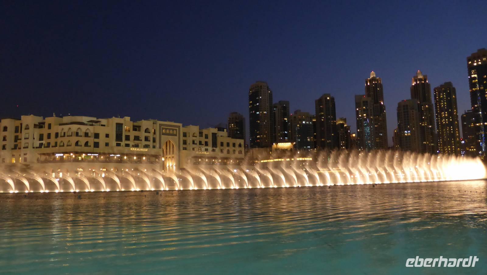 Der Nachmittag gehört Dubai Down Town, jenem neuen Stadtteil mit dem 828 Meter hohen Burj Khalifa, der riesigen Shopping Mall „Dubai Mall", einer Wasserlandschaft und dem Markt Souk Bahar im Zentrum. In der Dubai Mall, einst als weltgrößte Mall gebaut, derzeit weltweit Nr. 9, benötigen wir erstmal einen Orientierungsrundgang (Dino, Eislauffläche, Wasserfall) um uns grob einen Überblick zu verschaffen. Die Attraktion der Dubai Mall ist das weltgrößte, drei Etagen hohe Aquarium mit Tunnel und angeschlossenem Unterwasserzoo. Wie bestellt haben wir heute ausgezeichnete Sichtverhältnisse, so dass wir von der Aussichtsplattform des Burj Khalifa in der 124. Etage (453m) einen atemberaubenden Rundumblick auf Dubai genießen können. Pünktlich um 18.00 warten wir zusammen mit hunderten von Besuchern auf den Beginn der Dubai Fountain. Es ist die allabendliche Unterhaltung von Wasserspielen, welche passend auf Musik aus Orient und Okzident abgestimmt sind. Das Vorbild in Las Vegas stellt Dubai mit den welthöchsten Fontänen in den Schatten.