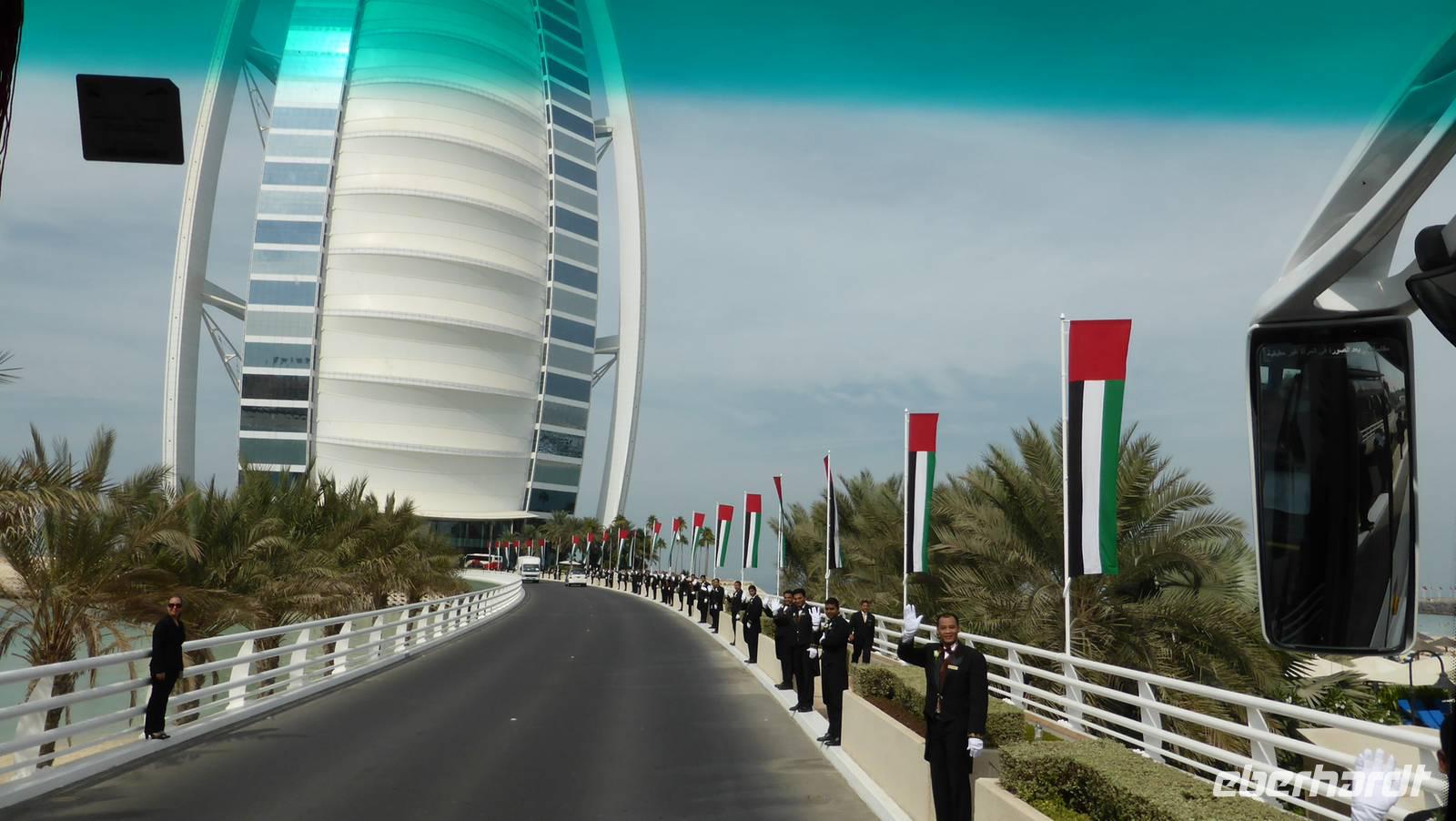 Die ganze Gruppe leistet sich heute etwas ganz Besonderes - ein Mittagessen im so viel gerühmten Burj Al Arab. Jenes Hotel, welches sich zum weltweit einzigen 7-Sterne Hotel erklärt hat. Vor 15 Jahren wurde es fertiggestellt und machte Dubai auf einen Schlag bekannt in der Welt. Es hat die Form eines Segels und befindet sich neben dem wellenförmigen Schwesterhotel Jumairah Beach Hotel. Die besondere Herausforderung beim Bau des Burj Al Arab bestand darin, dass es ins Meer gebaut wurde - „auf Land bauen kann jeder" so hieß es. Das Ergebnis war damals das mit 321 Meter weltweit höchste Hotel, heute gerade noch unter den Top 10, allein in Dubai sind inzwischen mehrere Hotels mit noch größeren Höhen entstanden.
