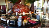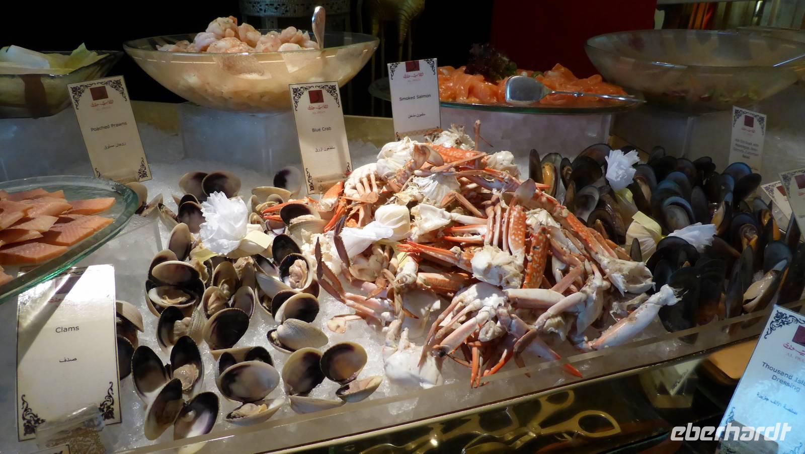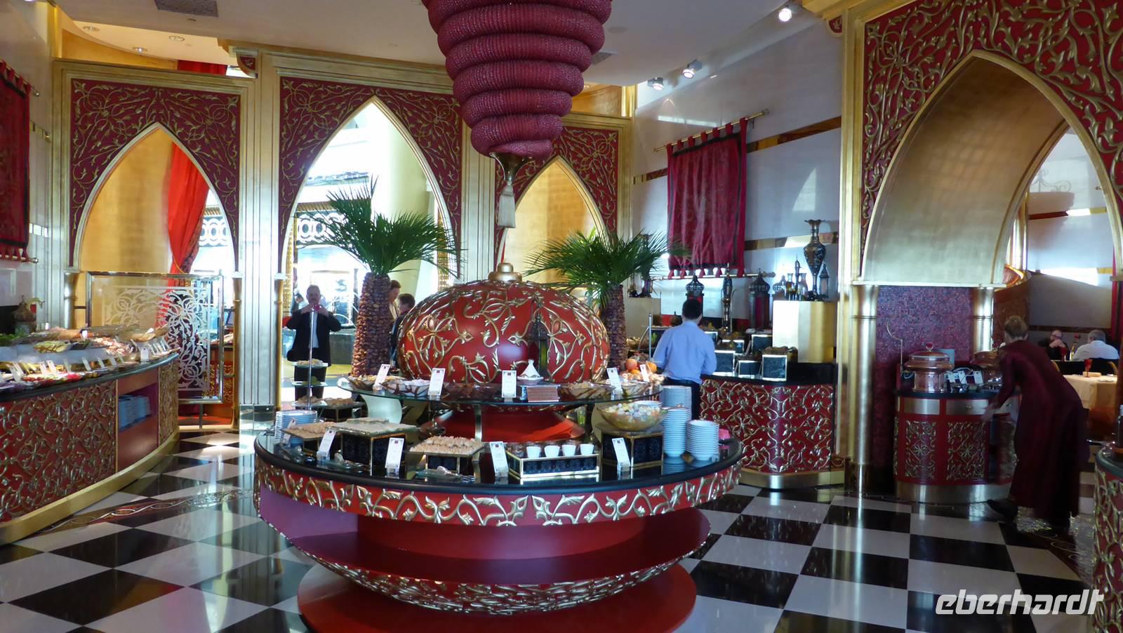 Und nun ist es soweit: der Schlagbaum öffnet sich und das Personal steht winkend Spalier bei der Vorfahrt ans Burj Al Arab. Unsere Fotoapparate sind im Dauerbetrieb, bis wir im ersten Obergeschoss im Restaurant „Al Iwan" platziert werden. Für zwei Stunden können wir all die Leckereien des Buffets genießen, müssen bei der riesigen Auswahl aber Prioritäten setzen. Dürfen es vielleicht Meeresfrüchte sein, arabische oder indische Gerichte, Halwa (Süßigkeit) a la Marokko, Kamelmilchpudding mit Rosenwasser und ein gutes Glas Wein dazu (ohne an die am Ende üppige Getränkerechnung zu denken)?