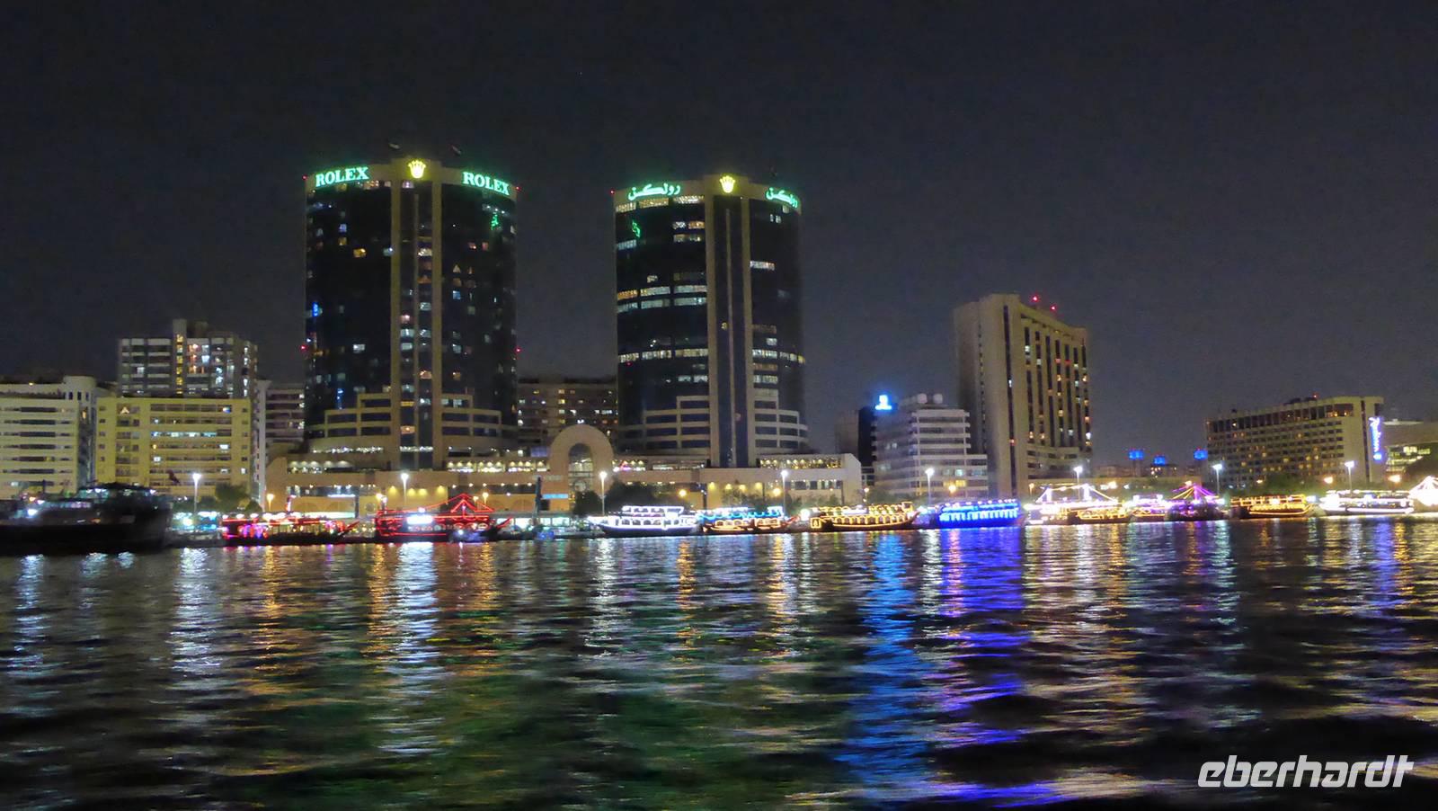 Andere erkunden Dubai mit der Metro, bummeln durch die Malls, wie Ibn Batuta, Mall oft he Emirates und Dubai Mall oder besuchen den Wassererlebnispark am Atlantis Hotel auf Palm Jumairah. Ich selbst spaziere am Nachmittag noch mal zum Creek, schaue mir im Abendlicht das geschäftige Treiben auf dem Wasser an und mache letzte Fotos von knatternden Wassertaxis, den Abras, welche Touristen, Händler und Bewohner zwischen Deira und Bur Dubai transportieren.