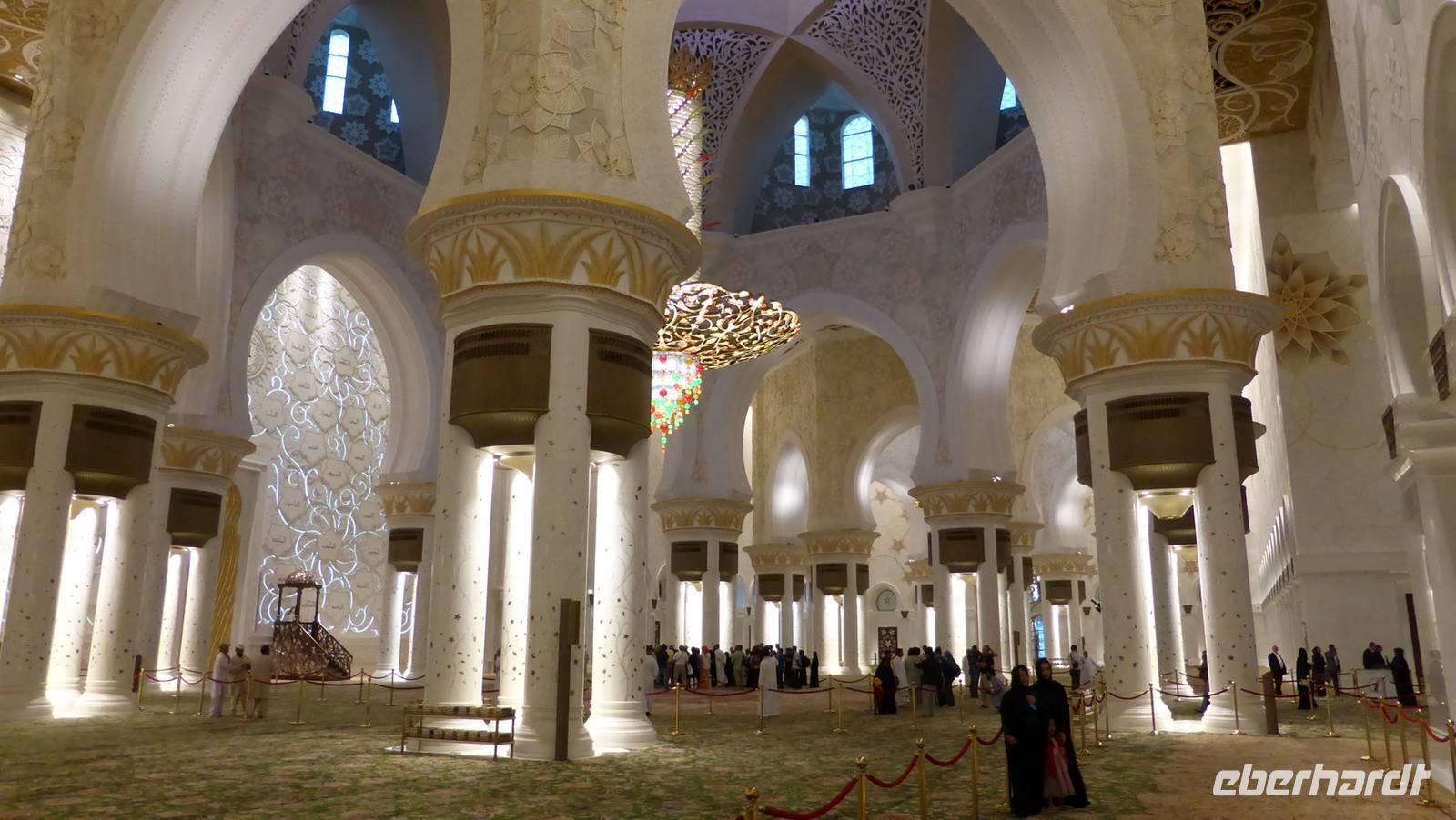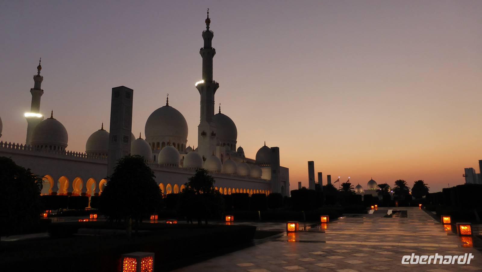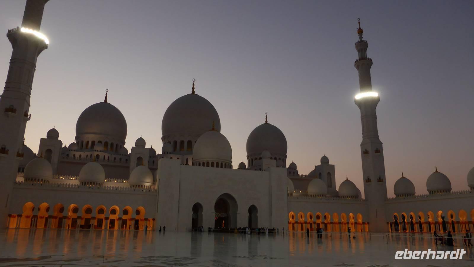 In der Shaikh Zayed Moschee, der weltweit größten Moschee außerhalb der heiligen Stätten von Mekka und Medina, machen wir uns mit dem Islam näher vertraut. Hier haben etwa 40.000 Muslime Platz. Die im weißen Marmor schimmernde Freitagsmoschee mit seinen 82 Kuppeln nenne ich gern auch den „Taj Mahal Arabiens". Wir besichtigen diesen Prachtbau, bis die Abenddämmerung für eine ganz besondere Stimmung sorgt und der Muezzin zum Abendgebet ruft. Zeit für uns, die Rückfahrt nach Dubai anzutreten.