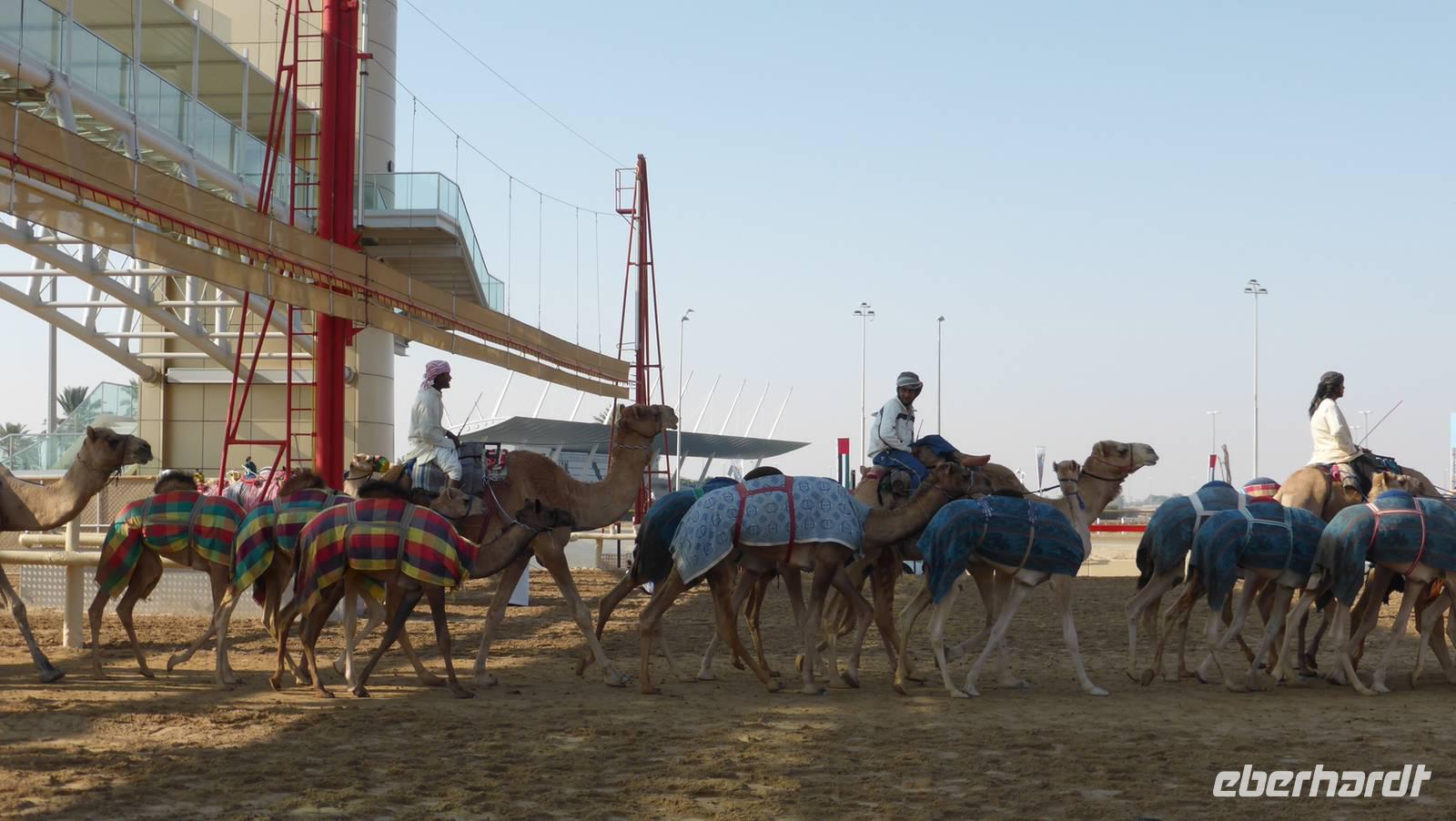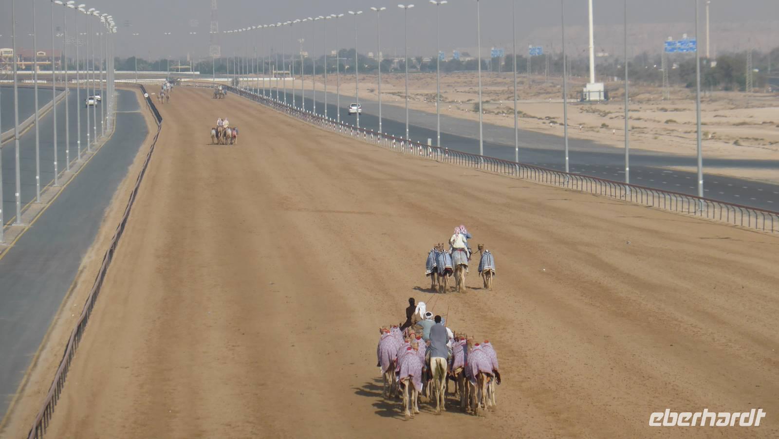 Am Rande Dubais, hinter den Wolkenkratzern führt unsere Fahrt vorbei am Mangrovengebiet. Hier endet der etwa 11 Kilometer lange Creek. Zwischen den Mangroven sind zahlreiche Flamingos heimisch. Ein paar Kilometer weiter beobachten wir , wie Rennkamele auf den Wüstenpisten trainiert werden. An der Kamelrennstrecke Dubais sehen wir die Tiere samt ihren elektronischen Jockeys ganz aus der Nähe.