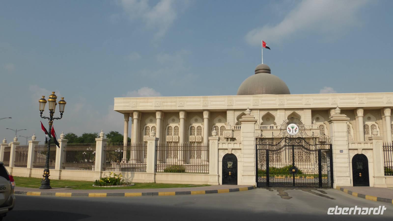 Entlang der Ostküste wechseln wir zwischen den Emiraten Sharjah und Fujairah, leicht zu unterscheiden, da sich Sharjah durch gepflegte Grünanlagen und seinem eigenen Baustil von Fujairah abhebt. So gilt unser nächster Halt auch dem Emirat Sharjah mit dem Küstenort Khor Fakkan. Es liegt an einer 5 Kilometer langen Bucht, mit schönem Strandpark, dem Oceanic Hotel sowie dem Containerhafen. Damit ist Sharjah das einzige Emirat, welches sowohl am Arabsichen Golf als auch am Indischen Ozean einen Hafen betreibt. Auch dem Herrscher von Sharjah, H. H. (His Highness) Dr. Al Quasimi gefällt diese Bucht und so hat er sich auf einem Hügel einen kleinen Palast bauen lassen.
