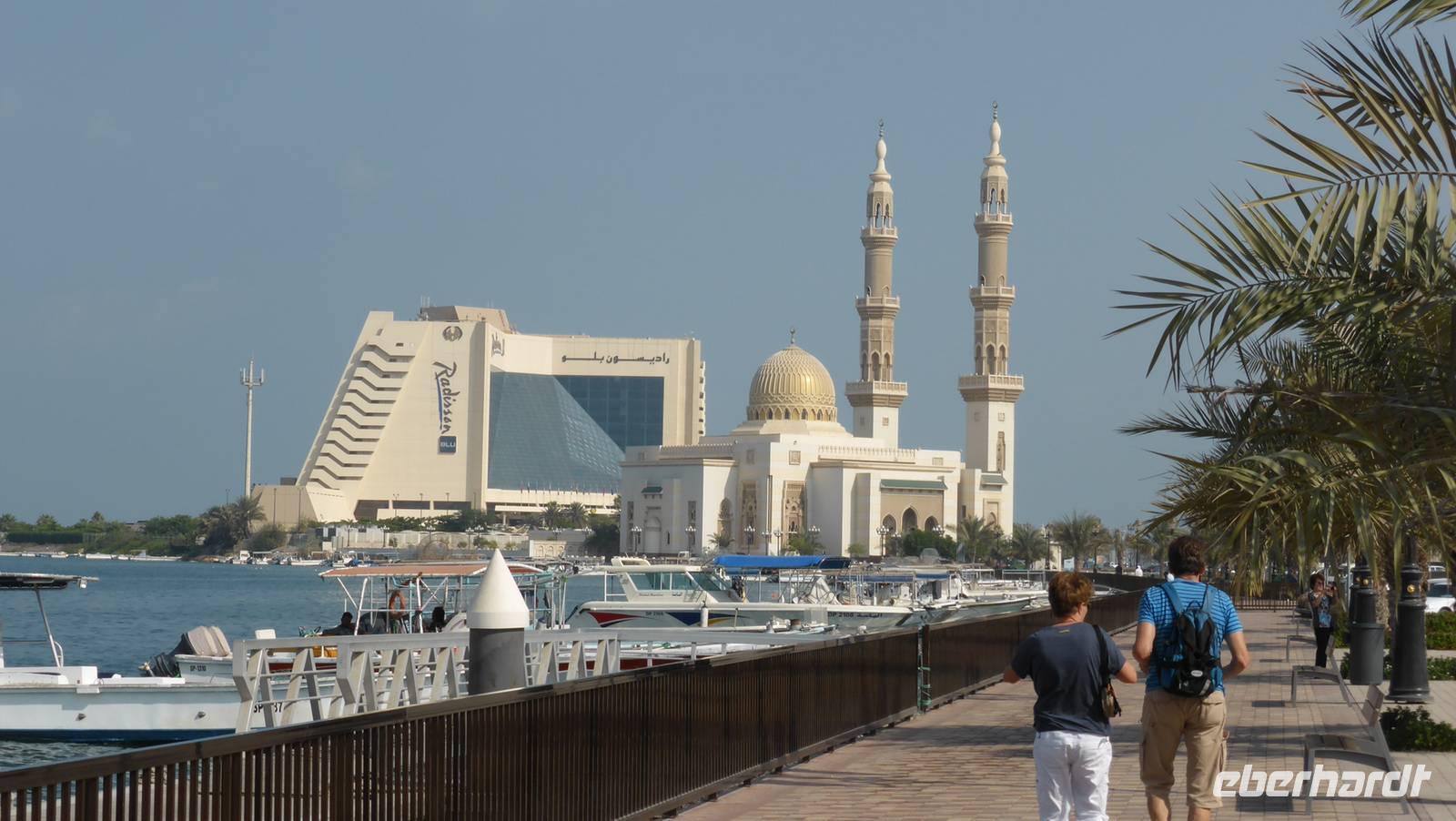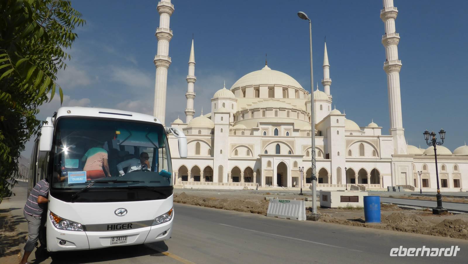 Ein Stück weiter tauchen auf einem Bergrücken zwei Wachtürme auf, die portugiesische Seefahrer im 16. Jahrhundert errichtet haben. An ihrem Fuße besichtigen wir die kleinste Moschee der VAE, welche mit einem Alter von mehr als 550 Jahren auch gleichzeitig die älteste des Landes ist. Ihr gegenüber befindet sich in Strandnähe eine Plantage mit abgestorbenen und umgeknickten Dattelpalmen - Folge einer verheerenden Naturkatastrophe im Jahre 2007, als der Zyklon Gonu an der Küste des Golfes von Oman wütete und im Nachbarland Oman viele Todesopfer kostete.