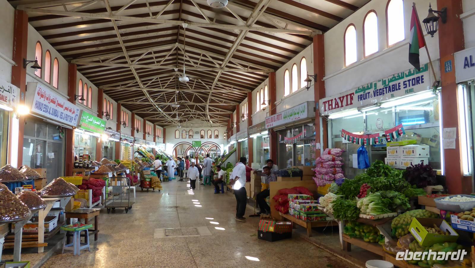 Im Anschluß folgt ein Bummel durch die Märkte Sharjahs: der alte Souk al Arsah, in dessen Lädchen teilweise Skurriles und Antikes angeboten wird, Obst- und Gemüsemarkt sowie Fischmarkt, wo die Reiher auf dem Dach auf leichte Beute lauern.