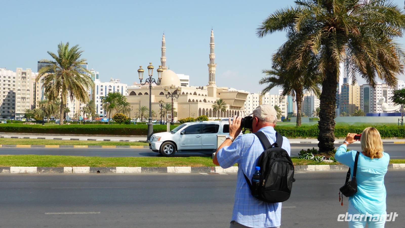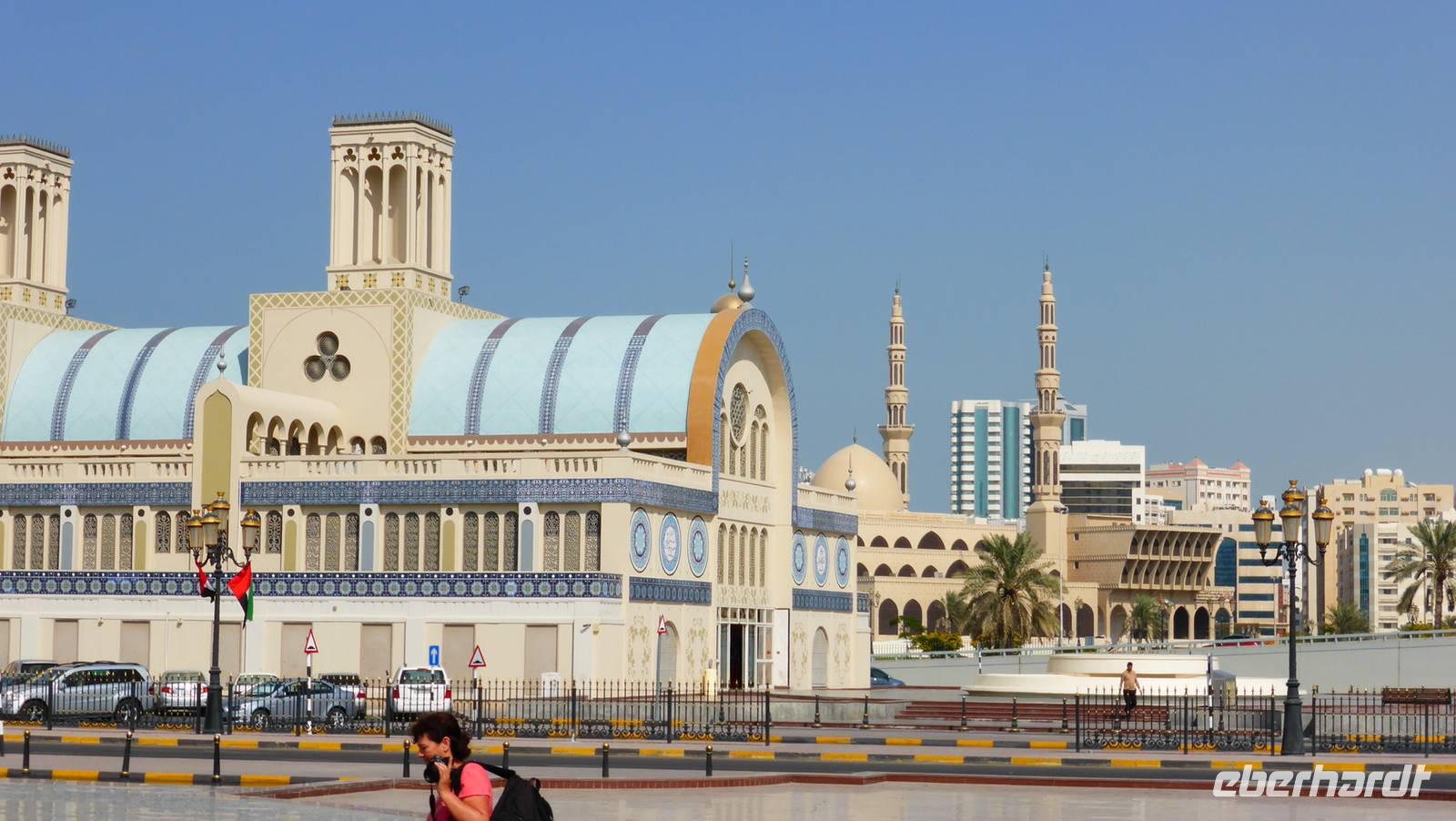 Unser Besuch in Sharjah endet im Zentralsouk (Blauer Souk) mit seinen charakteristischen Windtürmen. Von hier aus haben wir einen guten Blick auf die von Saudi Arabien gesponserte King Faisal Moschee und den Unabhängigkeitsplatz mit Springbrunnen davor.