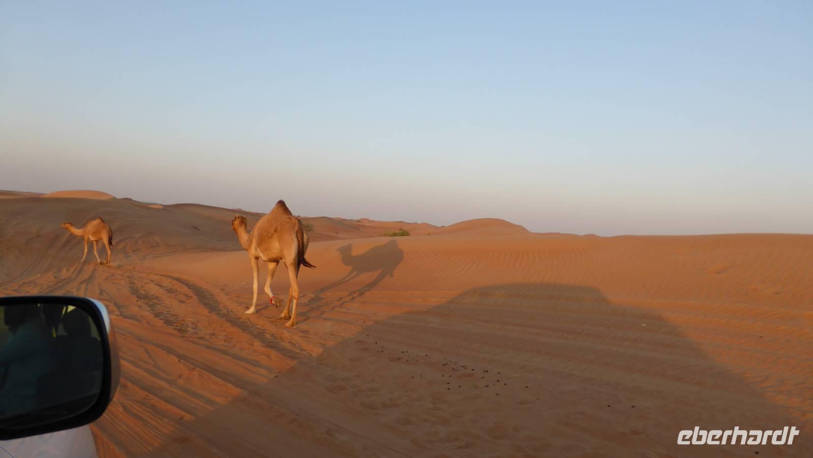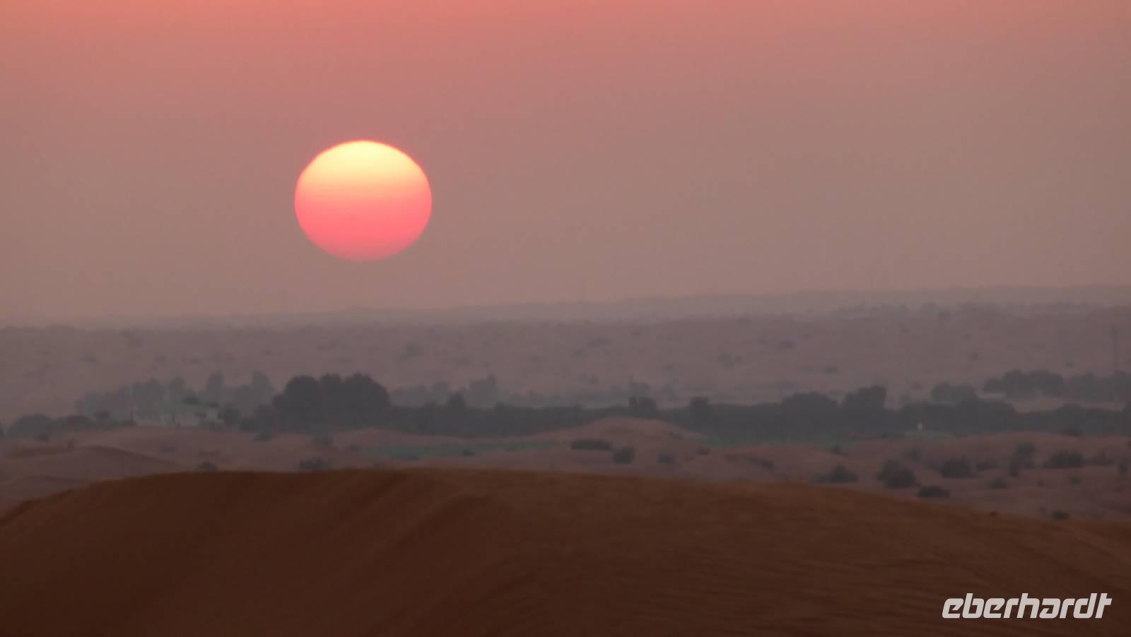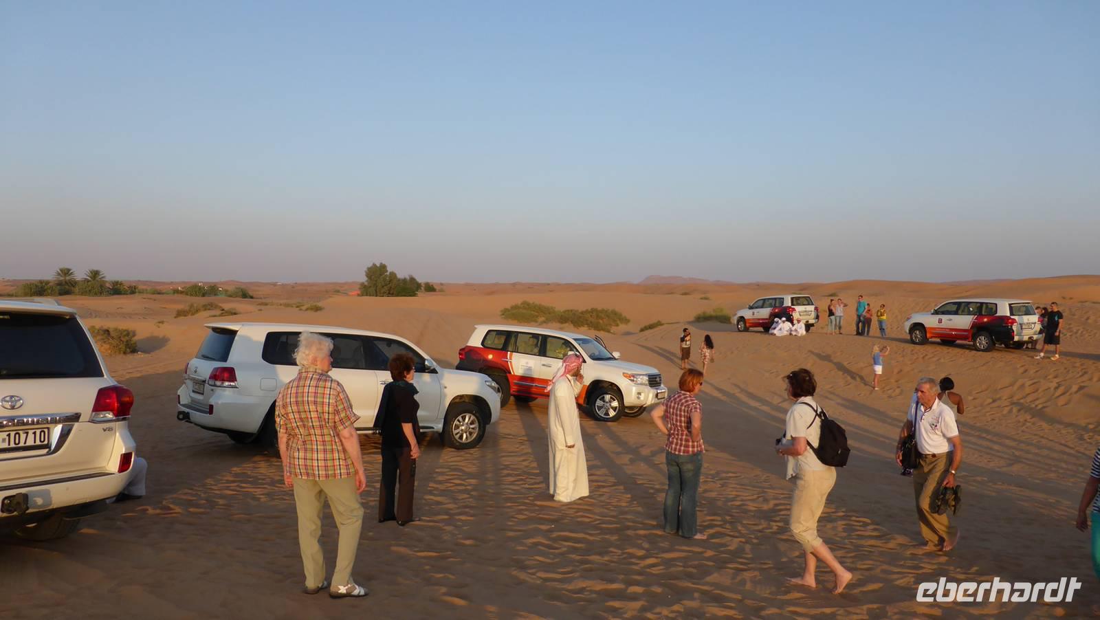 Inzwischen sind wir im großen Sandspielkasten Dubais angekommen, fahren zwischen und auf den rotbraunen Sanddünen und suchen uns schließlich ein Plätzchen auf einer Düne, um den Sonnenuntergang zu verfolgen. In einem Dünental ist für uns und weitere Gäste im Stile eines Beduinenlagers ein Barbecue vorbereitet. Zum Abendprogramm gehören die Schischa (Wasserpfeife), Hennamalerei, Derwisch- und Bauchtanz. Alles Traditionen, welche aus der Levante kommen und durch arabische Immigranten in den multikulturellen Staat der VAE gebracht wurden.