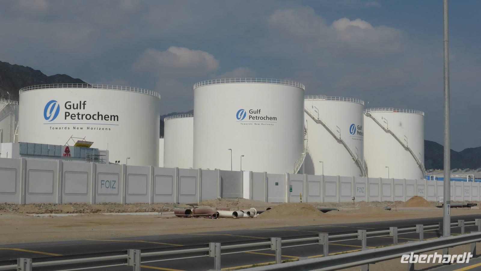 Bis Fujairah durchqueren wird das Hajar-Gebirge (Felsengebirge), eine kahle Bergwelt aus dunklem Gestein und nahezu ohne Vegetation. Aber schon bald erreichen wir Fujairah-Stadt, von Weitem an seinen Wolkenkratzern zu erkennen. Ganz aus der Nähe können wir uns davon überzeugen, das Fujairah, ohne selbst Erdölvorkommen zu besitzen, im großen Stile mit am Ölgeschäft verdient. Denn hier stehen Dutzende von gewaltigen Erdöltanks, Erdöl, welches per Pipeline aus Abu Dhabi kommt und hier an der Ostküste auf Tanker verladen wird. So müssen die Tanker nicht durch das Nadelöhr "Straße von Hormuz" und sparen damit Zeit und Geld.