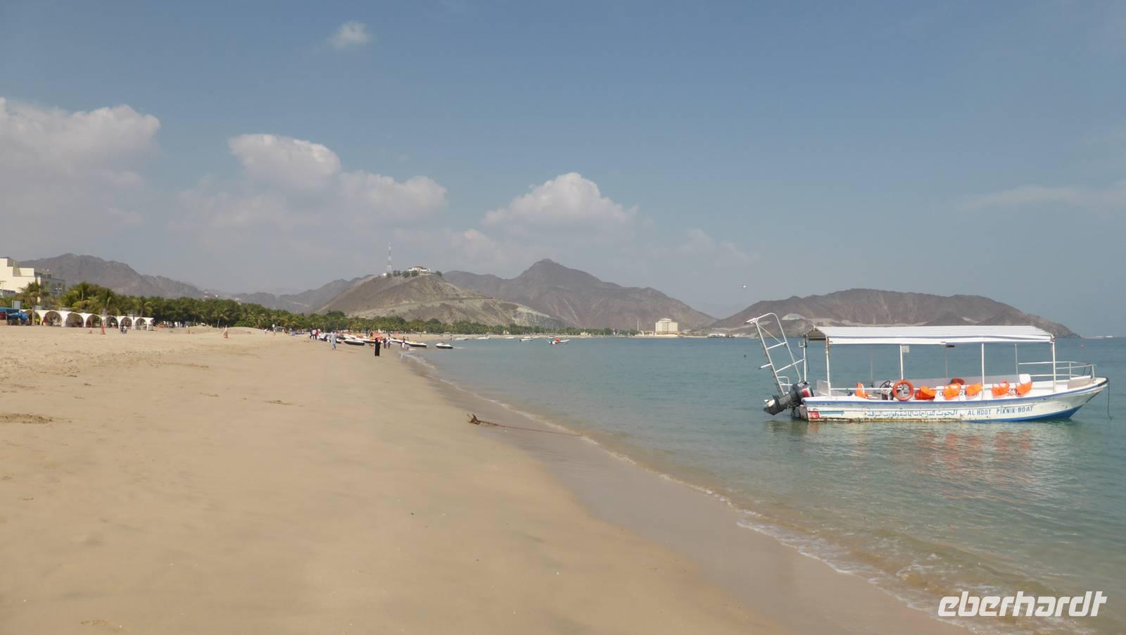 Bis zum Nachmittag genießen wir die Annehmlichkeiten des Sandy Beach Hotels. Bei sehr angenehmen Wassertemperaturen von ca. 30 Grad lässt es sich im klaren Wasser des Golf von Oman aushalten.