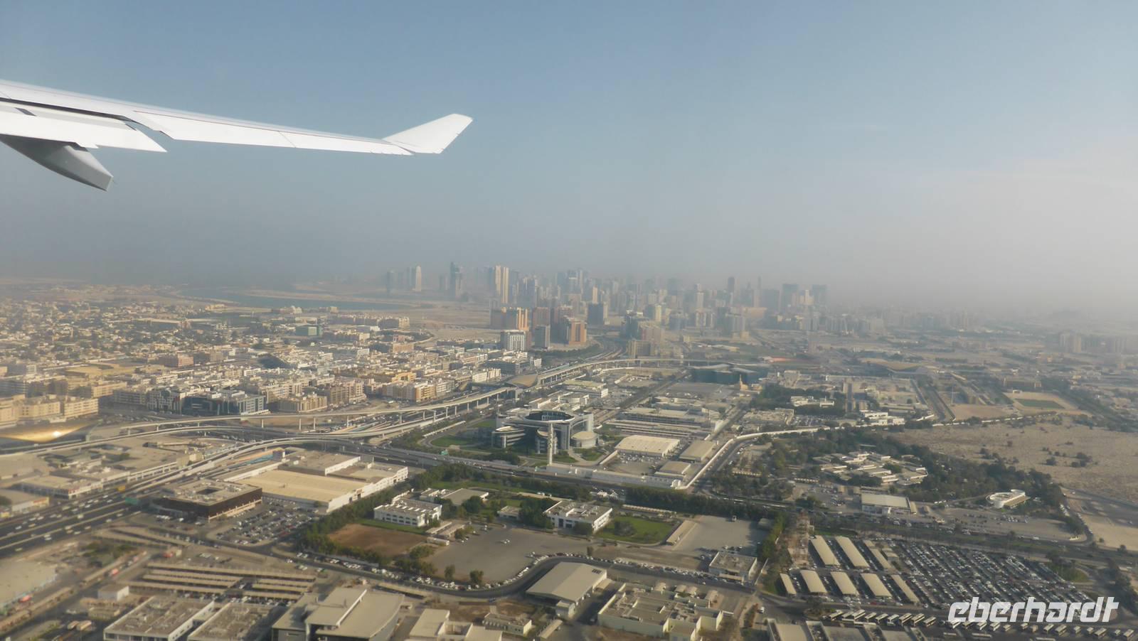 Via München fliegen wir mit einem Airbus A 340 in fünf ein halb Stunden durch die Nacht nach Dubai. Der Morgen in Dubai empfängt uns mit Sonne und sommerlichen Temperaturen. Wir legen Sommerkleidung an, stärken uns beim Frühstück im Arabian Courtyard Hotel und starten dann zu unserer ersten Tour durch Dubai.