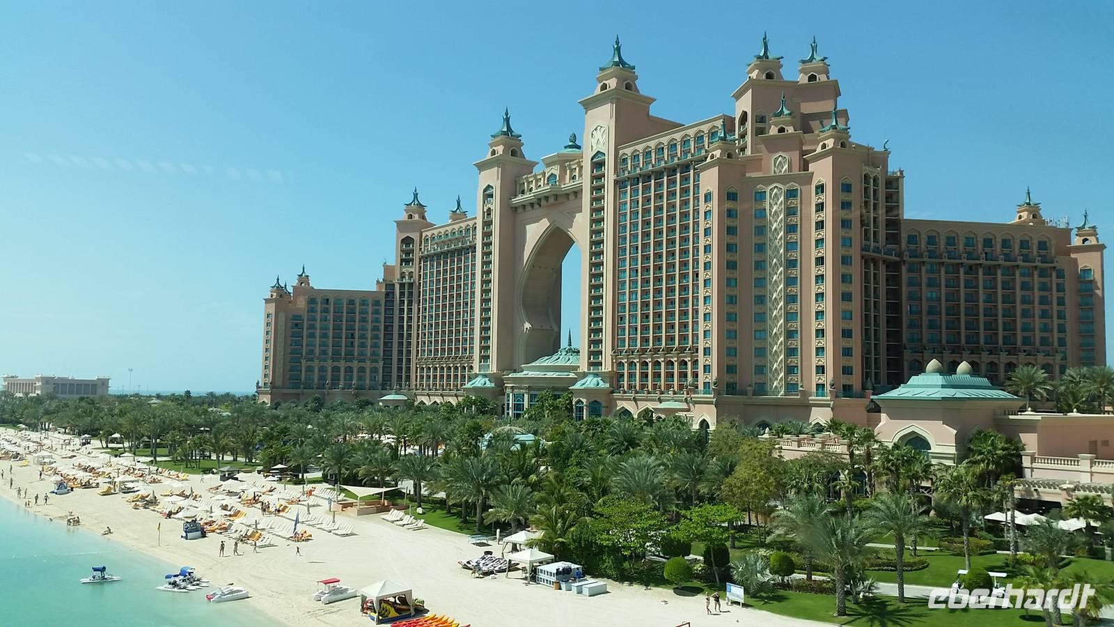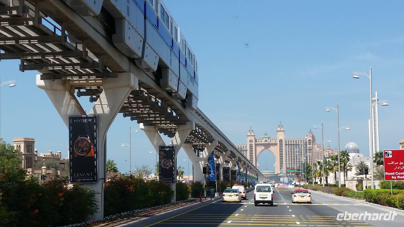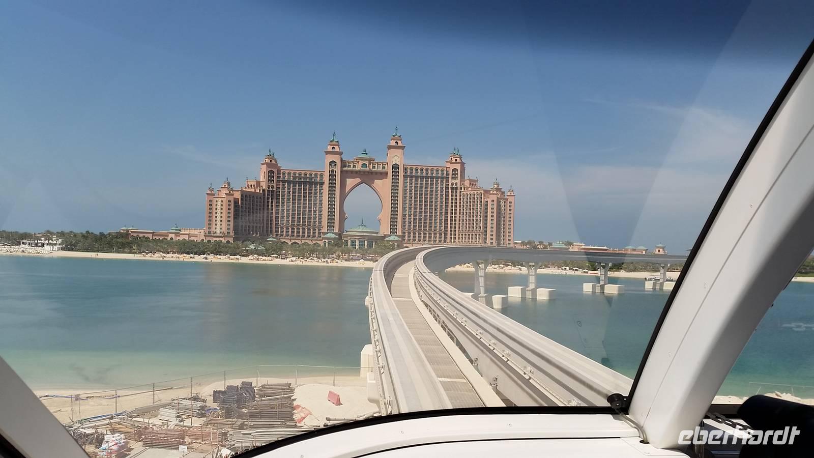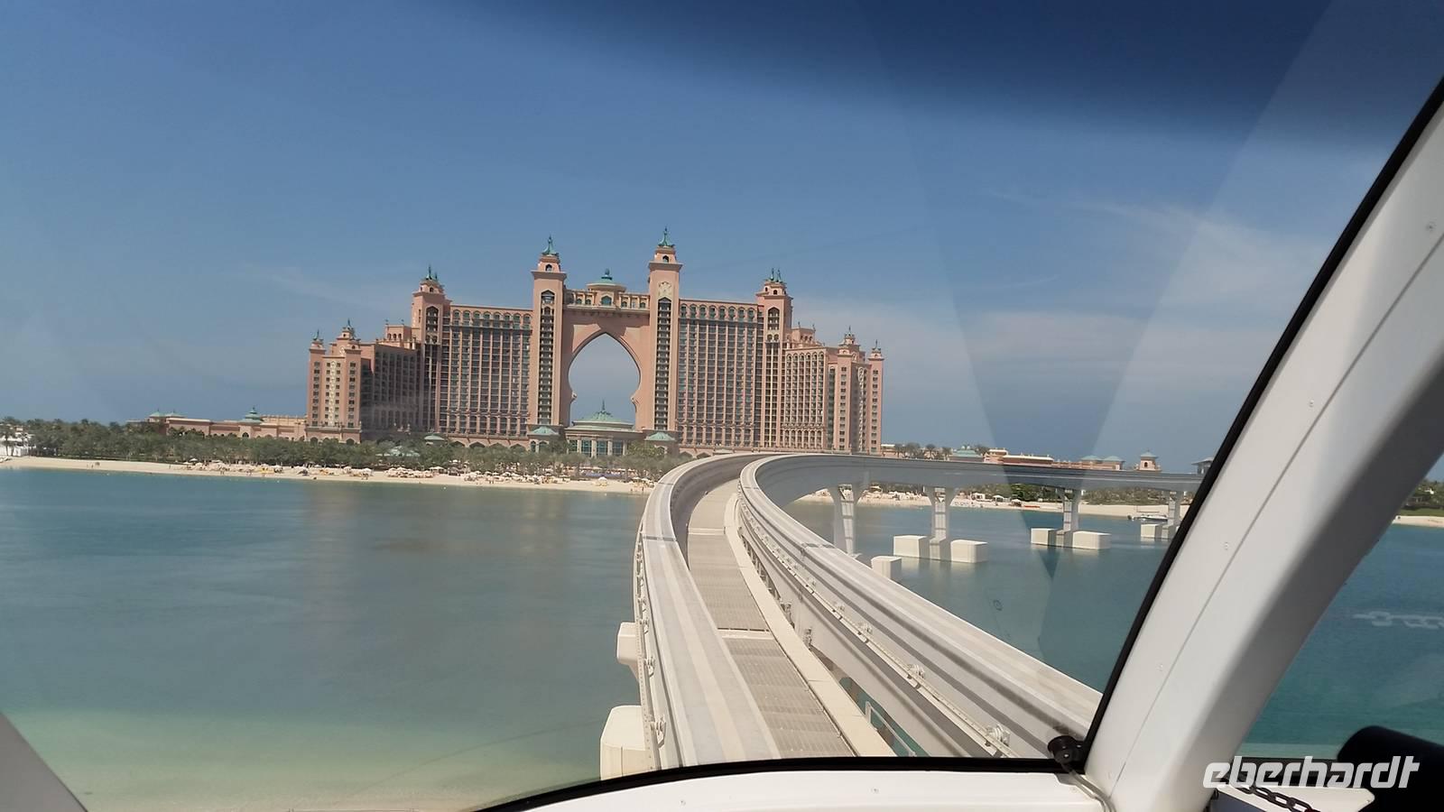 Wir fuhren weiter zum „modernen Dubai" , wo wir am 5-Sterne-Luxushotel „Atlantis" an der Spitze der Palm Jumeirah anhielten. Zwischen 2001 und 2006 wurden die Palmen Inseln gebaut, aber erst ab 2008 wurden Sie offiziell eröffnet, gemeinsam mit dem Atlantis Hotel. Hier an der Spitze, wo vor wenigen Jahren ausschließlich Wasser war, hatte Eberhart Travel eine Überraschung organisiert. Um schöne Fotos zu machen und die Palmenform genauer zu erkennen, fuhren wir mit der Monorail vom Atlantis zurück zur Stadt.
