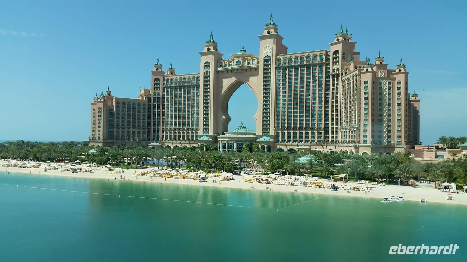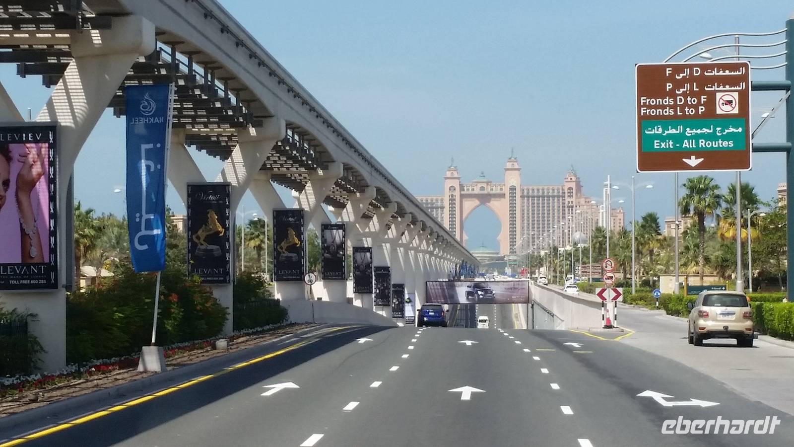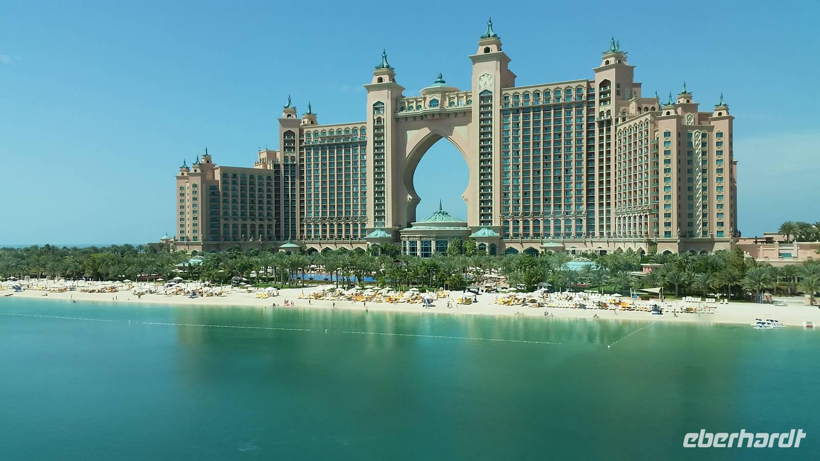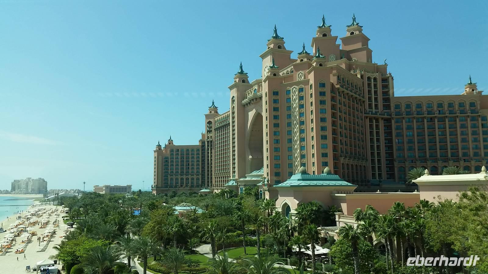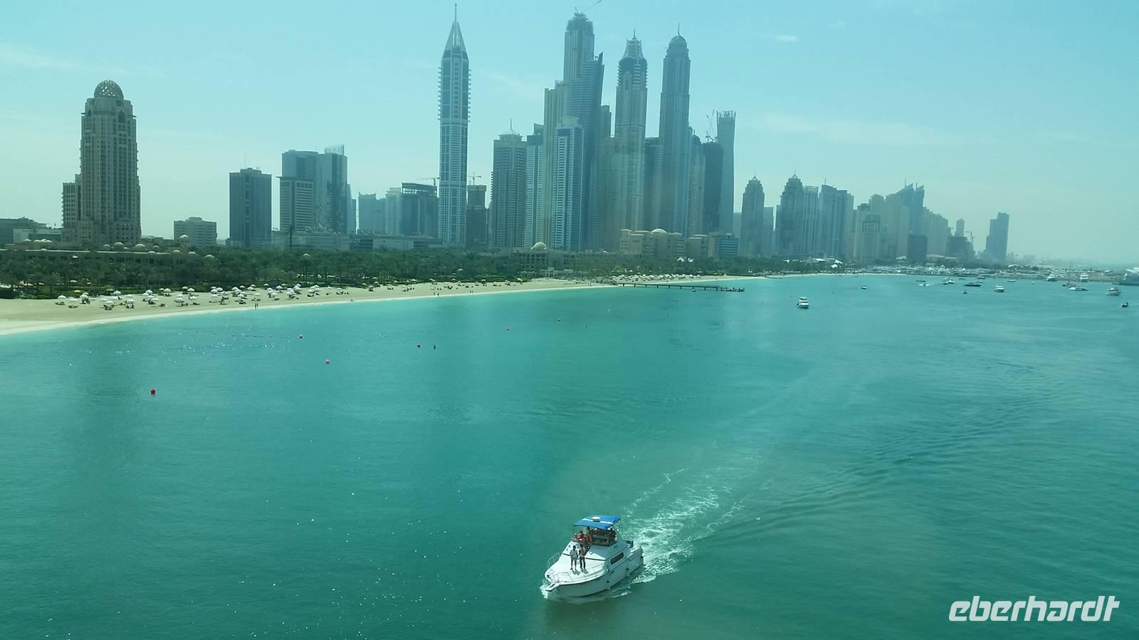 Wir fuhren weiter zum „modernen Dubai" , wo wir am 5-Sterne-Luxushotel „Atlantis" an der Spitze der Palm Jumeirah anhielten. Zwischen 2001 und 2006 wurden die Palmen Inseln gebaut, aber erst ab 2008 wurden Sie offiziell eröffnet, gemeinsam mit dem Atlantis Hotel. Hier an der Spitze, wo vor wenigen Jahren ausschließlich Wasser war, hatte Eberhart Travel eine Überraschung organisiert. Um schöne Fotos zu machen und die Palmenform genauer zu erkennen, fuhren wir mit der Monorail vom Atlantis zurück zur Stadt.