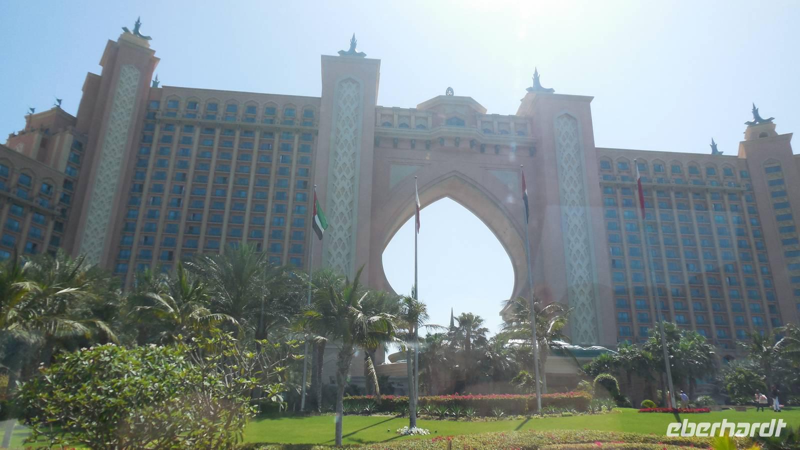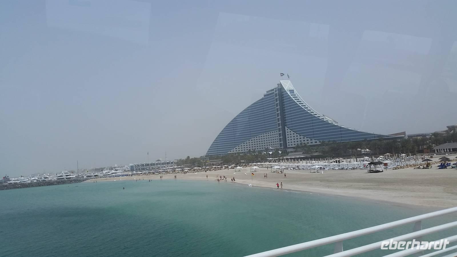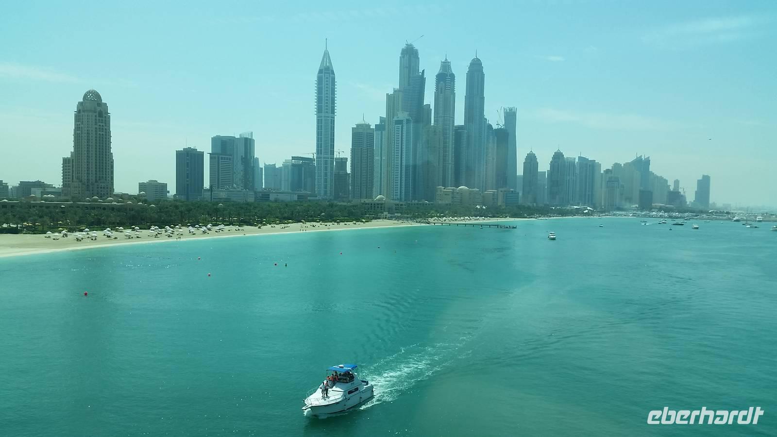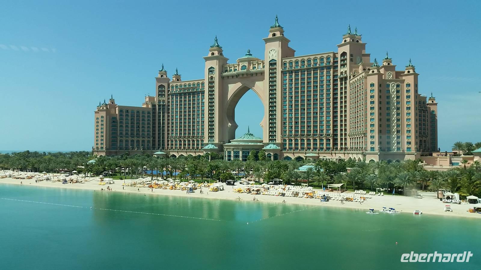 Wir fuhren weiter zum „modernen Dubai" , wo wir am 5-Sterne-Luxushotel „Atlantis" an der Spitze der Palm Jumeirah anhielten. Zwischen 2001 und 2006 wurden die Palmen Inseln gebaut, aber erst ab 2008 wurden Sie offiziell eröffnet, gemeinsam mit dem Atlantis Hotel. Hier an der Spitze, wo vor wenigen Jahren ausschließlich Wasser war, hatte Eberhart Travel eine Überraschung organisiert. Um schöne Fotos zu machen und die Palmenform genauer zu erkennen, fuhren wir mit der Monorail vom Atlantis zurück zur Stadt.