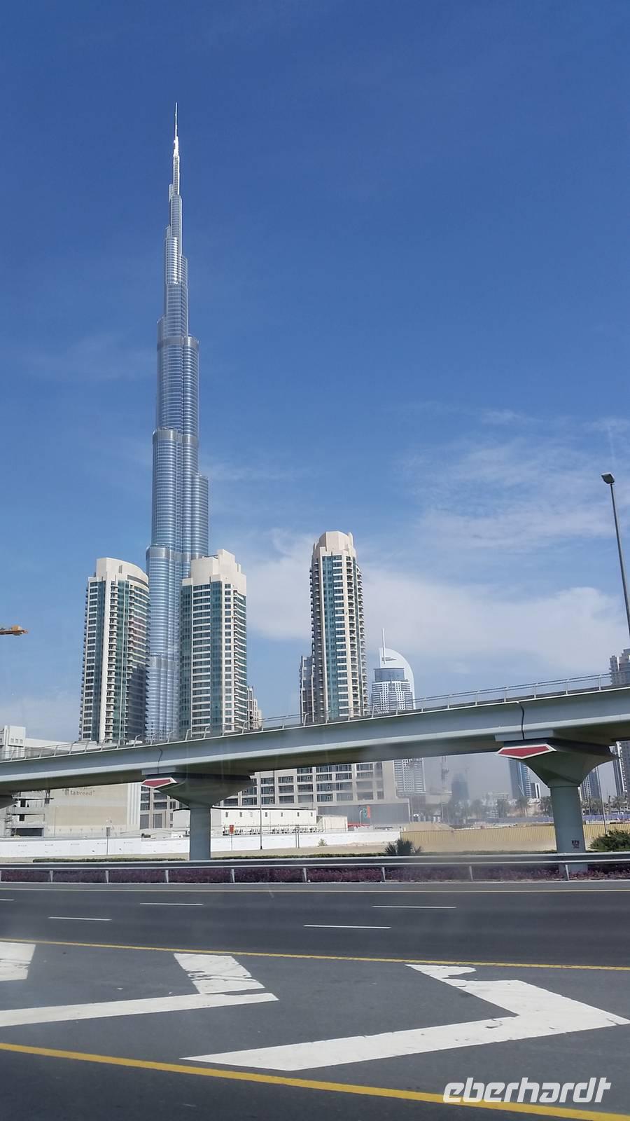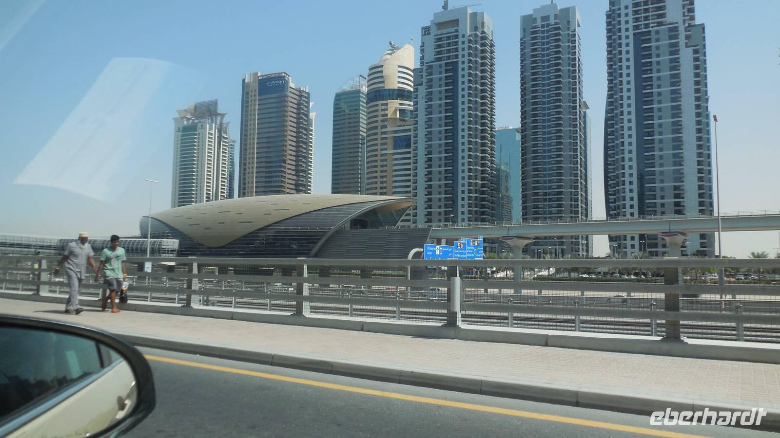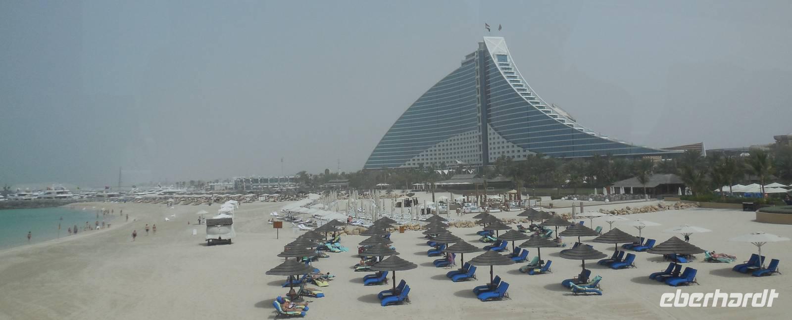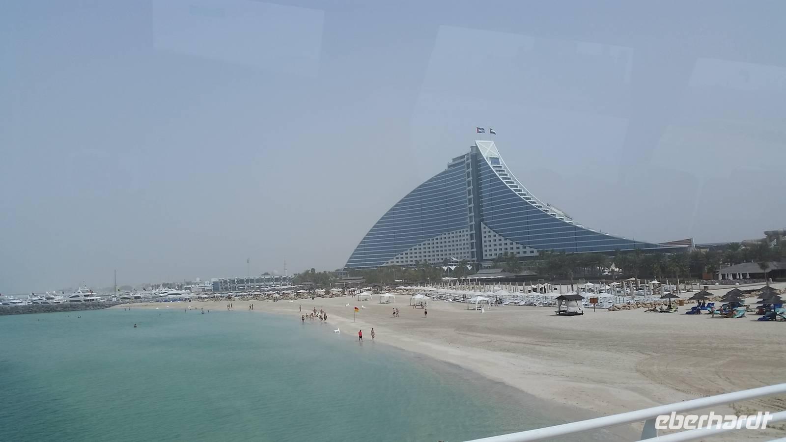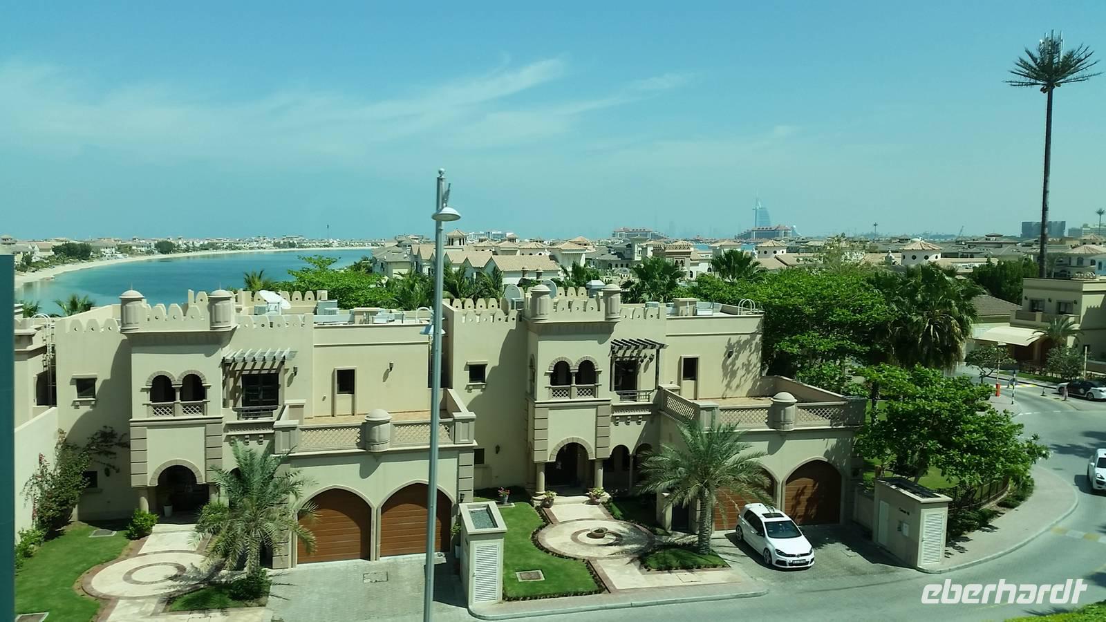 Wir fuhren weiter zum „modernen Dubai" , wo wir am 5-Sterne-Luxushotel „Atlantis" an der Spitze der Palm Jumeirah anhielten. Zwischen 2001 und 2006 wurden die Palmen Inseln gebaut, aber erst ab 2008 wurden Sie offiziell eröffnet, gemeinsam mit dem Atlantis Hotel. Hier an der Spitze, wo vor wenigen Jahren ausschließlich Wasser war, hatte Eberhart Travel eine Überraschung organisiert. Um schöne Fotos zu machen und die Palmenform genauer zu erkennen, fuhren wir mit der Monorail vom Atlantis zurück zur Stadt.