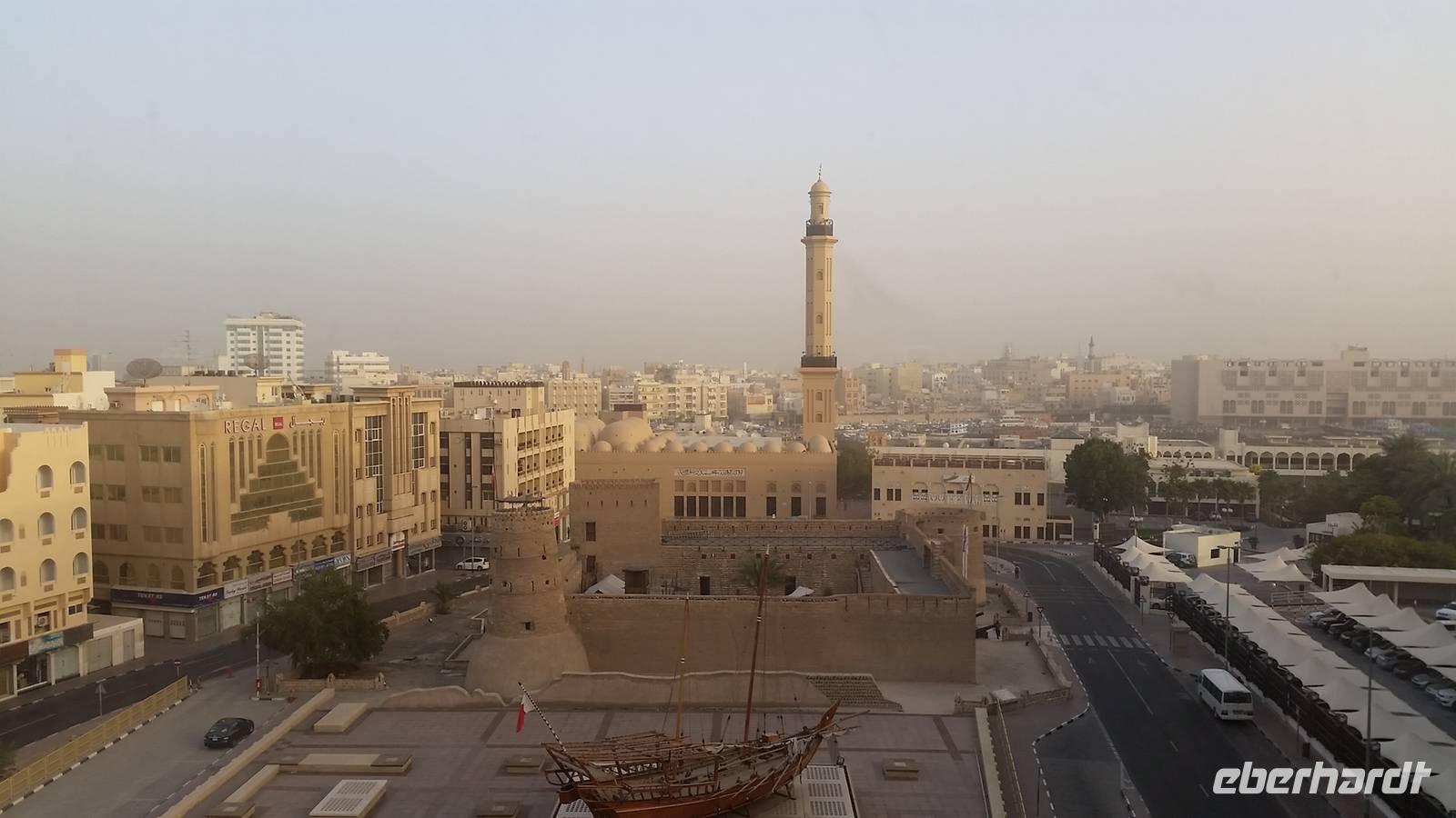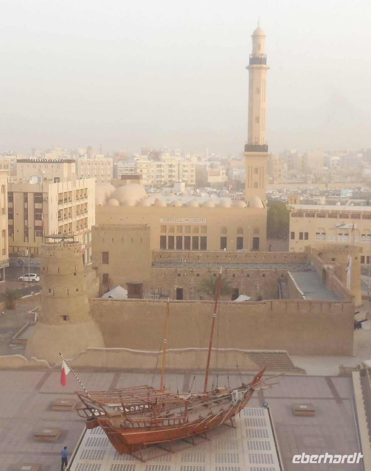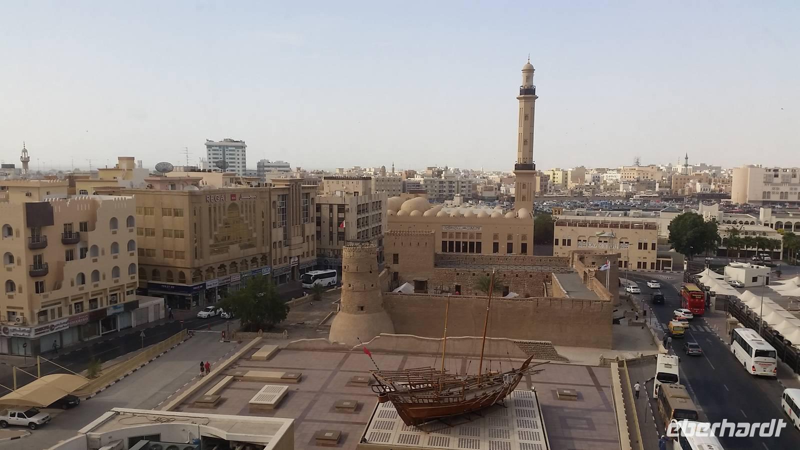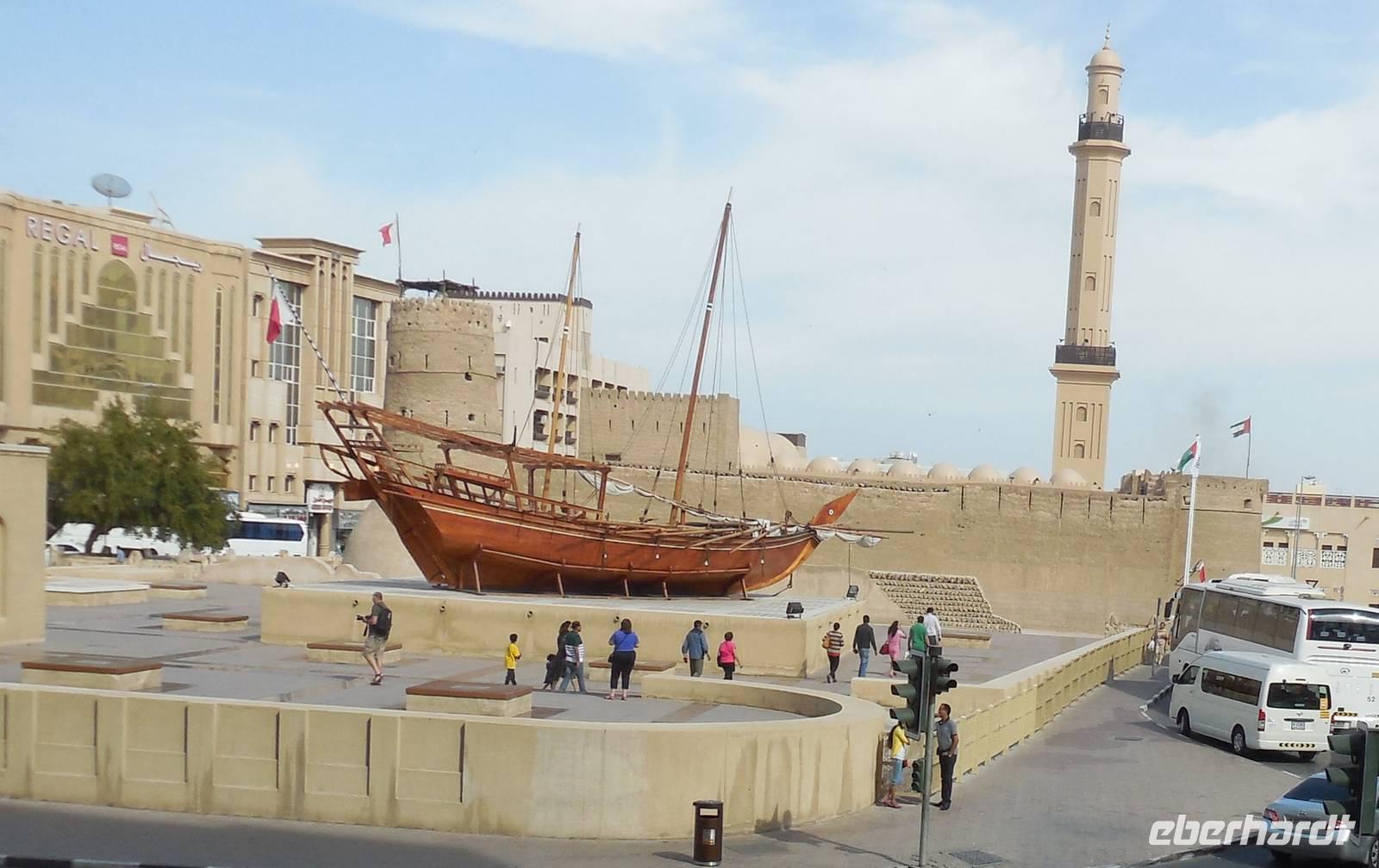 Anschließend nahmen wir wieder die kleinen Holz-Boote und fuhren zum Dubai Museum, welches sich genau gegenüber von unserem Hotel befand. Anja gab uns eine kurze Führung. Es gab einen sehr interessanten Film, der die Geschichte Dubais mit den früheren Lebensumständen und dem Leben in der Wüste veranschaulichte und weitere futuristische Projekte vorstellte.