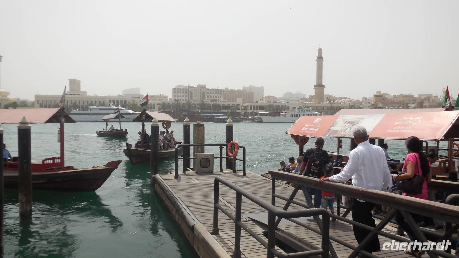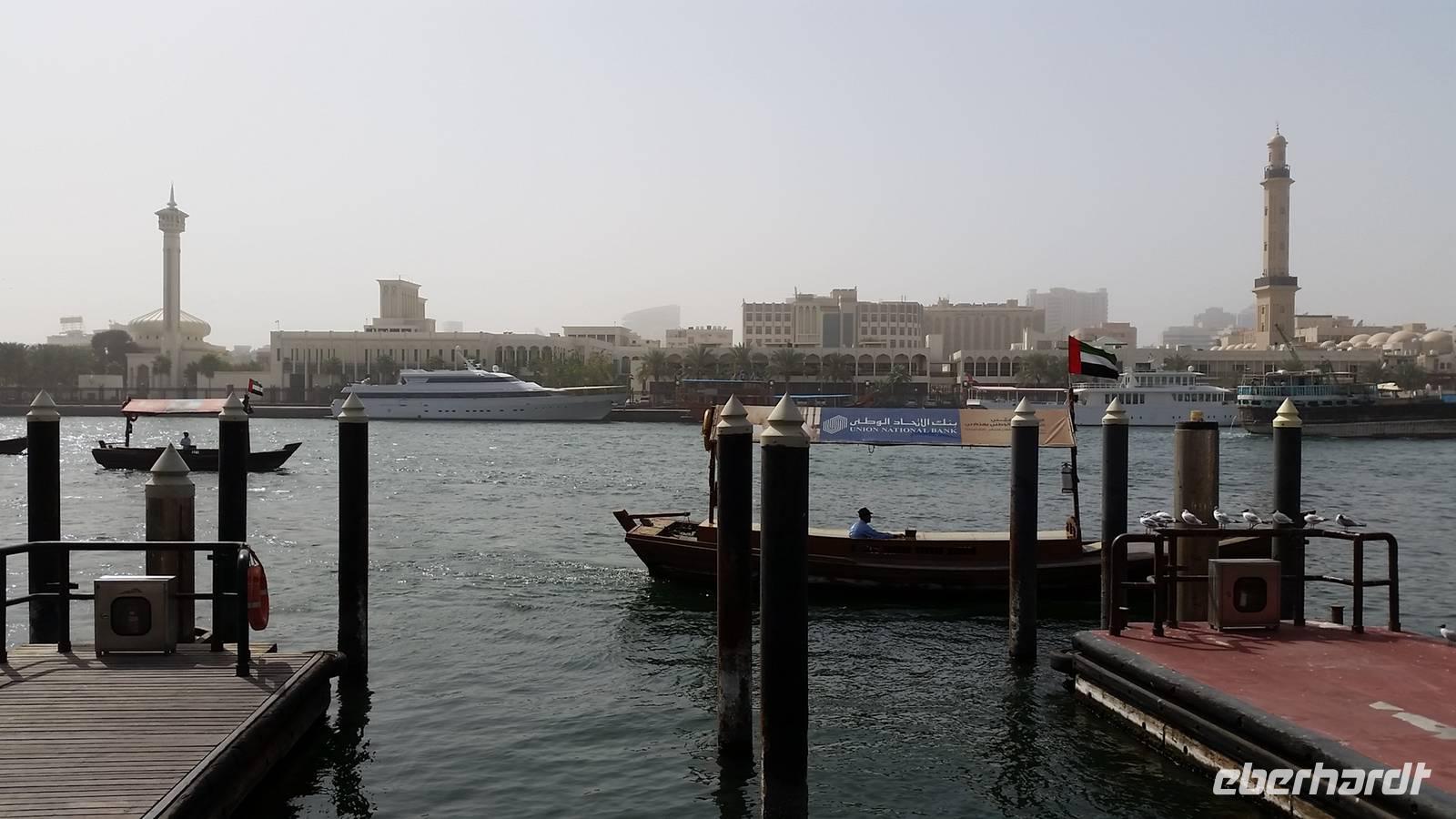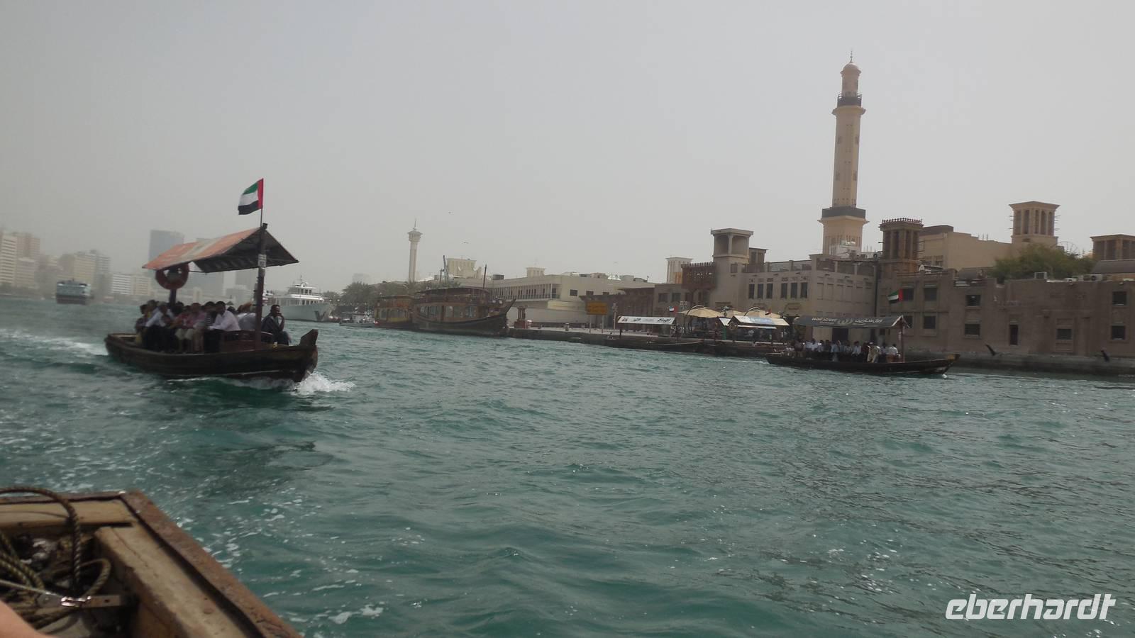 Heute könnten wir ausschlafen und in Ruhe frühstücken, da wir uns erst um 10.00 Uhr wieder trafen, um gemeinsam einen Stadtrundgang durch das altes Dubai zu unternehmen. Zuerst gingen wir zum Dubai Creek in Bur Dubai, wo wir ein kleines Boot oder Wassertaxi nahmen, um auf die andere Seite der Stadt zu gelangen. Das Creek ist ein natürlicher Meeresarm des Persischen Golfes, 14 Kilometer lang und hat eine Breite von 115 Metern an der Mündung, bis zu 1400 Metern an seinem Ende. Die Gründung und Entwicklung der Stadt Dubai ist auf die Existenz des Dubai Creeks zurückzuführen und hier war einst das Zentrum der Stadt und der wichtigste Hafen.