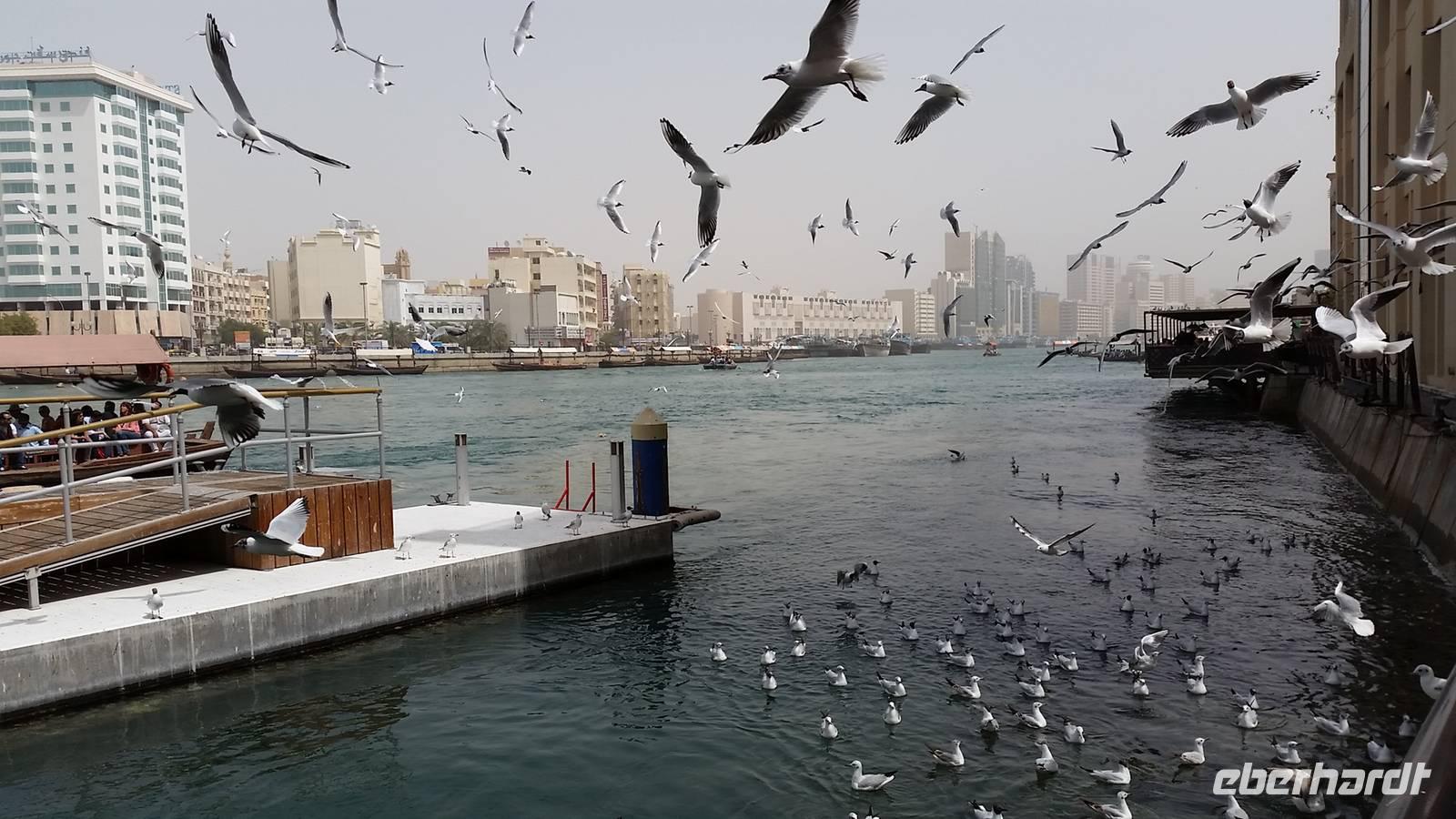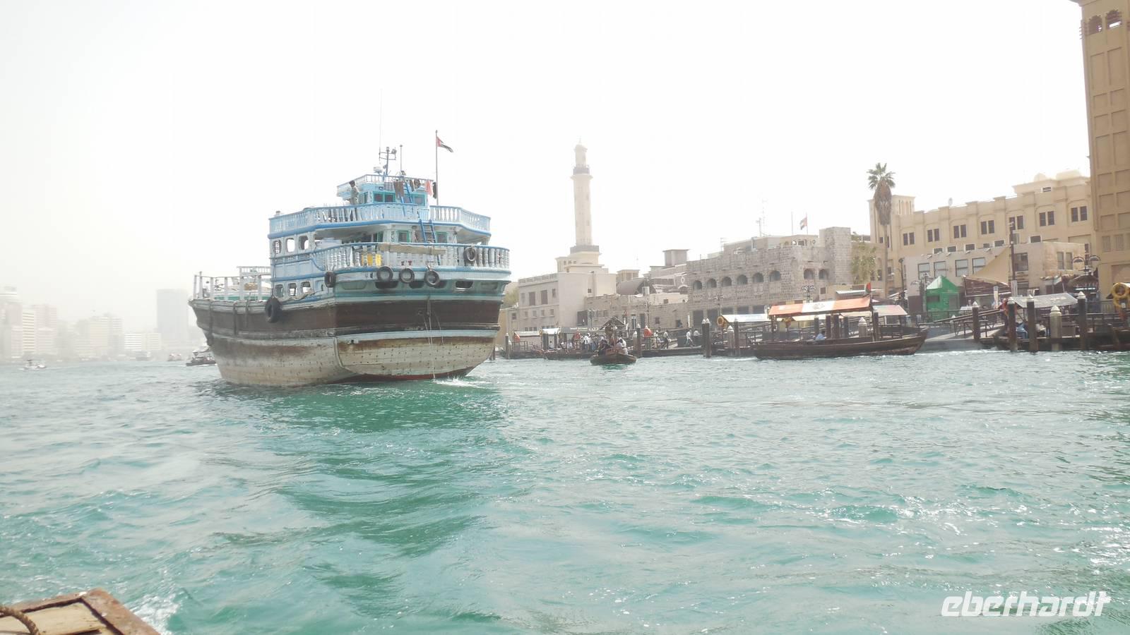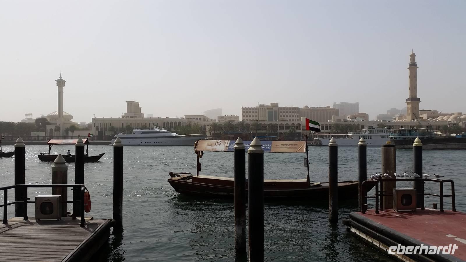 Heute könnten wir ausschlafen und in Ruhe frühstücken, da wir uns erst um 10.00 Uhr wieder trafen, um gemeinsam einen Stadtrundgang durch das altes Dubai zu unternehmen. Zuerst gingen wir zum Dubai Creek in Bur Dubai, wo wir ein kleines Boot oder Wassertaxi nahmen, um auf die andere Seite der Stadt zu gelangen. Das Creek ist ein natürlicher Meeresarm des Persischen Golfes, 14 Kilometer lang und hat eine Breite von 115 Metern an der Mündung, bis zu 1400 Metern an seinem Ende. Die Gründung und Entwicklung der Stadt Dubai ist auf die Existenz des Dubai Creeks zurückzuführen und hier war einst das Zentrum der Stadt und der wichtigste Hafen.