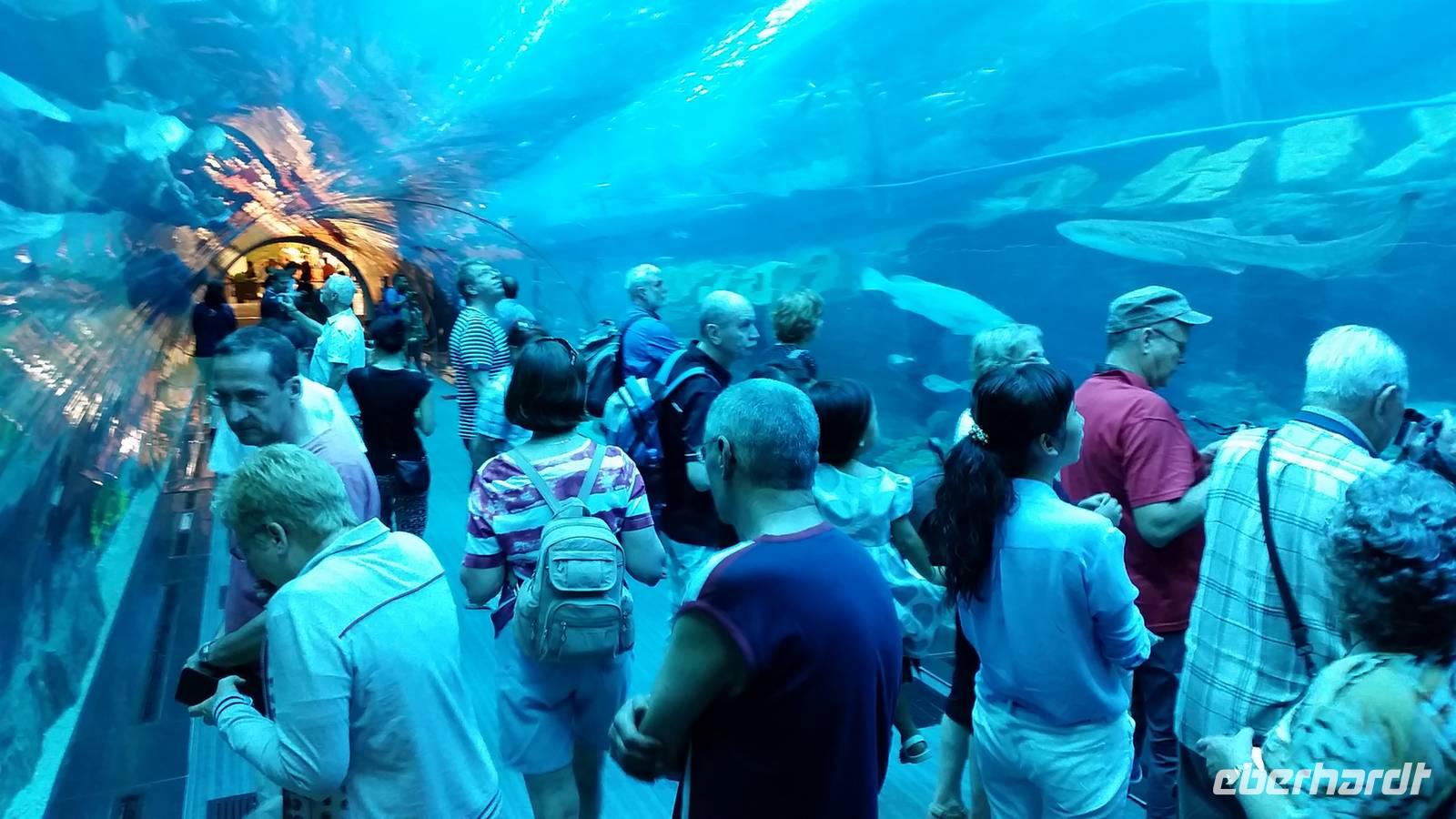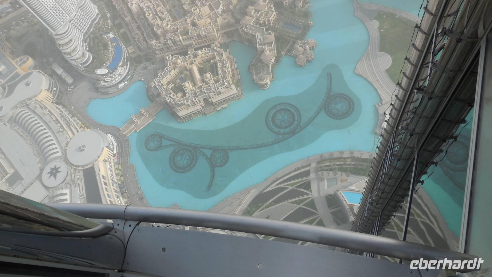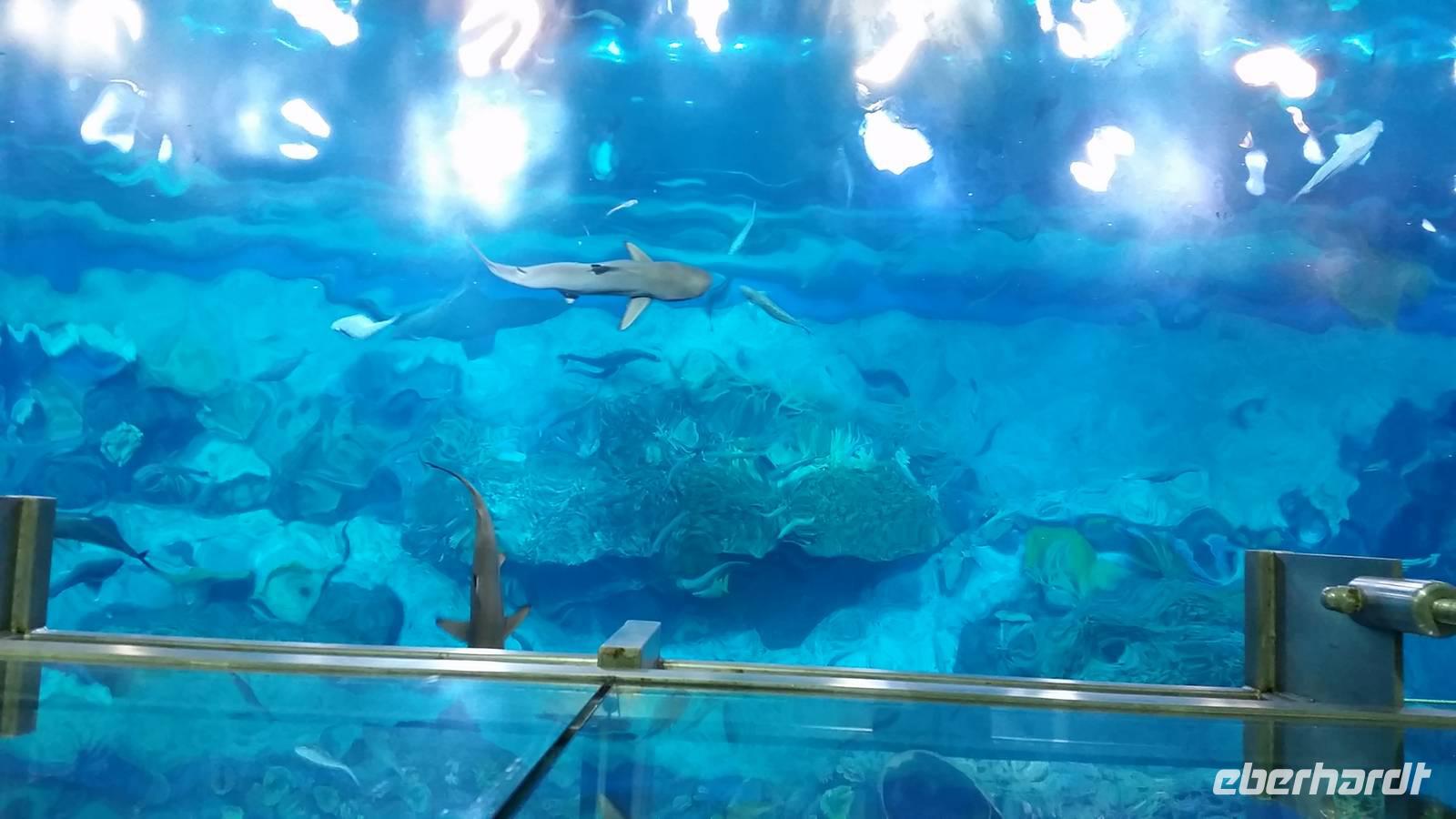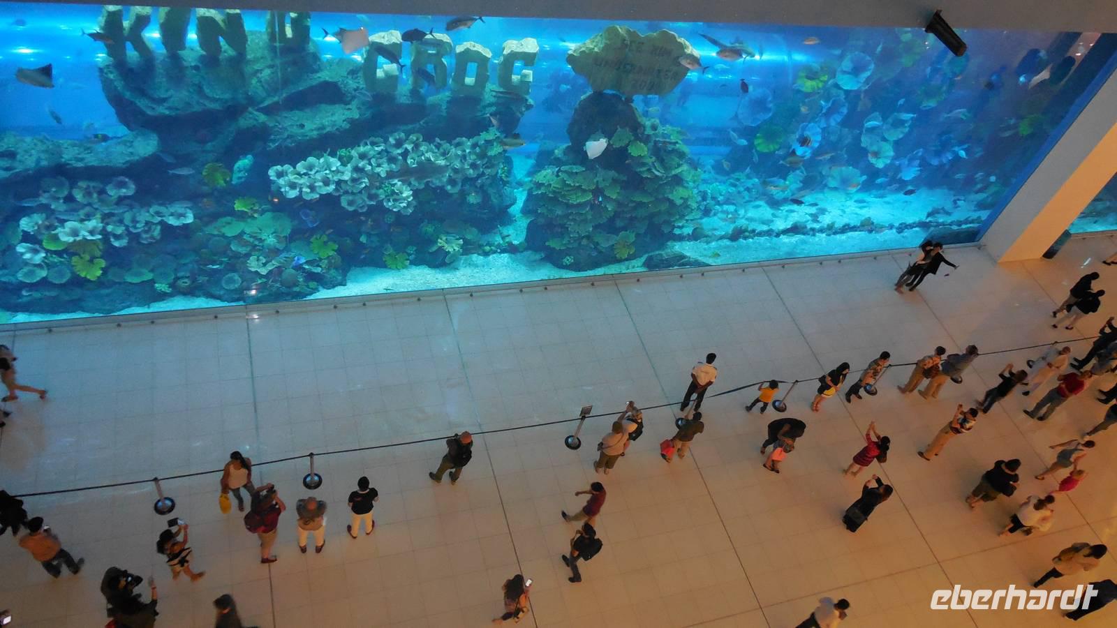 Nach einem kleiner Pause im Hotel fuhren wir zu einem der größten und legendären Einkaufszentren der Welt überhaupt: The Dubai Mall. Wahnsinn. Hier findet man alles und jede Firma der Welt, die etwas sein möchte, muss hier vertreten. Die Dubai Mall zählt bis 1.200 Geschäfte zieht jährlich ca. 37 Millionen Besucher an. Im Januar, wenn jeder mit Ermäßigungen und Rabatten wirbt, ist sie zum Beispiel 24 Stunden lang geöffnet. Das Einkaufszentrum verfügt über eine Gastronomieabteilung mit über 120 Restaurants, wo wir unsere Mittagspause verbrachten. Anschließend erkundeten wir das größte Aquarium der Welt, wo u.a. ein sehr großes Krokodil zu sehen war. Insgesamt findet man hier 33.000 Meerestiere! Natürlich spazierten wir auch durch den Tunnel des Aquariums, wo wir unter Haien und Rochen lang liefen. In dem aus 75 Zentimeter dickem Acrylglas bestehenden Becken befinden sich 10.000 Kubikmetern Seewasser, das man dem Persischen Golf entnimmt.